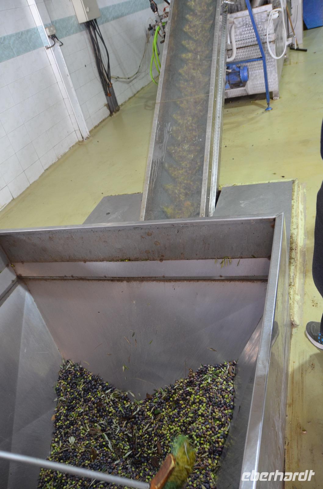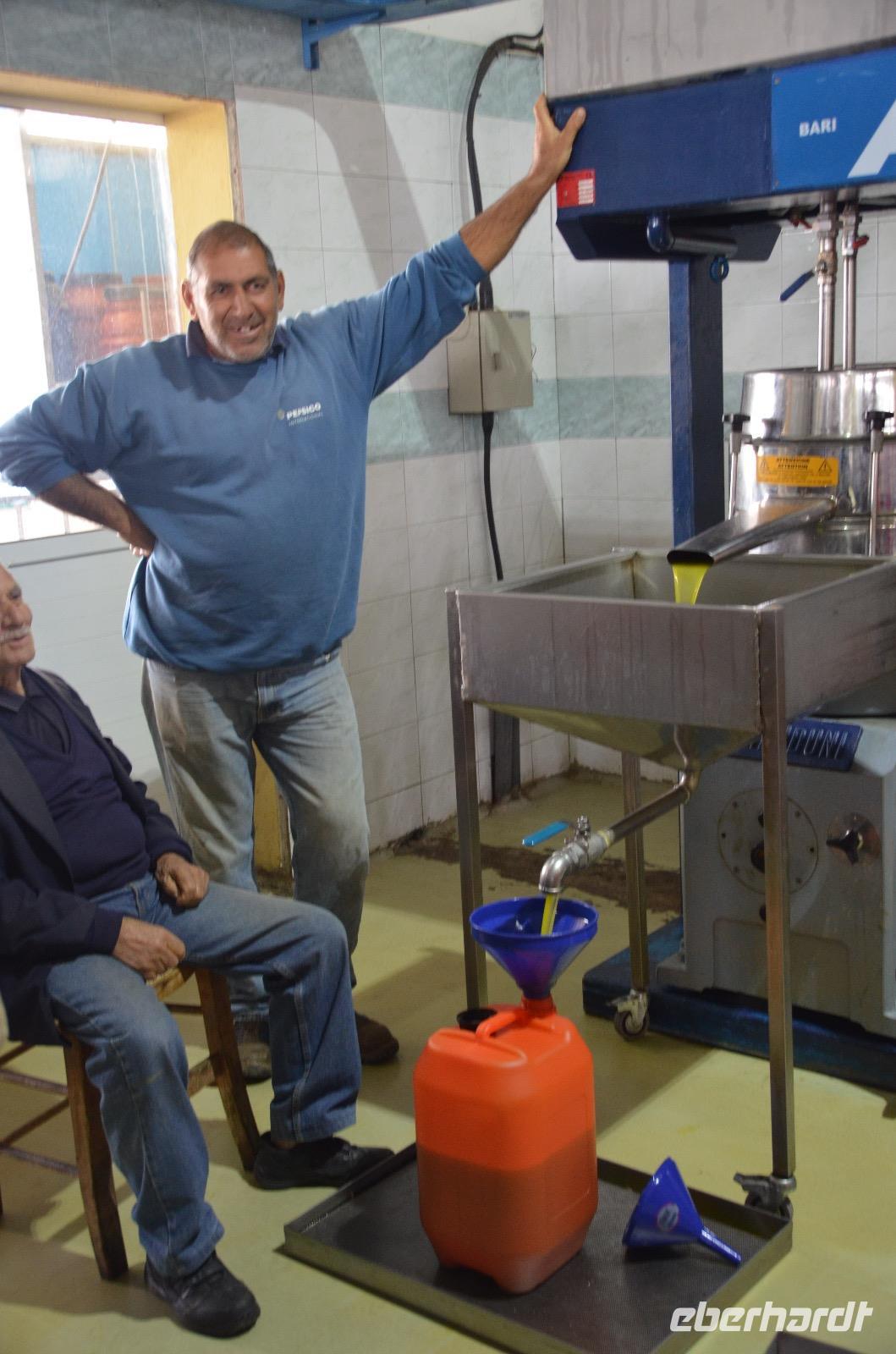 Als erstes bemerkten wir die extreme Lautstärke die von der kleinen Fabrik für Olivenöl kam. Während Antonis uns einiges von der Herstellung erklärte, bestaunten wir die Oliven, die hier verarbeitet werden. Als erstes löst man die Blätter, dann werden die Oliven gewaschen und gewogen. Anschließend werden sie gemahlen, gepresst und gären, bis am Ende das gute Öl entsteht. Wir durften uns bei der Ölpresse alle Schritte ansehen und zum Schluss natürlich verkosten. Wir waren überzeugt und nahmen uns ein paar Flaschen für Deutschland mit. Wenn das Olivenöl mit Virgin gekennzeichnet ist, bedeutet es, dass die Säure unter 0,6 liegt und das Öl kalt gepresst wurde, also bei unter 22 Grad.