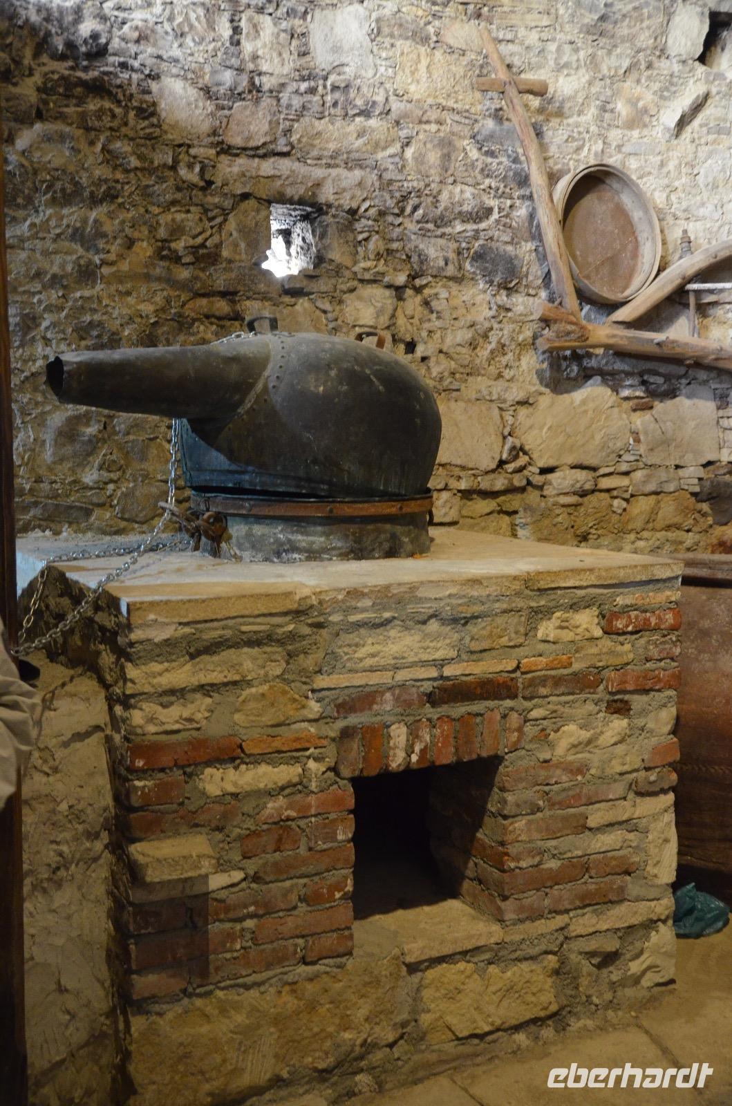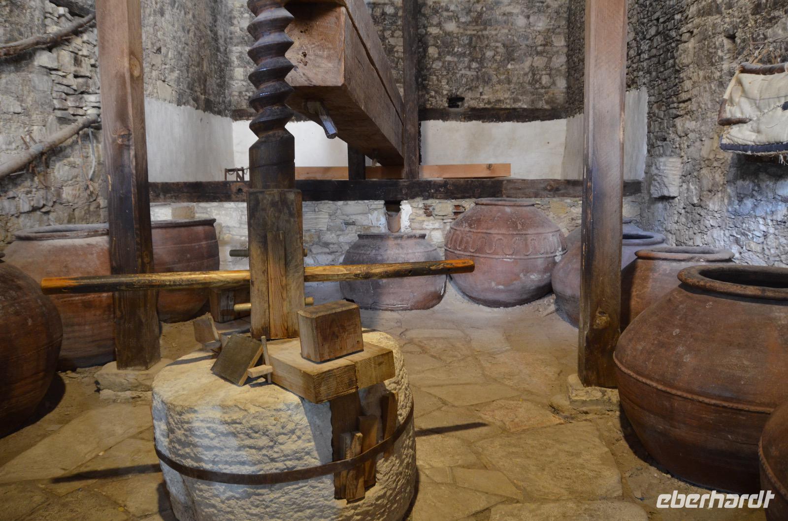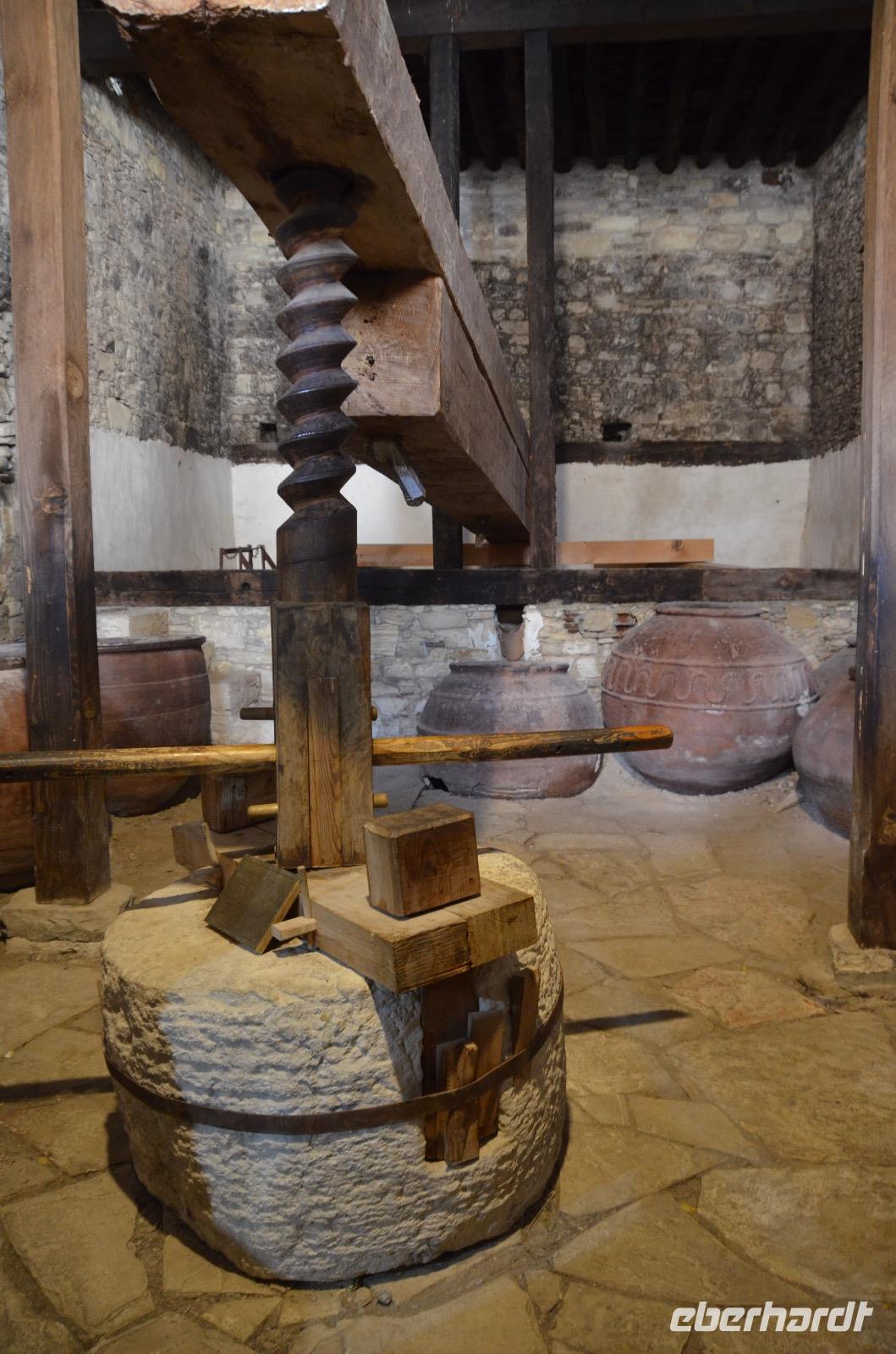 In Omodos besuchten wir die heilige Kreuzkirche. Hier lernten wir, weshalb an den Öllampen Straußeneier angebracht sind. Das sollte früher die Mäuse abhalten, die an dem Strick entlang kletterten und an der glatten Oberfläche der Eierschale abrutschten. Die ärmere Bevölkerung behalf sich hier mit dornigen Sträuchern. Besonders interessant war die Darstellung des zweiköpfigen Adlers auf dem Boden. Er symbolisiert die Teilung die römischen Reiches in Rom und Byzanz. Weiter ging es durch das Bergdorf. Langsam setzte der Regen ein und wir fanden Schlupf bei der alten Weinpresse. Wir bestaunten den Koloss aus Holz in der Mitte der Scheune An den Seiten standen zahlreiche Fässer, in denen der Wein gelagert wurde. Wir hatten anschließend etwas Freizeit, um die Gassen auf eigene Faust zu erkunden. An jeder Ecke wurden hier überzogene Nüsse und getrocknete Früchte verkauft. An einem Stand probierten wir ein süßliches Brot aus Kichererbsen.