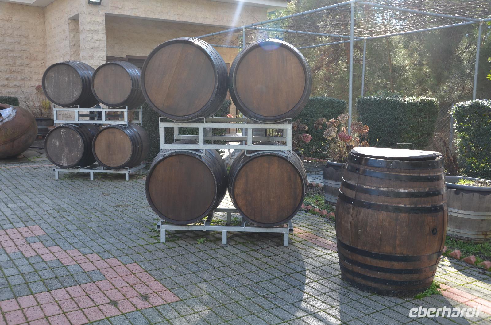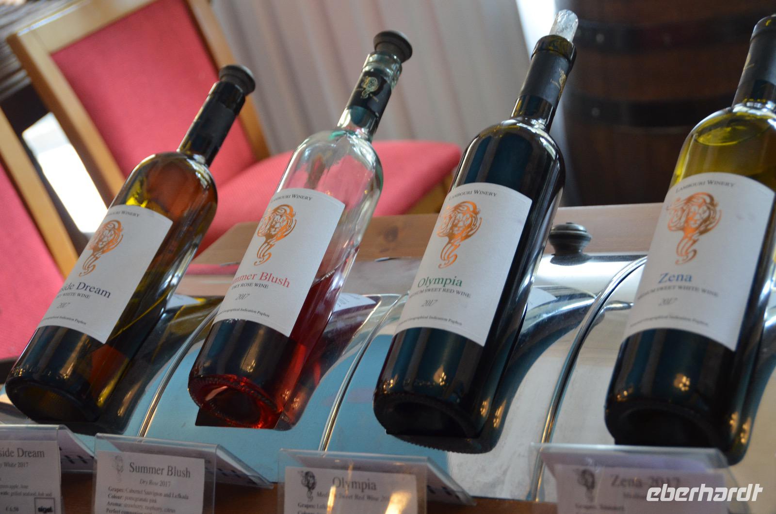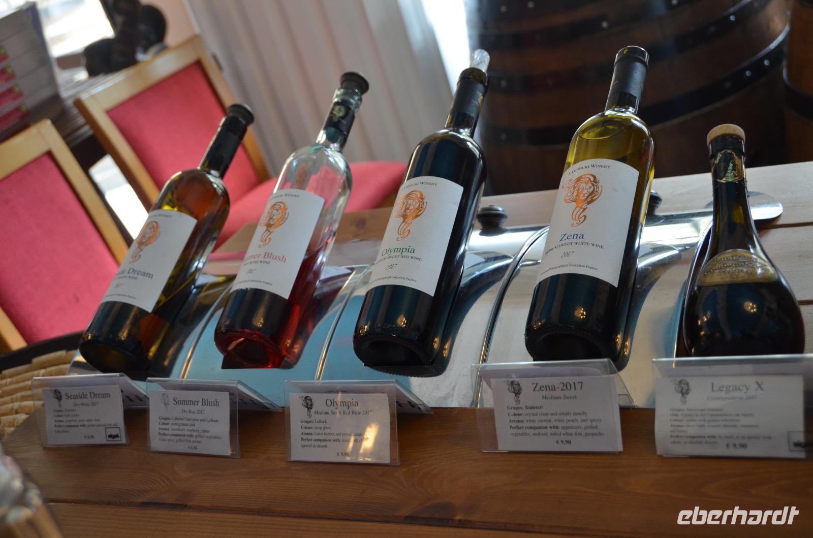 Nach wenigen Fahrminuten erreichten wir die Winzerei Lambouri. Hier wurden wir zuerst in die kalten Kellerräume geführt, wo wir die Maschinen für die Weinherstellung bestaunen konnten. Wir entdeckten bereits die herrlich geformten kleinen Flaschen, die für den Commandaria vorgesehen waren. In der oberen Etage waren wir herzlich eingeladen, um einige der Weine zu probieren. Dazu wurde uns Brot und Olivenöl serviert. Der Besitzer Roland stammt aus Deutschland und hat vor einigen Jahren das 350 Jahre alte Weingut und somit das Älteste auf Zypern, übernommen. Jedes Jahr werden hier 150.000 Flaschen Wein hergestellt. Als ersten Wein probierte die Gruppe einen trockenen Weißen mit 2%. Diesen trinkt man vor allem zu leichten Speisen wie Salat und Spaghetti. Der nächste war ein 13,5%iger Rosé, Summer Blush. Die nächsten Zwei waren Rotweine, erst der liebliche und dann der trockene. Zum Schluss bekamen wir auch den ältesten Markenwein der Welt zu probieren. Der Commandaria wird aus vollreifen Trauben gewonnen. Diese müssen 3 Wochen trocknen, dann werden sie gepresst und 5 Jahre lang in Eiche gelagert, ohne Zuckerzusatz. Der Süßwein hat 14,5% und wird auf Zypern oft als Dessert serviert.