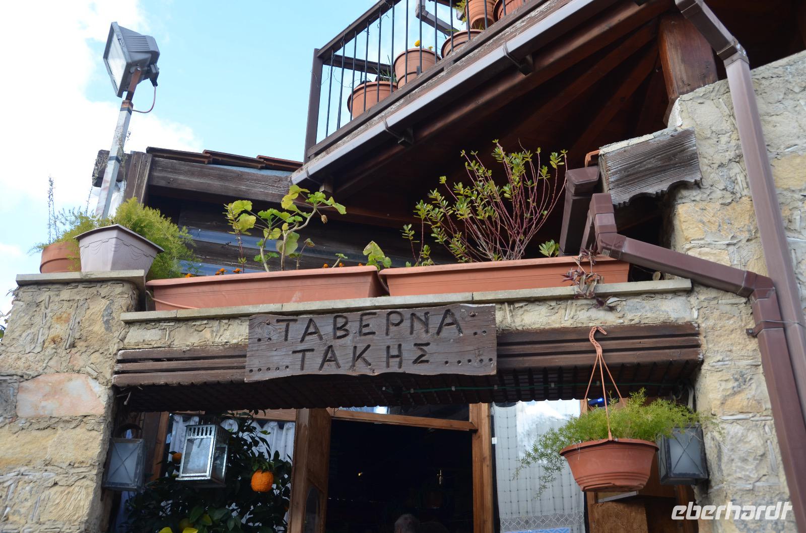 Nach der Weinverkostung freuten sich alle auf das Mittagessen. Wir fuhren in das Dorf Vouni, wo wir unser erstes Meze-Essen bekamen. Schon beim Eintreten in die Taverne ahnten wir, dass hier gutes Essen zubereitet wird, denn das kleine Gasthaus war voll mit einheimischen Gästen. Wir fühlten uns sehr wohl während die 10 Gänge nach und nach serviert wurden. Nicht nur durch den Wein kam gute Stimmung auf, denn der Gastwirt legte uns griechische Musik auf, zu der wir mit ihm und Antonis tanzten. Ausgelassen spazierten wir satt und zufrieden zum Bus, wo bereits mit Schnaps und Weihnachtsstolle auf uns gewartet wurde.