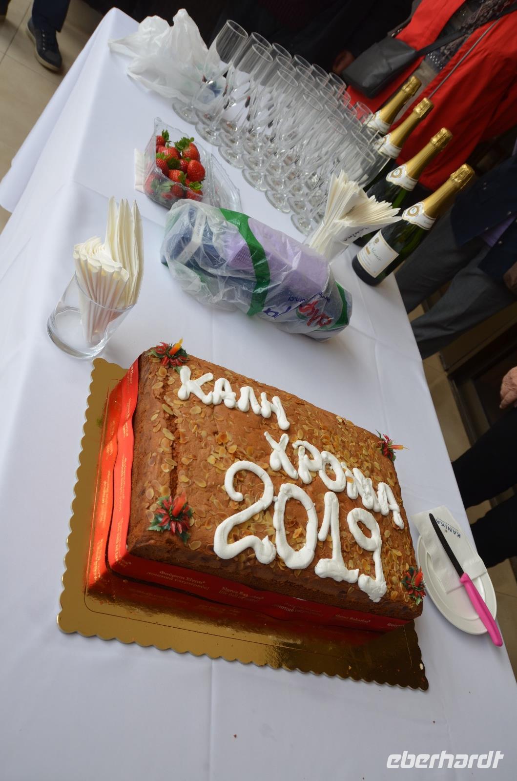 Am Nachmittag trafen wir uns alle noch einmal für eine kleine Überraschung auf der Veranda des Hotels. Hier hatten wir einen Tisch mit Sekt und dem Neujahrskuchen Vasilopita vorbereitet. Nach einer kleinen Ansprache und einem Gedicht zum Neuen Jahr, stießen wir gemeinsam auf die schöne Reise an. Der Kuchen wurde angeschnitten und jeder durfte sich ein Stück raussuchen. Denn in dem Teig ist eine Münze versteckt. Wer diese in Seinem findet, ist der Glücklichste für das neue Jahr. Bei uns bekam die Gewinnerin noch eine Flasche Weißwein von der Winzerei Lambouri, die wir zwei Tage zuvor besucht hatten. Danach gingen die meisten in die Bar, um den letzten Urlaubstag mit den Mitreisenden zu genießen.