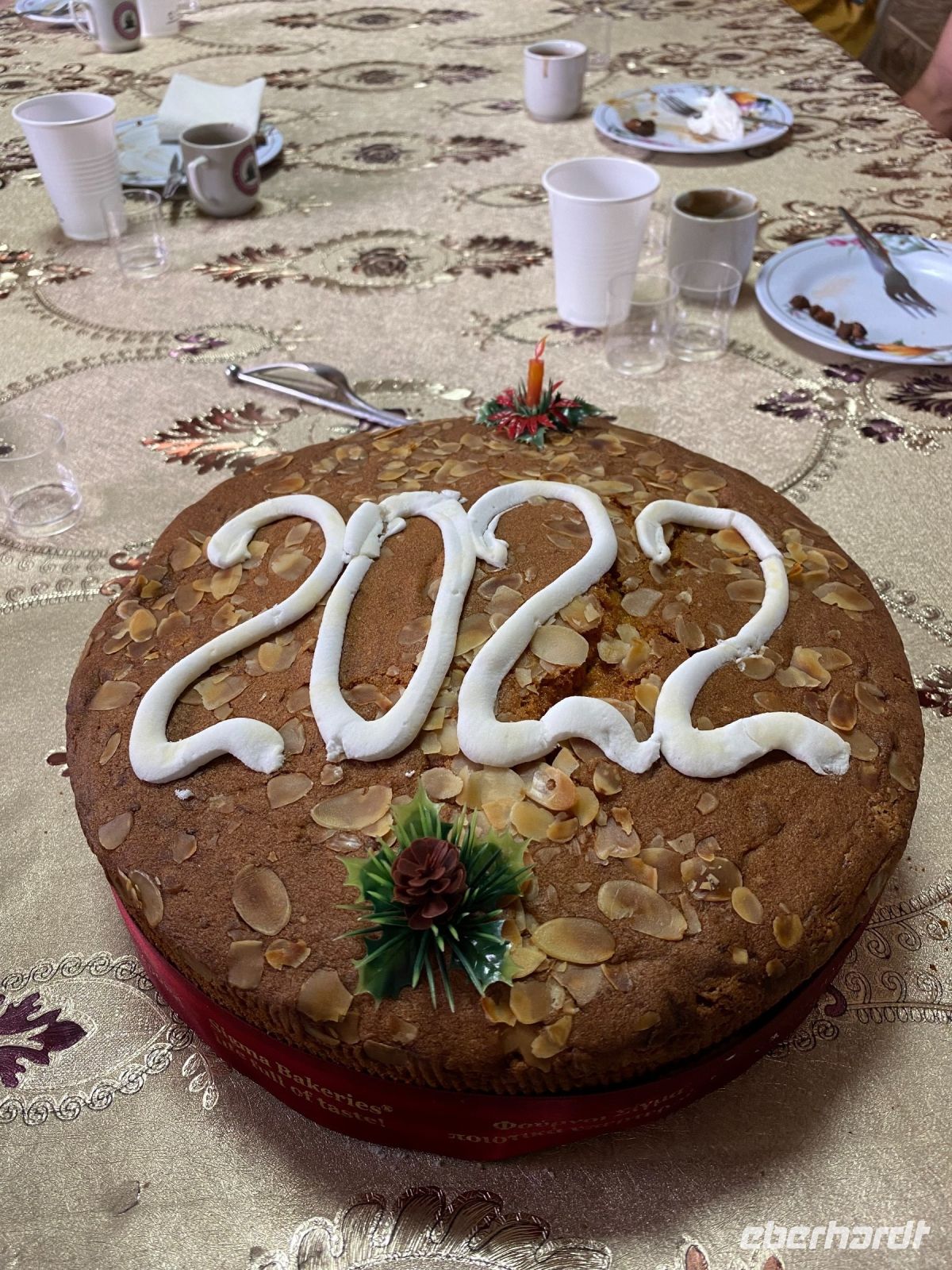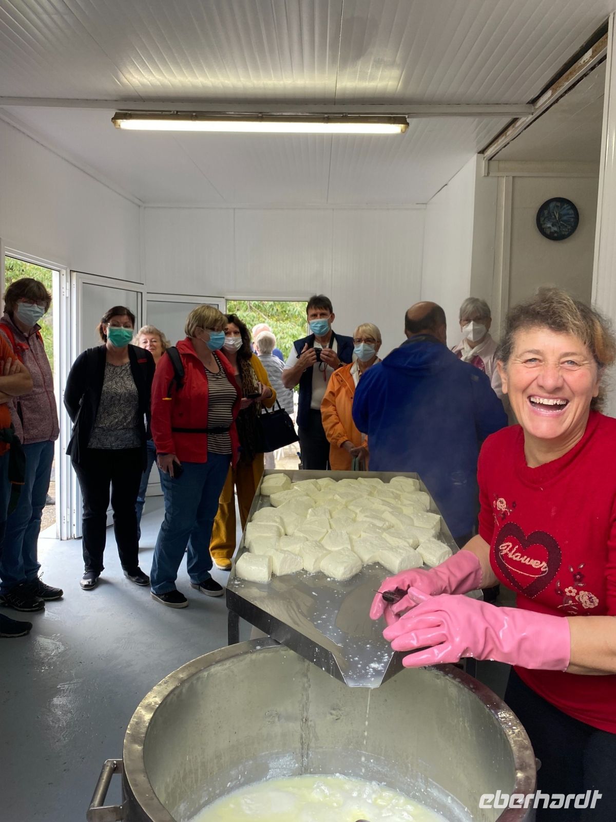 Loula begrüßte uns mit ihrem herzlichen Lachen und ihrer offenen Art und zeigte uns zunächst, wie der traditionelle Halloumi hergestellt wird. Der Käse besteht hier auf Zypern zu mindestens 90 % aus Ziegenmilch und wird mit Salz und getrockneter Minze verfeinert. Diese Spezialität sollten wir im Anschluss natürlich noch verkosten. So bereitete Loula sehr herzlich neben frischem Halloumi eine Art Frischkäse zu, der von der Halloumiproduktion „übrig“ bleibt, frisches Gemüse und Brot. So frisch schmeckte der Käse sehr weich und weniger streng. Wir verfeinerten unseren Käse außerdem mit Johannesbrotkernsirup und lauschten gespannt den Familiengeschichten, die Antonis uns über Loulas 7 Kinder erzählte. Zum Abschluss unserer heutigen Mittagspause teilten wir uns noch den traditionell zypriotischen Neujahrskuchen, die Vasilopita. Wer die Münze im Kuchen findet, soll im kommenden Jahr besonders viel Glück haben (und 300 Ziegen geschenkt bekommen ;)).