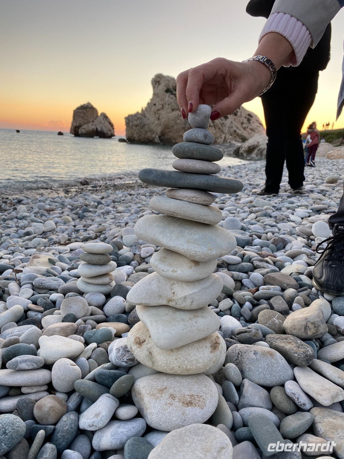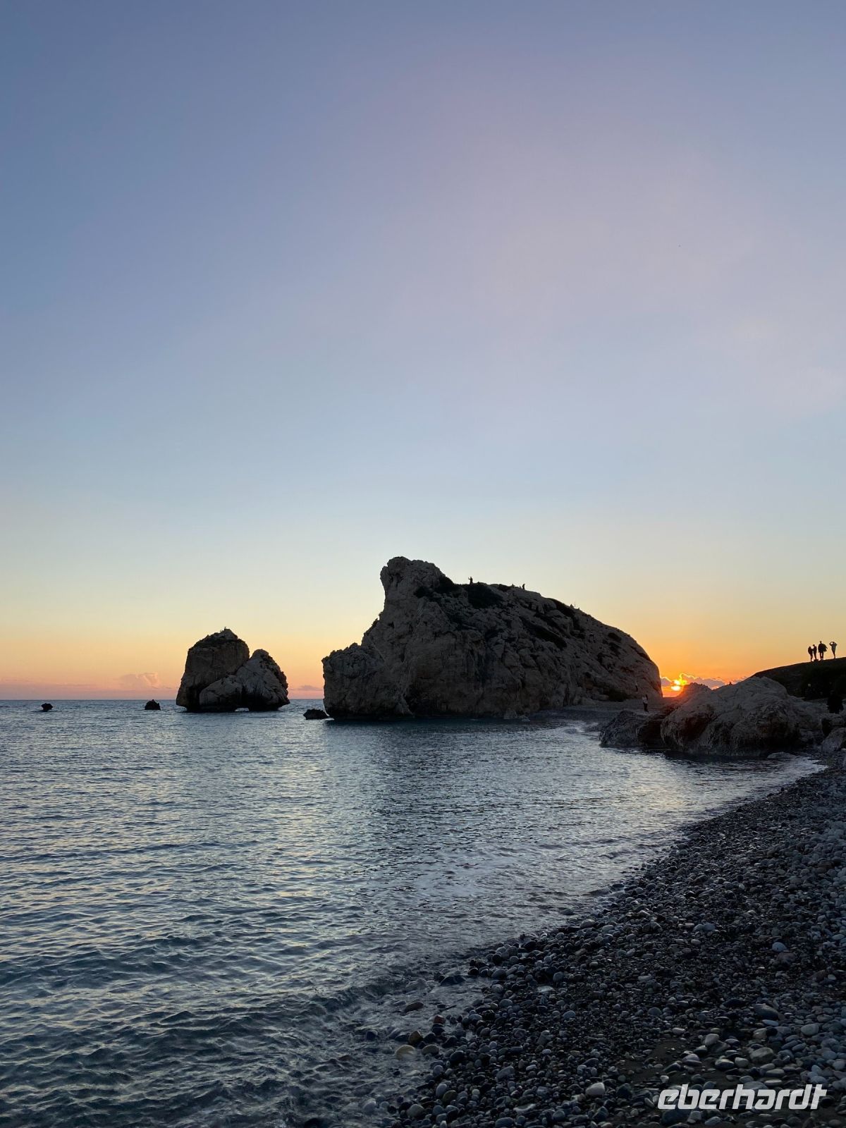 Am Nachmittag besuchten wir noch das Bergdorf Lefkara. Hier wird traditionell Spitze und Silberschmuck hergestellt. Wir verbrachten ein wenig Freizeit, um durch die kleinen Gassen zu schlendern, einen Kaffee zu trinken oder einfach die Sonne zu genießen. Am Himmel kündigte sich ein traumhafter Sonnenuntergang an. Diesen sollten wir heute an einem ganz besonderen Ort verbringen. Wir besuchten den Geburtsort der Aphrodite. Obwohl wir uns alle bis heute nicht ganz einig sind, welcher der drei Felsen DER Felsen sein sollte, genossen wir die letzten Sonnenstunden am schönen Steinstrand bei Geschichten und einem kleinen Absacker.