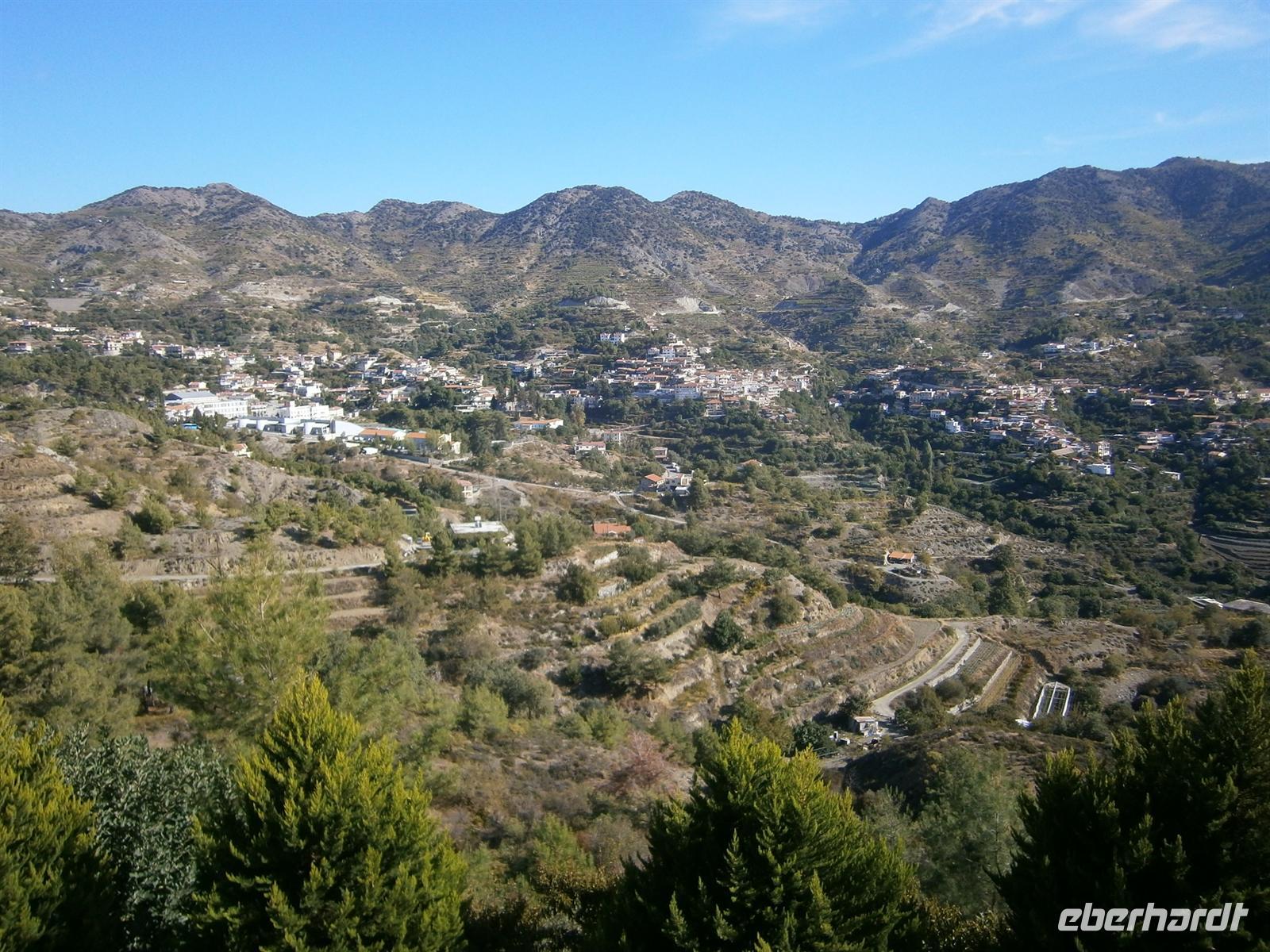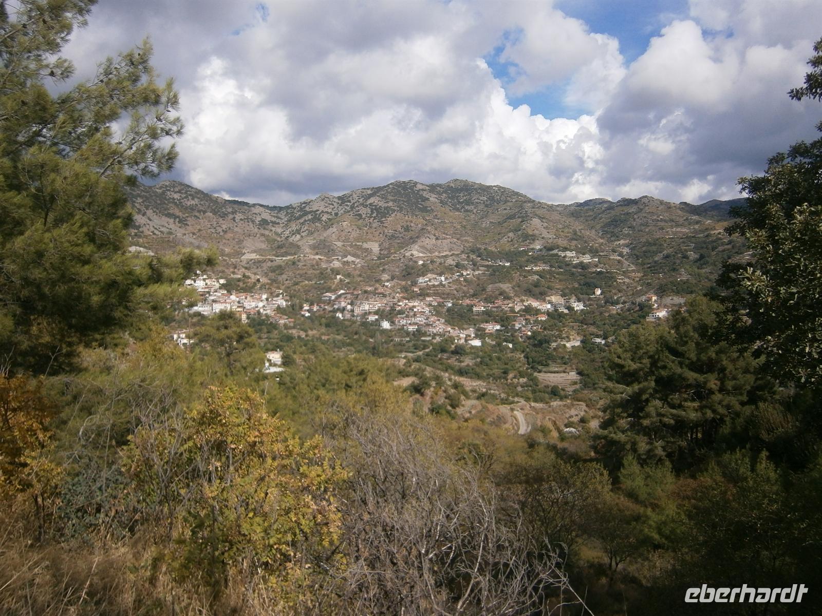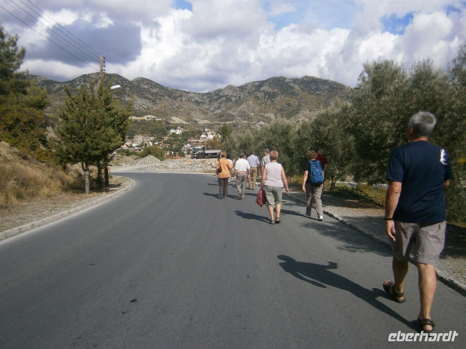 Nach einem reichhaltigen Frühstück wurden wir heute standesgemäß von einem Oldtimerbus abgeholt worden. Der Weg führte uns ins 30-Minuten entfernte Spilia, der Ausgangsort unserer heutigen Tour. Zu Beginn erwartete uns ein relativ steiler Anstieg, der dann nach und nach ebener wurde. Wir wanderten durch Wälder, die voll von Goldeiche und Kiefern waren. Antonio erklärte wieder viel Interessantes rund um Zypern, das Gestein, Flora und Fauna. Nach einer guten anderthalb Stunde waren wir auf dem ersten kleinen Gipfel angekommen, wo uns der dort ansässige Feuerwehrmann herzlich empfing. Begrüßungsgetränk war natürlich ein selbstgebrannter Schnaps - „Jamas!!!“, das Wort hatten wir immer noch nicht vergessen. Aber es kamen auch ein paar neue Vokabeln dazu: Calimera - Guten Morgen und Ephalisto - Dankeschön! Immer besser konnten wir uns verständigen, zumindest relativ gesehen. Zum Schnaps gab es ein mit Zucchini gefülltes Pitabrot und damit das noch besser rutschte, gab es noch einen Schnaps hinterher. Aber wir hatten unser Ziel noch nicht erreicht, daher verabschiedeten wir uns vom alten Feuerwehrmann und wagten den Abstieg. Nach einigen Auf und Abs kamen wir schließlich an unserem Oldtimerbus an.