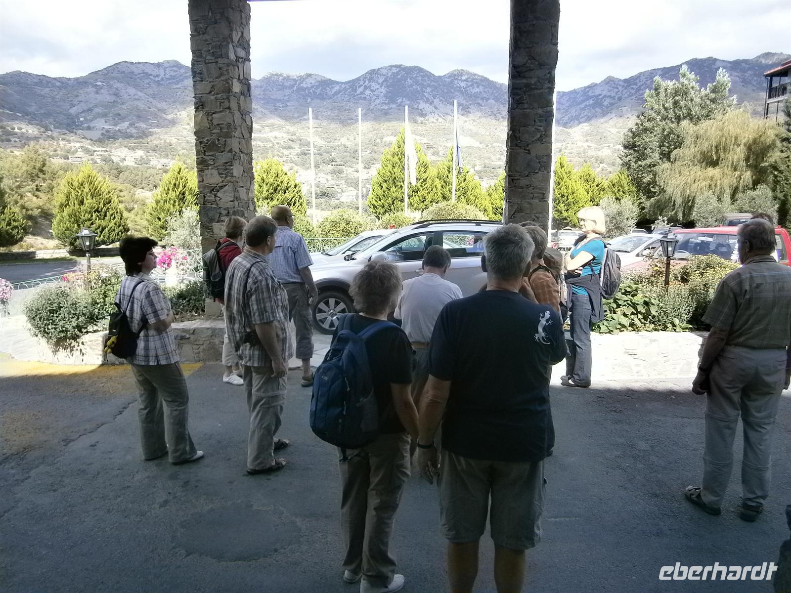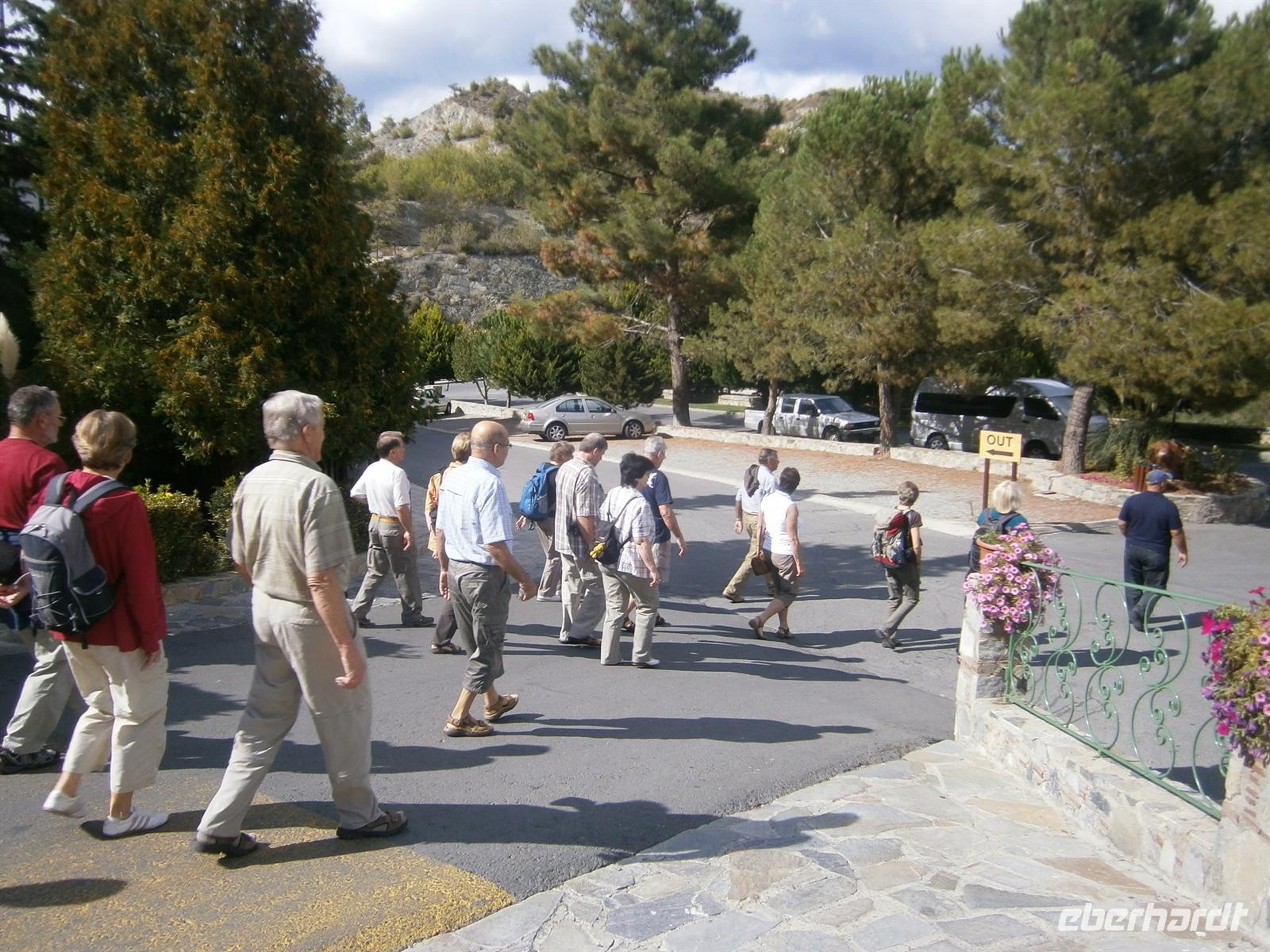 Gestärkt vom Frühstück und endlich mal richtig ausgeschlafen, erwartete uns heut der erste Wandertag mit Antonio. Pünktlich wurden wir von unserem Busfahrer Tomis abgeholt und sicher nach Troodos gefahren. Dort wehte ein fast eisiger Wind, alle rüsteten sich mit Ihren Wind- und Regenjacken, doch Antonio hatte ein ganz anderes Wundermittel: Ratzeputz! Schnell Becher ausgeteilt und schon waren auch die beiden Fläschen alle. „Jamas!!“ - zu deutsch „Prost“ werden wir wohl auf dieser Reise nicht das letzte Mal gerufen haben…Gleich war es auch etwas wärmer geworden.