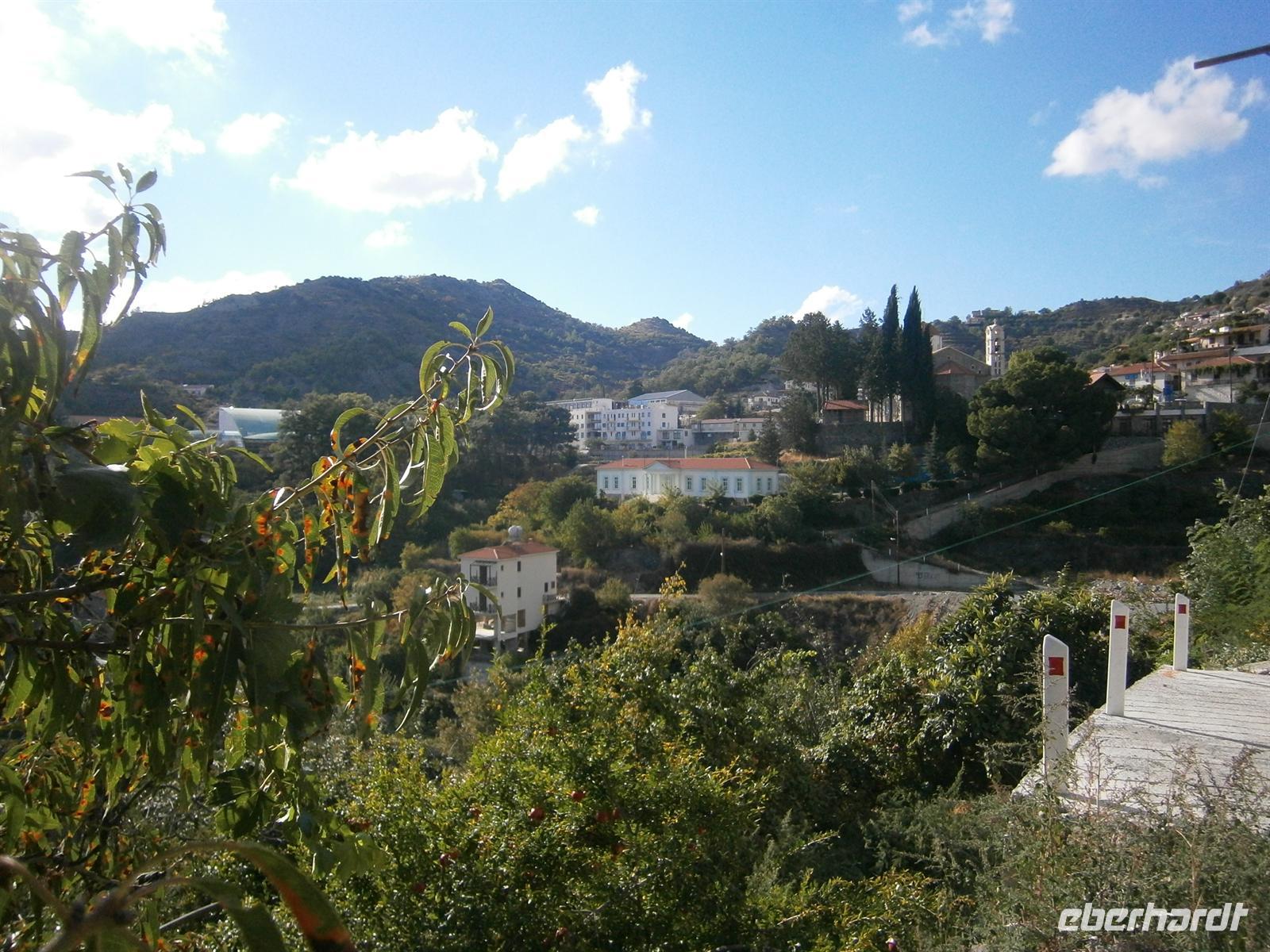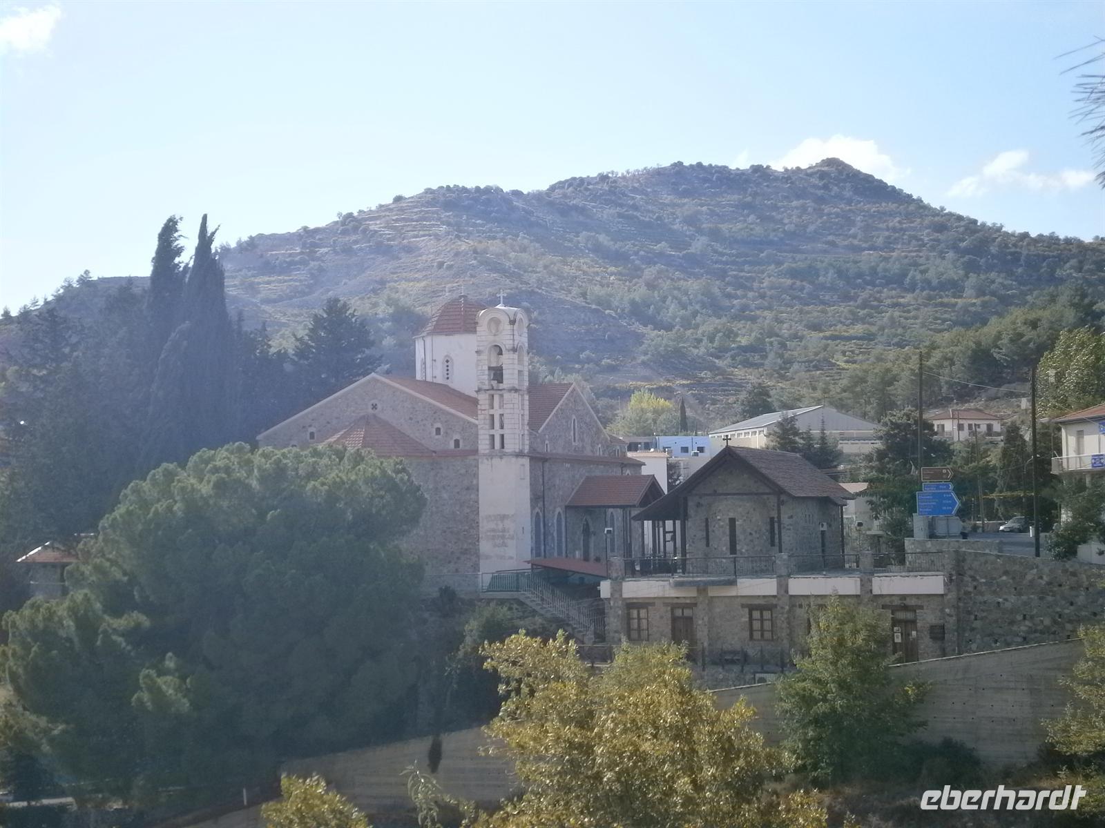Gut gestärkt vom Frühstück fuhren wir in das Bergdorf Pano Panagia, das circa eine Stunde entfernt war. Dort begann unser Wandertag erstmal standesgemäß mit einem Ratzeputz, den lt. der Gruppe „fährt kein Auto ohne Benzin“. „Jamas“ und schon konnten wir die ersten Höhenmeter gut bewältigen. Wir wanderten durch sehr hübsche Weinfelder, in denen zum Sonntag einige Arbeiter die Weintrauben pflückten. Oben an der kleinen Kapelle angekommen, legten wir erst einmal ein Päuschen ein und genossen die Aussicht, die heute leider etwas diesig war. Aber die Sonne lachte wieder und nichts konnte uns die Laune verderben. Auch Antonio erzählte wieder einen Schwank aus seiner Jugend. Nun ging es nur noch bergab bis wir wieder im Dorf angekommen waren. Dort erwartete uns bereits Tomis und chauffierte uns zum nahgelegenen Picknick-Platz. Wir hatten wieder ein tolles Buffet aus verschiedenen Sorten Käse die wir typisch zypriotisch mit Honig oder Weinmost aßen, Wurst, Knoblauch-Oliven, Tomaten, Gurken, frisches Brot und natürlich Rotwein. Doch bevor wir träge wurden, fuhren wir weiter ins Kloster Chrysorrogiatissa und besichtigten die Kirche und das Museum. Bevor wir ins Hotel zurückfuhren, tranken wir unterwegs einen zypriotischen Kaffee und sahen den Einheimischen bei Brettspielen zu. Eine sehr amüsante Angelegenheit und wir freuten uns umso mehr, dass Antonio die Runde für sich entschied. Mit vielen neuen Erlebnissen und Eindrücken kamen wir im Hotel an, wo die Strandbucht zum baden einlud oder Einkäufe im Supermarkt getätigt wurden.