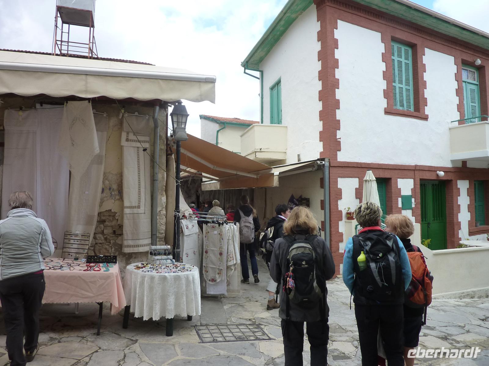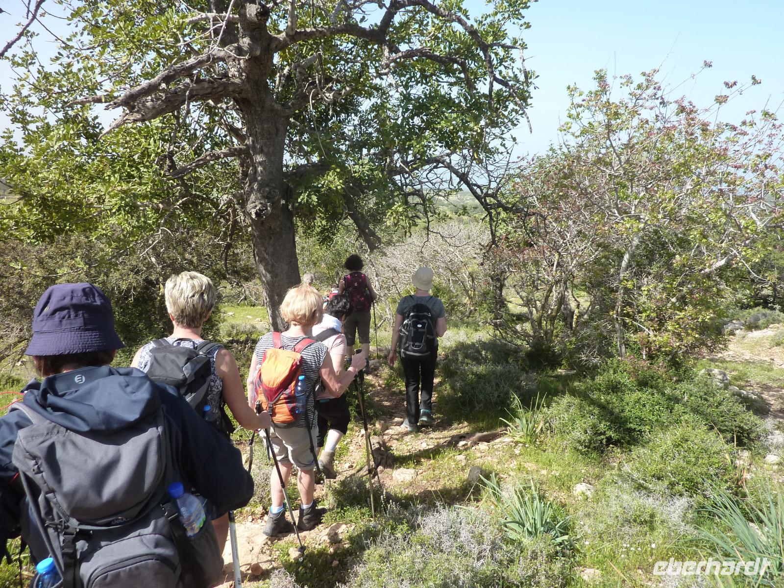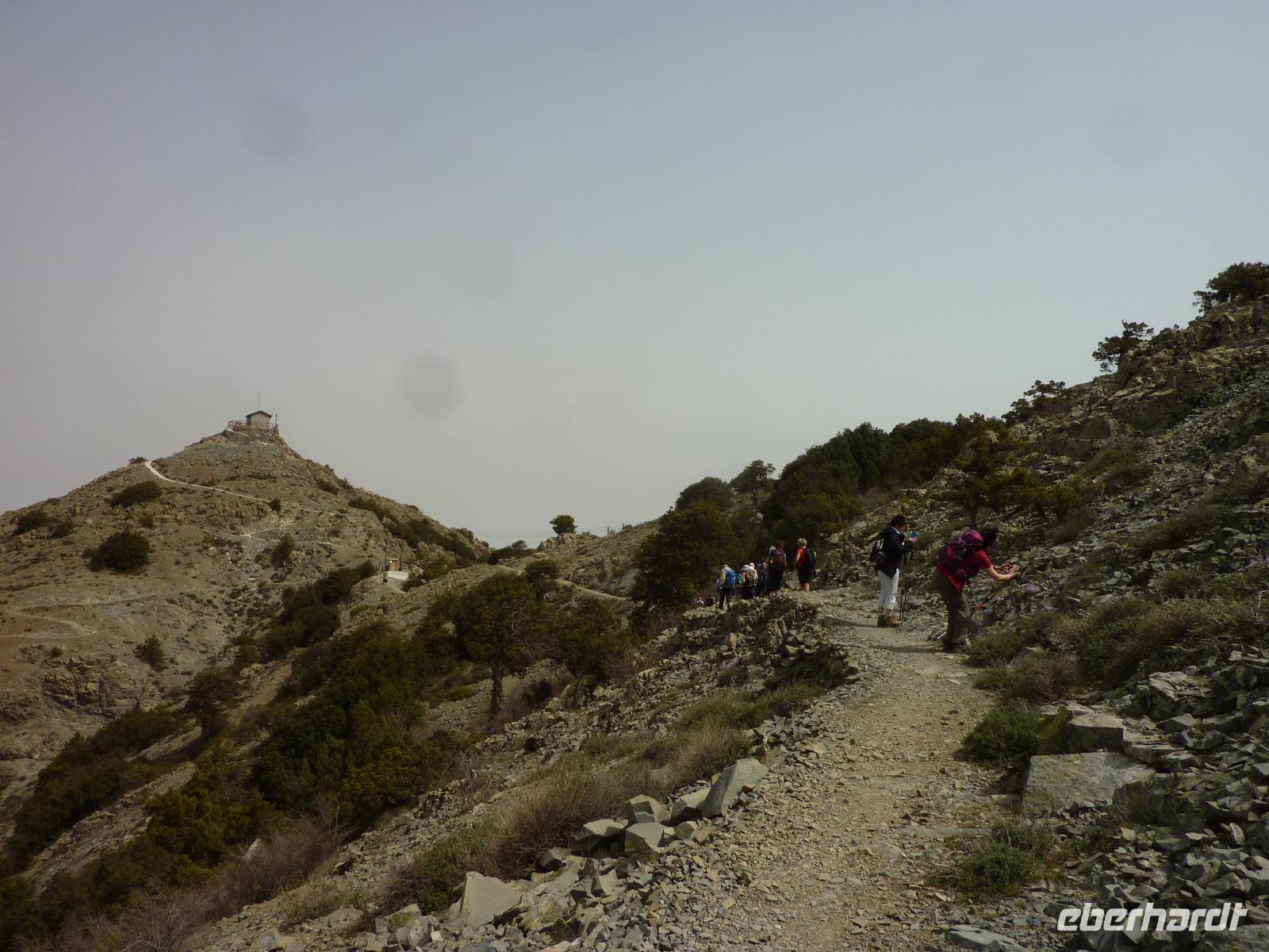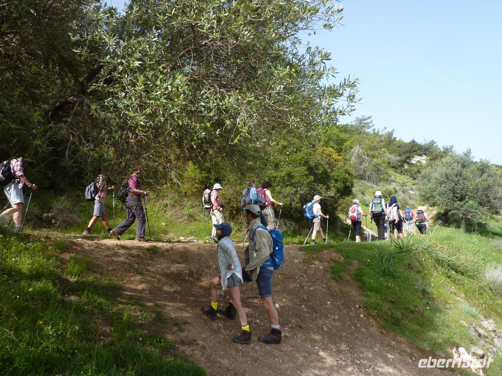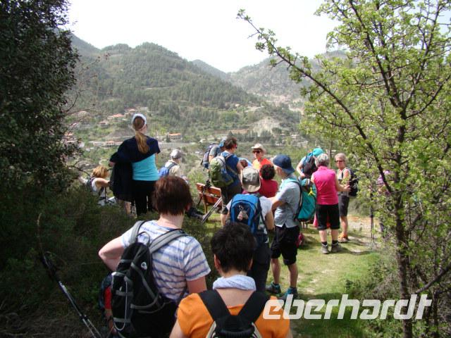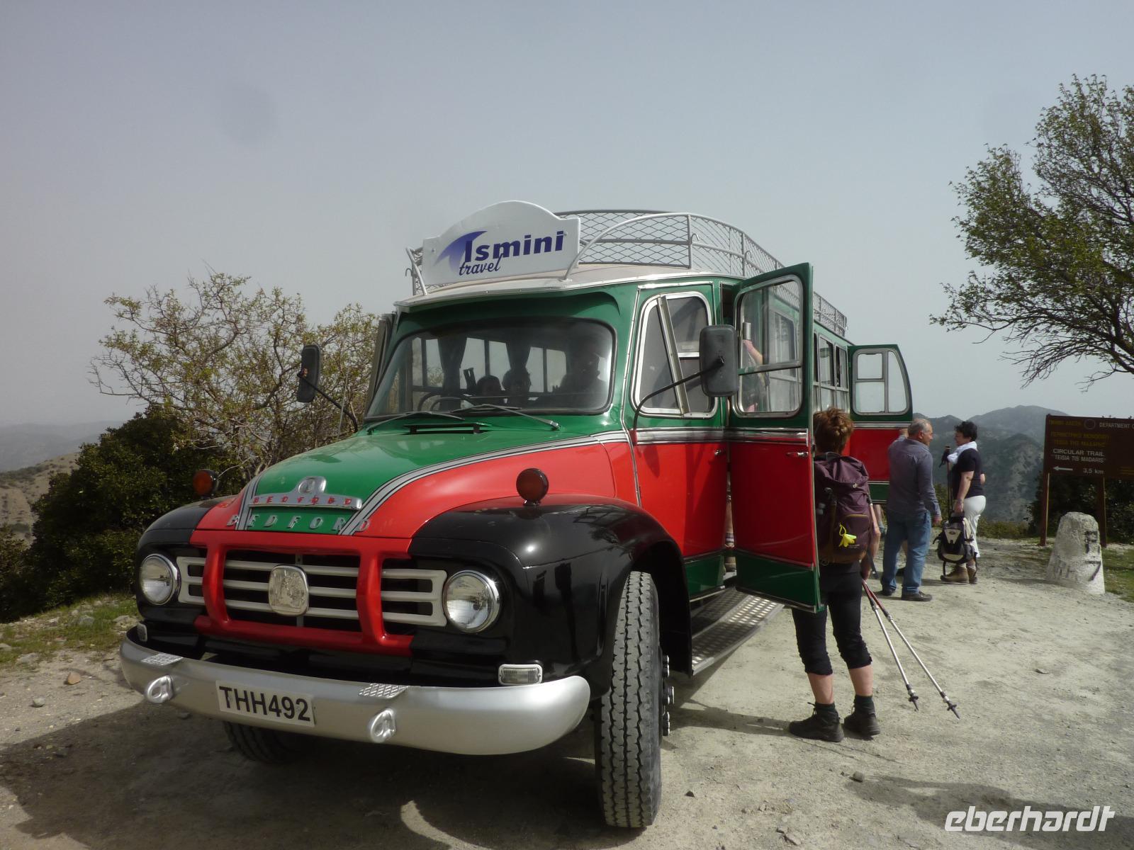 Nach dem Frühstück starteten wir unsere erste Wanderung direkt vom Hotel. Vorbei am Sanatorium nahmen wir einen ersten seichten Anstieg und schon bald konnten wir uns an herrlichen Ausblicken erfreuen, die nur leicht getrübt wurden durch den Saharasand, den der Wind bis nach Zypern mit sich führte. Aber mit etwas Phantasie konnte man sogar die Gebirgszüge der Türkei ausmachen, manch einer glaubte sogar schneebedeckte Berge zu erkennen. Wir wanderten weiter einen Höhenweg entlang und erreichten einen kleinen Rastplatz unterhalb des Gipfels mit der Feuerwache. Einige Gäste ruhten, andere erklommen den Gipfel und genossen so nochmals einen schönen Rundumblick ins Trodosgebirge. Von hier aus ging es mehr oder weniger immer leicht bergab, erste Frühblüher säumten den Wegesrand. Am Ziel unserer Wanderung erwartete uns ein rot-schwarzer Oldtimer Bus, welch eine Überraschung. Natürlich war dies ein ideales Motiv für ein Gruppenfoto .. gesagt getan. Mit dem urigen "Geschoss" fuhren wir schließlich nach Agros und kehrten dort zu einer Meze in Nikos Taverne ein. Kaum zu glauben, was hier alles aufgetischt wurde .. Tzaziki, Brot, Oliven, Weinblätter, Salate und Unmengen an Fleisch, und eines immer leckerer als das andere. Selbst die Vegatrier kamen hier auf ihre Kosten. Danach wartete eine weitere Überraschung auf uns. Wir statteten Nikis-Süßigkeitenfabrik einen Besuch ab. Allerlei Leckerein zum Probieren und schließlich auch für den Erwerb. Danach brachte uns der Oldtimer zurück ins Hotel. Und auch das Abendessen war wieder sehr gut, nur hatten wir noch garnicht wieder so richtig Appetit nach der opulenten Mittags-Meze.