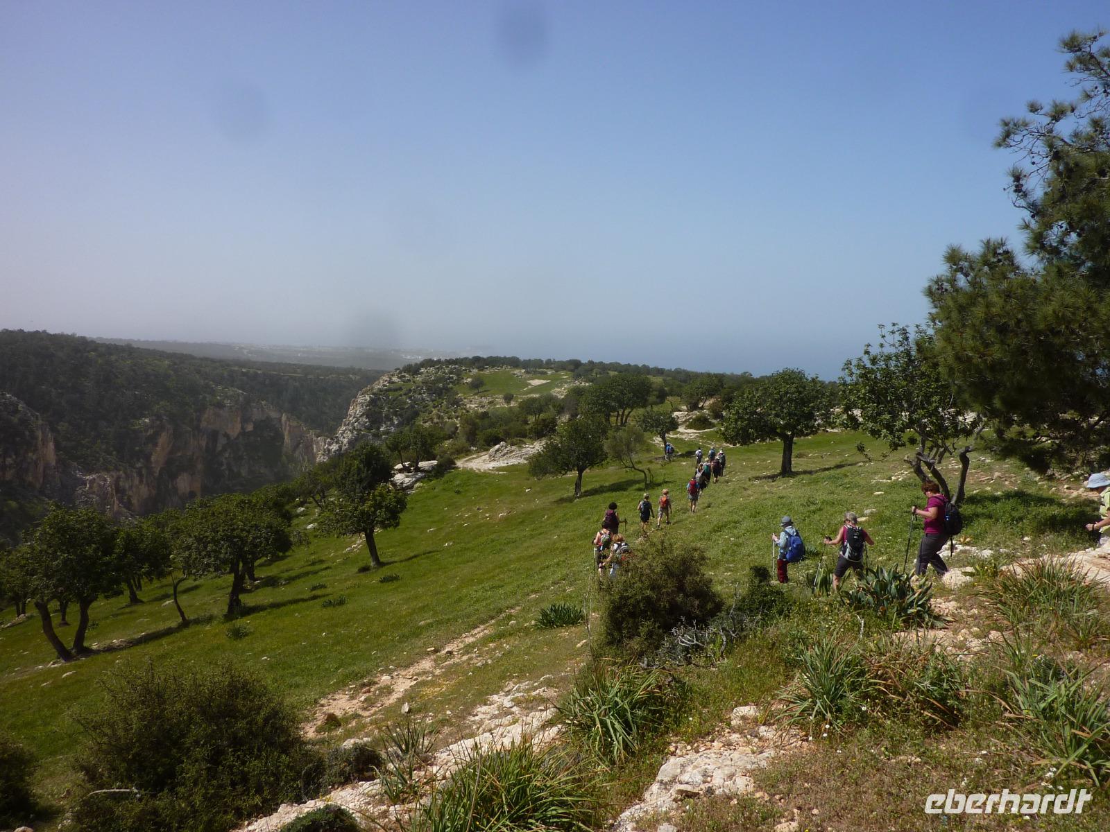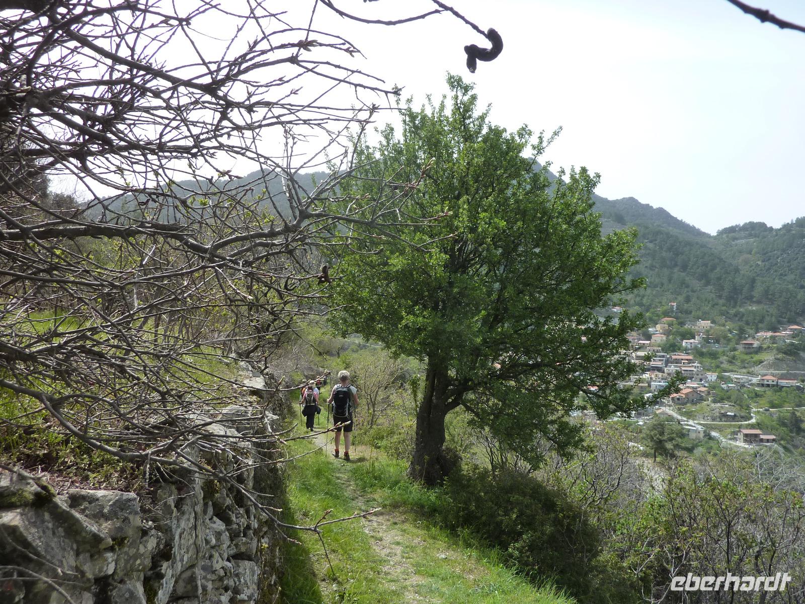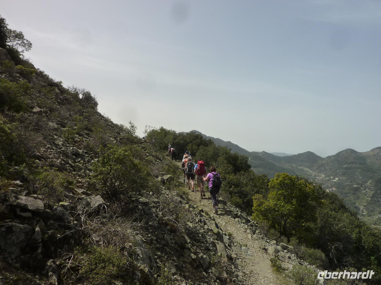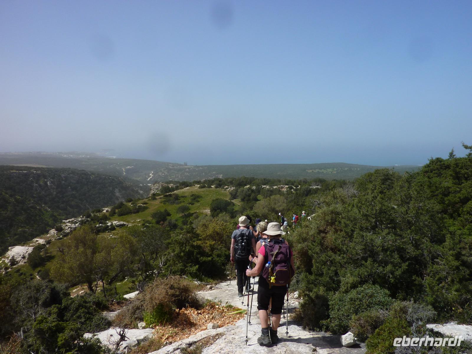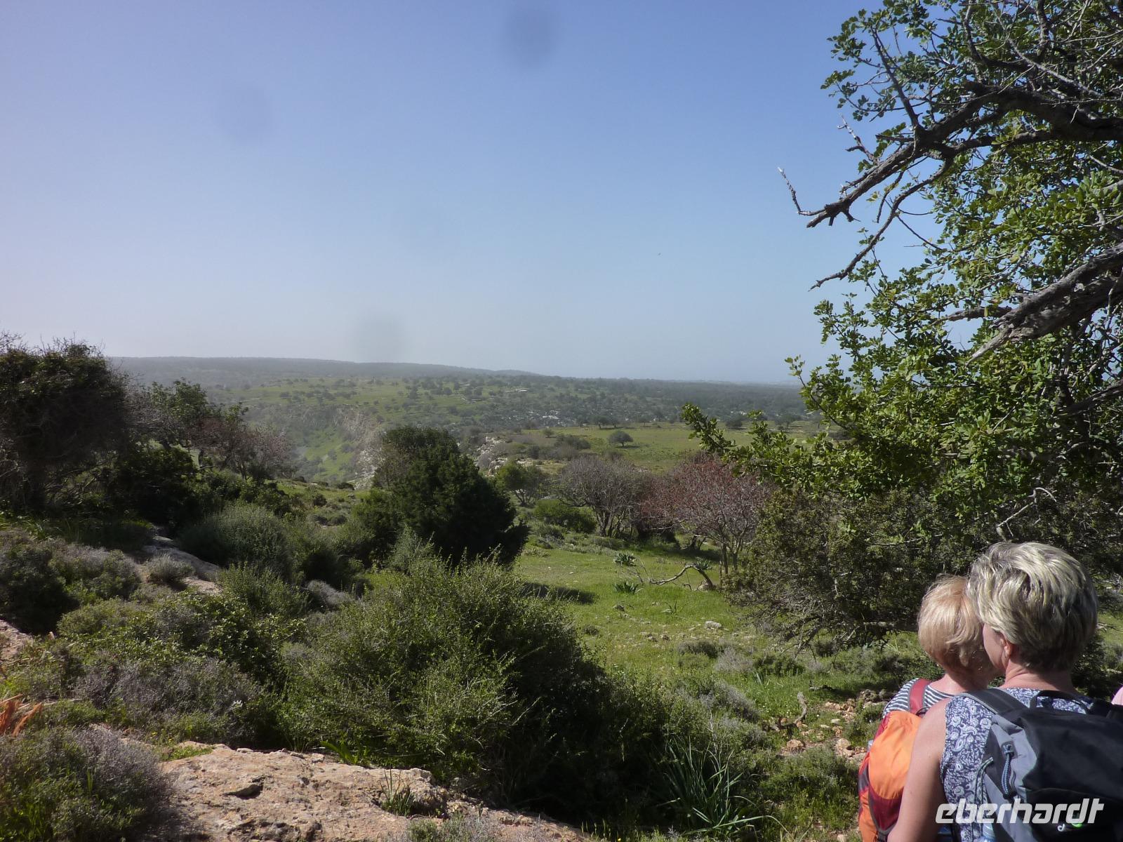 Nach dem Frühstück starteten wir unsere erste Wanderung direkt vom Hotel. Vorbei am Sanatorium nahmen wir einen ersten seichten Anstieg und schon bald konnten wir uns an herrlichen Ausblicken erfreuen, die nur leicht getrübt wurden durch den Saharasand, den der Wind bis nach Zypern mit sich führte. Aber mit etwas Phantasie konnte man sogar die Gebirgszüge der Türkei ausmachen, manch einer glaubte sogar schneebedeckte Berge zu erkennen. Wir wanderten weiter einen Höhenweg entlang und erreichten einen kleinen Rastplatz unterhalb des Gipfels mit der Feuerwache. Einige Gäste ruhten, andere erklommen den Gipfel und genossen so nochmals einen schönen Rundumblick ins Trodosgebirge. Von hier aus ging es mehr oder weniger immer leicht bergab, erste Frühblüher säumten den Wegesrand. Am Ziel unserer Wanderung erwartete uns ein rot-schwarzer Oldtimer Bus, welch eine Überraschung. Natürlich war dies ein ideales Motiv für ein Gruppenfoto .. gesagt getan. Mit dem urigen "Geschoss" fuhren wir schließlich nach Agros und kehrten dort zu einer Meze in Nikos Taverne ein. Kaum zu glauben, was hier alles aufgetischt wurde .. Tzaziki, Brot, Oliven, Weinblätter, Salate und Unmengen an Fleisch, und eines immer leckerer als das andere. Selbst die Vegatrier kamen hier auf ihre Kosten. Danach wartete eine weitere Überraschung auf uns. Wir statteten Nikis-Süßigkeitenfabrik einen Besuch ab. Allerlei Leckerein zum Probieren und schließlich auch für den Erwerb. Danach brachte uns der Oldtimer zurück ins Hotel. Und auch das Abendessen war wieder sehr gut, nur hatten wir noch garnicht wieder so richtig Appetit nach der opulenten Mittags-Meze.