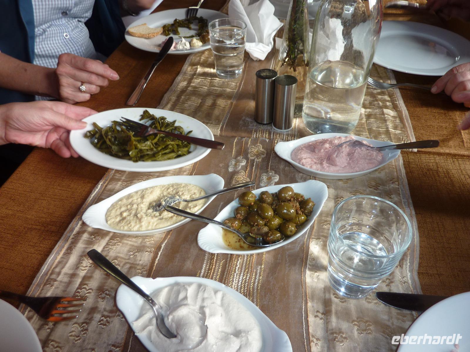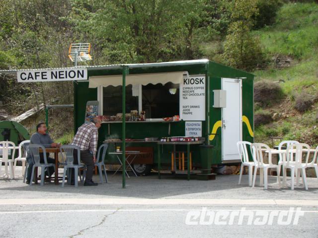 Für den Nachmittag verabredeten wir uns mit Dimitri für einen kleinen Spaziergang in das Ortszentrum von Kyperounta. Unterwegs trafen wir auf den Schulbus, der uns die letzten Meter noch bis ins Zentrum mitnahm. Der kleine Dorfkern war recht beschaulich und so genossen wir einen ersten richtigen zypriotischen Kaffee .. je nach Geschmackslage: ohne Zucker, mittelsüss bzw. sehr süss. Zurück im Hotel verwöhnte uns die "Oma" des kleinen Familienhotels mit einem leckeren Abendessen und so langsam spürten wir den langen Tag, der ja bereits mitten in der Nacht begann. Gegen 22.30 Uhr trafen dann auch die Gäste aus Dresden kommend ein, und auch für sie war der Tisch noch reichlich gedeckt.