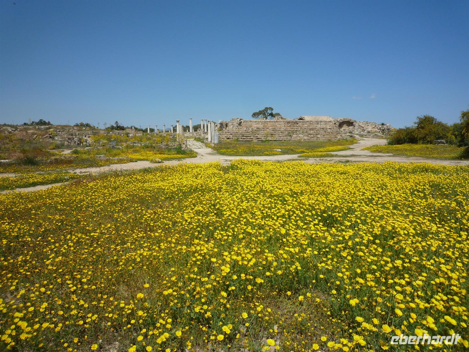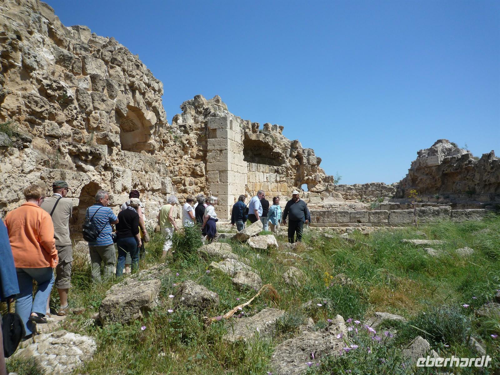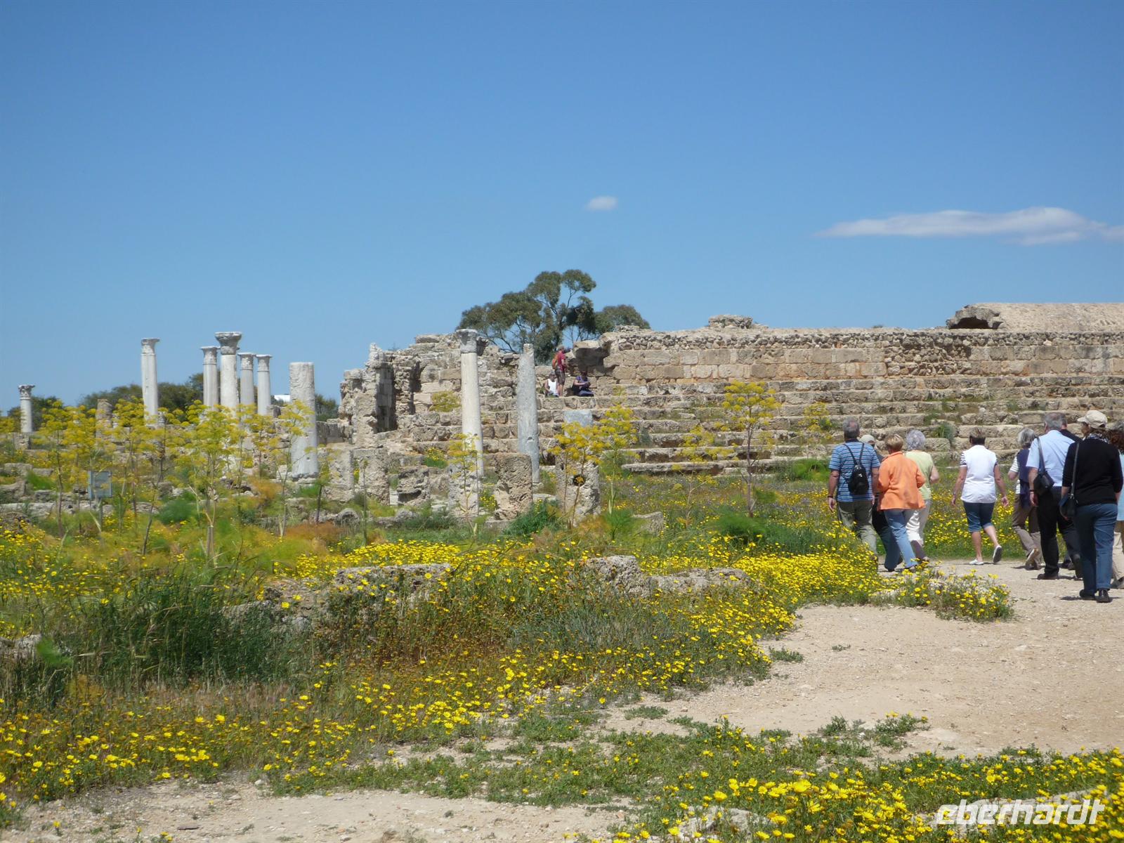 Das Grab und das Kloster des Apostels Barnabas bilden das erste Ziel des Tages. Bei strahlendem Himmel und herrlichem Sonneschein, aber doch etwas kühlem Wind lauschen wir den Erläuterungen Antonis’ über die ersten Schritte der Christianisierung der Insel. Im Kunstmuseum gibt uns Antonis einen ersten Einblick in die Ikonen-Malerei der byzantinischen Kunst. Auch in den nächsten Tagen wird uns dieses Thema ausführlich beschäftigen. Weiter führt uns der Weg nach Salamis, einer alten Ausgrabungsstätte. Die einstige Hauptstadt von Zypern war weit als 1100 v. Chr. im Besitz von den Assyrer, Ägypter, Perser, und Römer, aber überlebte Salamis schließlich. Dieses wunderschöne Gebiet mit den Ausgrabungen liegt in einem wunderschönen Wald aus Mimosen, Kiefern und Eukalyptenbäumen. Das Theater mit 50 Sitzreihen für 15.000 Zuschauern ist die zweitgrößte spektakulärste Sehenswürdigkeit.