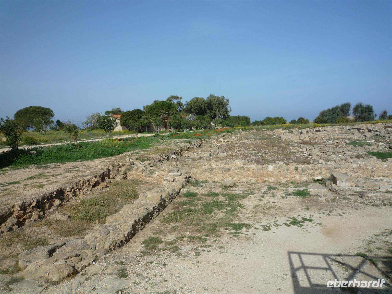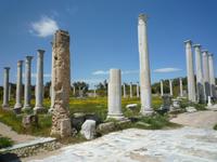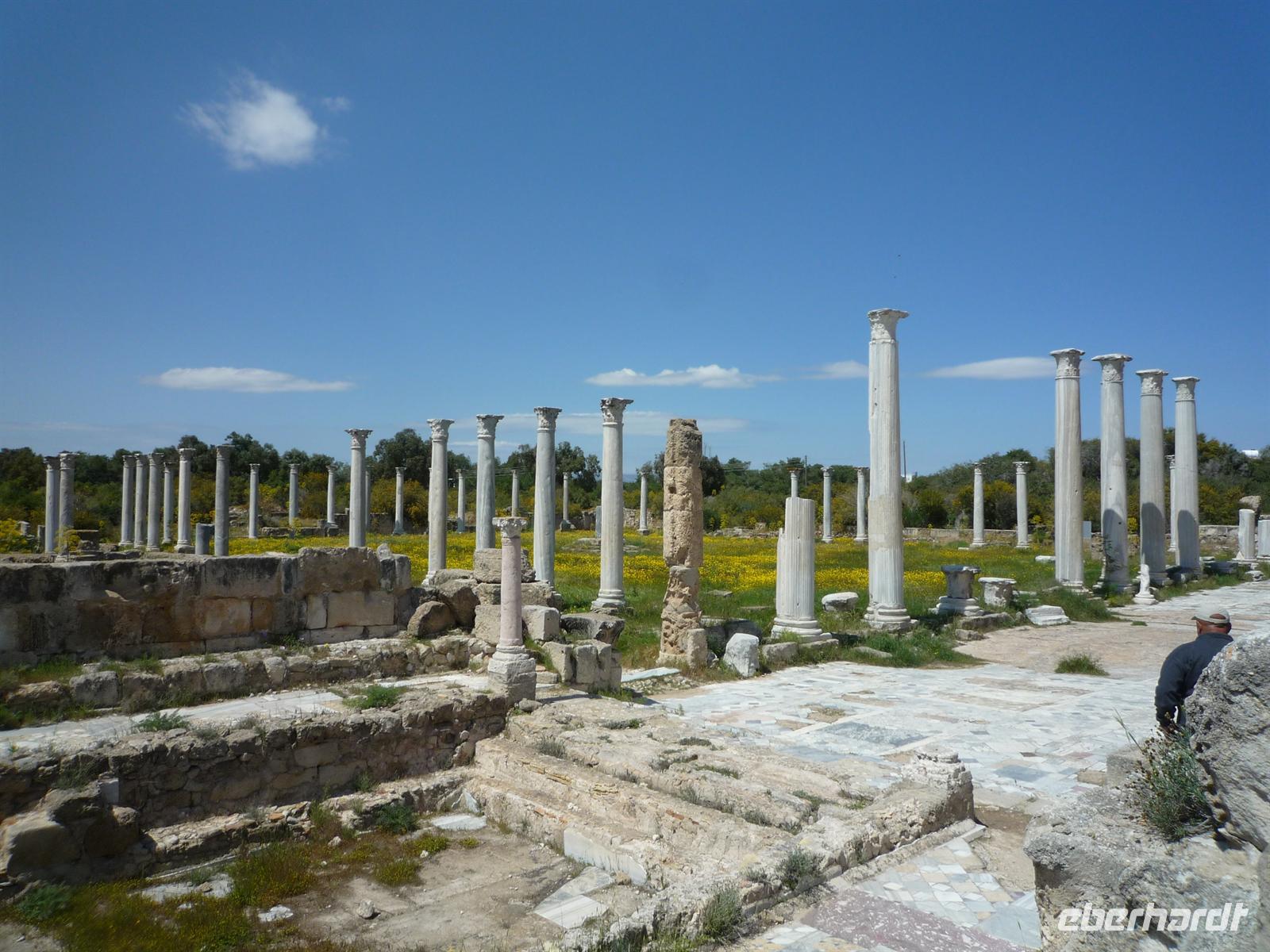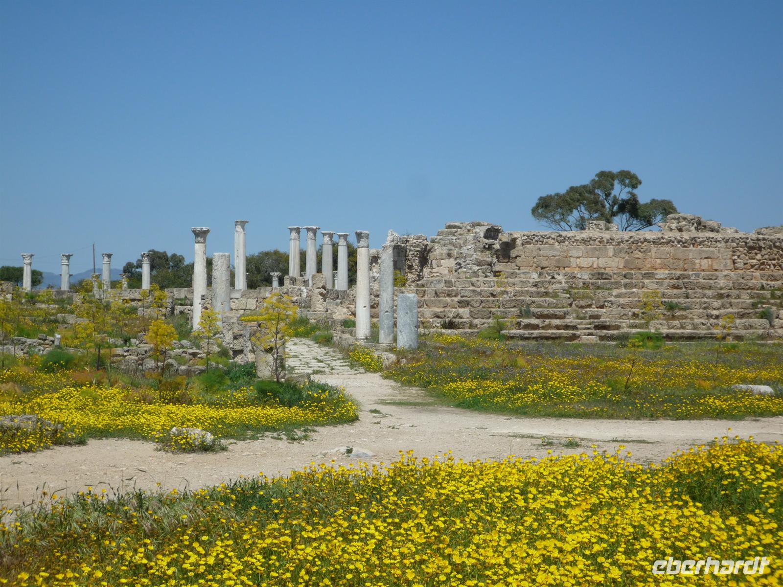 Das Grab und das Kloster des Apostels Barnabas bilden das erste Ziel des Tages. Bei strahlendem Himmel und herrlichem Sonneschein, aber doch etwas kühlem Wind lauschen wir den Erläuterungen Antonis’ über die ersten Schritte der Christianisierung der Insel. Im Kunstmuseum gibt uns Antonis einen ersten Einblick in die Ikonen-Malerei der byzantinischen Kunst. Auch in den nächsten Tagen wird uns dieses Thema ausführlich beschäftigen. Weiter führt uns der Weg nach Salamis, einer alten Ausgrabungsstätte. Die einstige Hauptstadt von Zypern war weit als 1100 v. Chr. im Besitz von den Assyrer, Ägypter, Perser, und Römer, aber überlebte Salamis schließlich. Dieses wunderschöne Gebiet mit den Ausgrabungen liegt in einem wunderschönen Wald aus Mimosen, Kiefern und Eukalyptenbäumen. Das Theater mit 50 Sitzreihen für 15.000 Zuschauern ist die zweitgrößte spektakulärste Sehenswürdigkeit.
