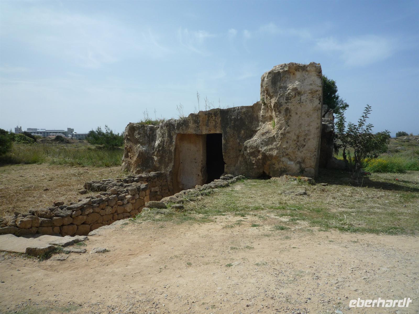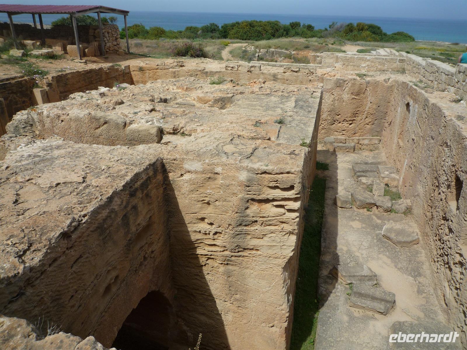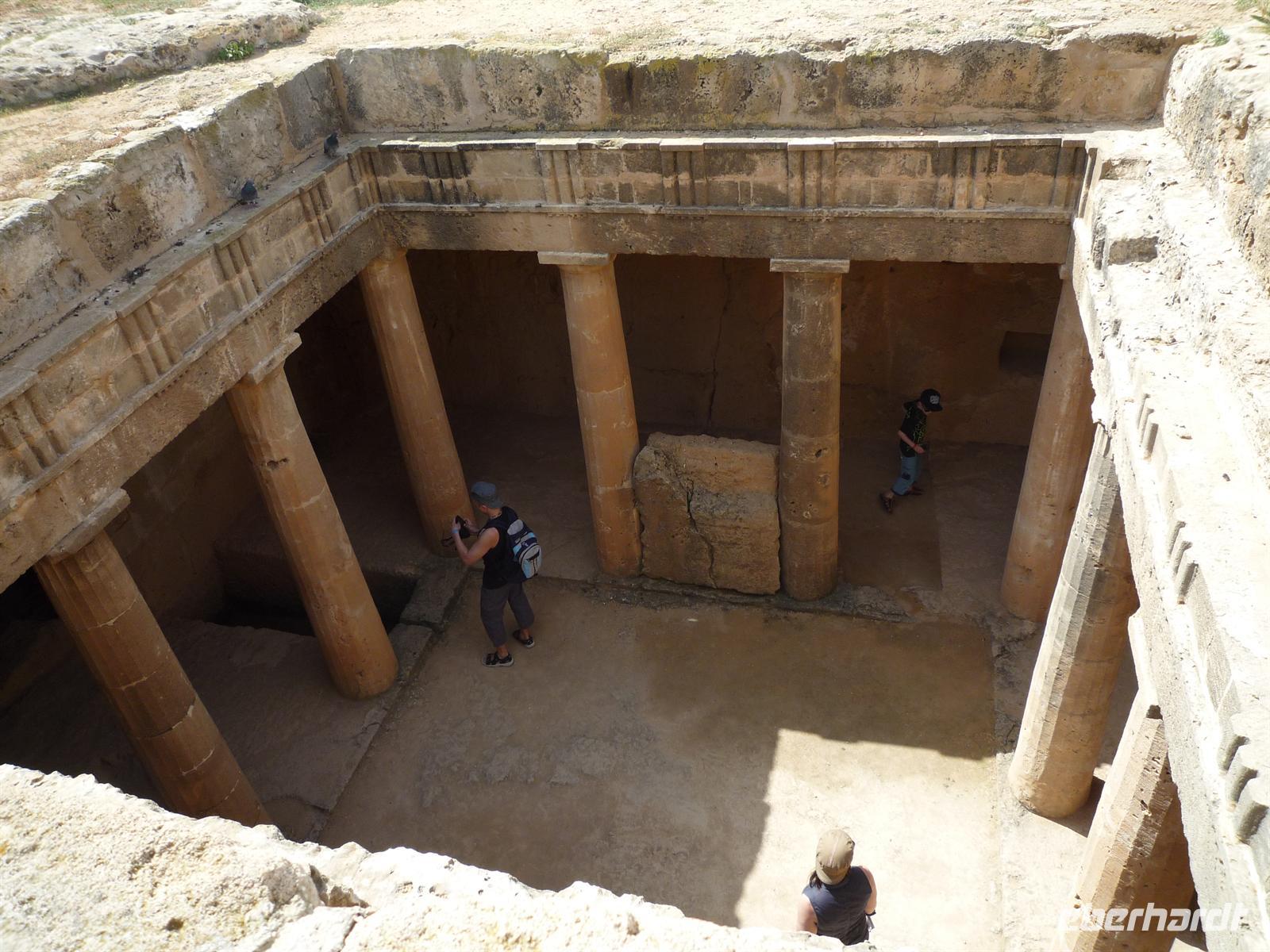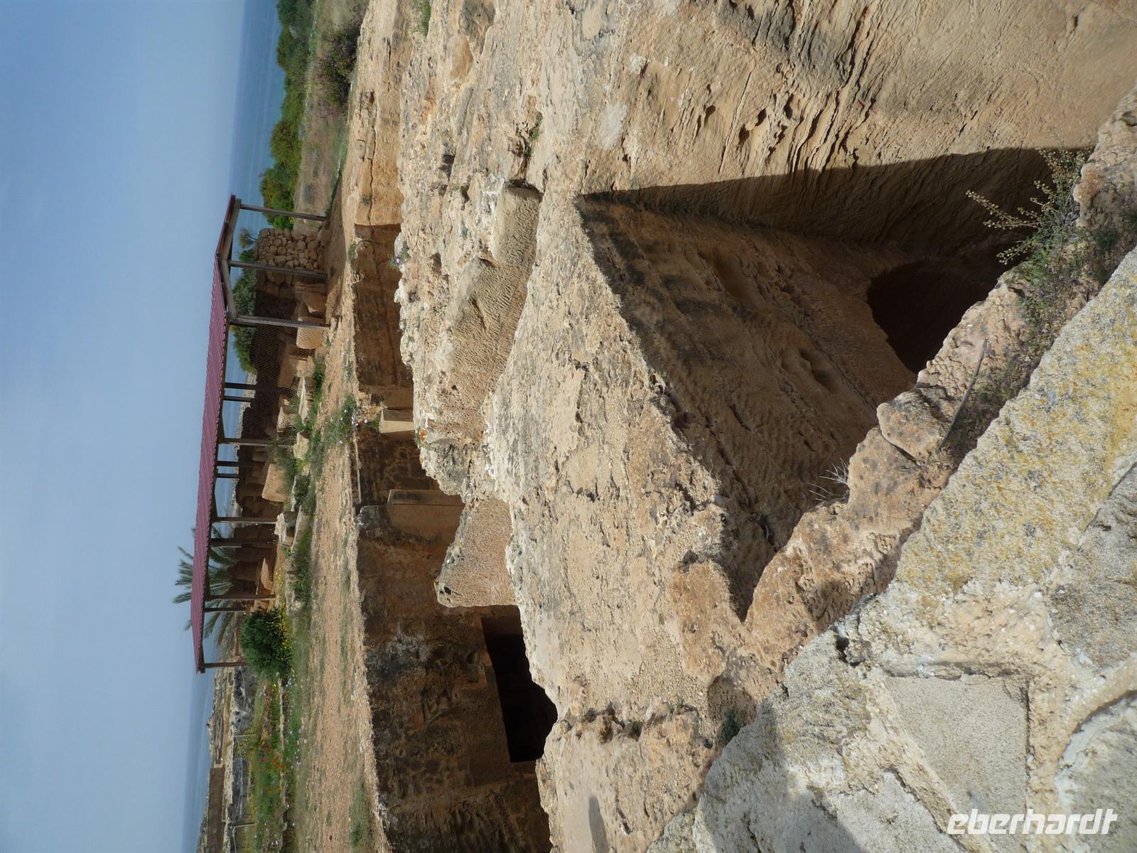 Weiter geht es dann zu den Königsgräbern, dem Friedhof der Oberschicht in der hellenistischen Blütezeit. Wir erfahren, dass die Steine der antiken Ruinen sämtlich zum Bau des Suez-Kanals verwendet wurden und nur die unterirdischen Grabkammern übrig bleiben konnten. Anschließend fahren wir etwas außerhalb in eine kleine Taverne, wo wir bei herrlichem Wetter ein Pita-Brot gefüllt mit Souvlaki und Gemüse genüsslich verspeisen.