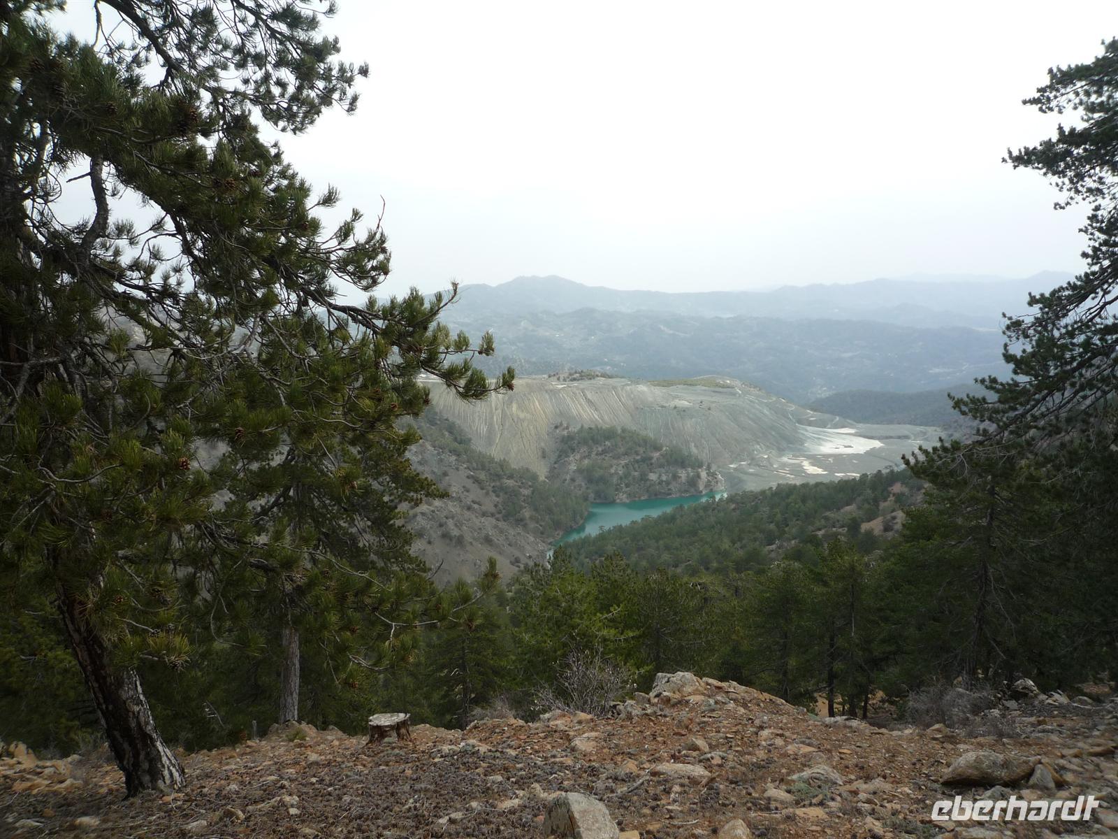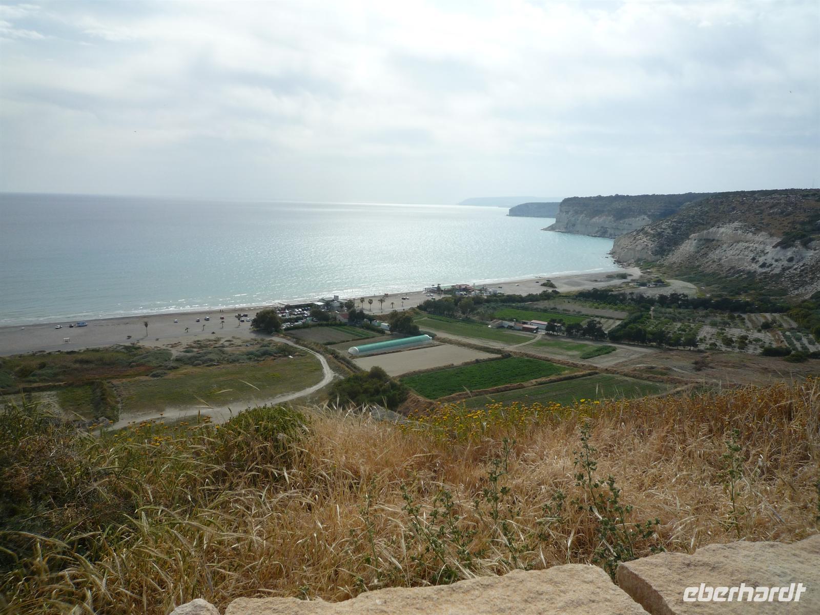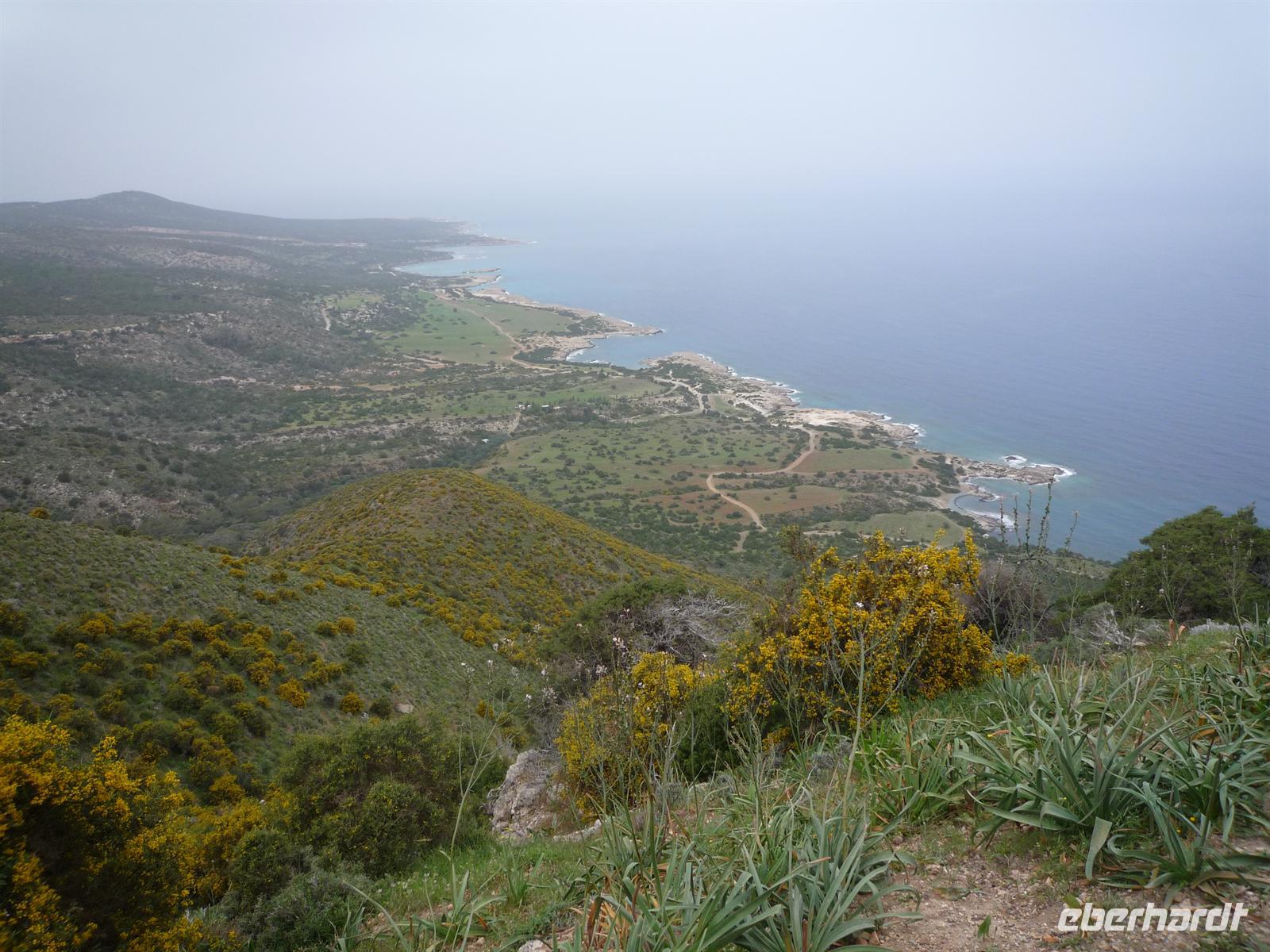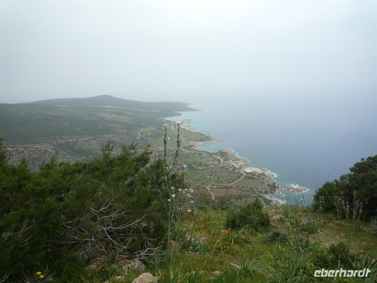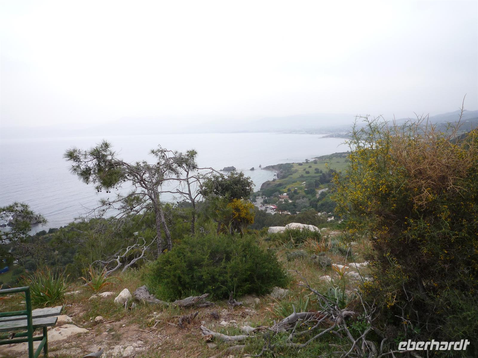 Anschließend steht eine lange Wanderung auf dem Programm. Gemeinsam starten wir vom Bus ein Stück des ebenen Weges. Wir sehen das Bad der Aphrodite, ein idyllisch gelegener Teich, umgeben von wucherndem Grün. Der Sage nach sei Aphrodite hier von Akamas beim Baden überrascht worden und habe sich in ihn verliebt. Ein Bad hier verspricht ewige Jungend. Dann trennen sich die Wanderer von den Genießern, die nur ein Stück nach Lust und Laune den ebenen Weg entlang wandern. Die Wanderer hingegen besteigen den doch recht steilen und steinigen Weg hinauf. Es gilt 300 Höhenmeter zu bewältigen. Wir steigen weiter in hinauf in luftige Höhen und werden nach jedem Schritt mit fantastischen Ausblicken auf das unter uns liegende türkisblaue Meer und die dunkelgrüne Küstenlandschaft belohnt. Circa drei Stunden wandern wir so auf und ab, meist mit Blick zum Meer. Einige Pausen tun gut und wir genießen die herrliche Aussicht.
