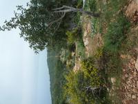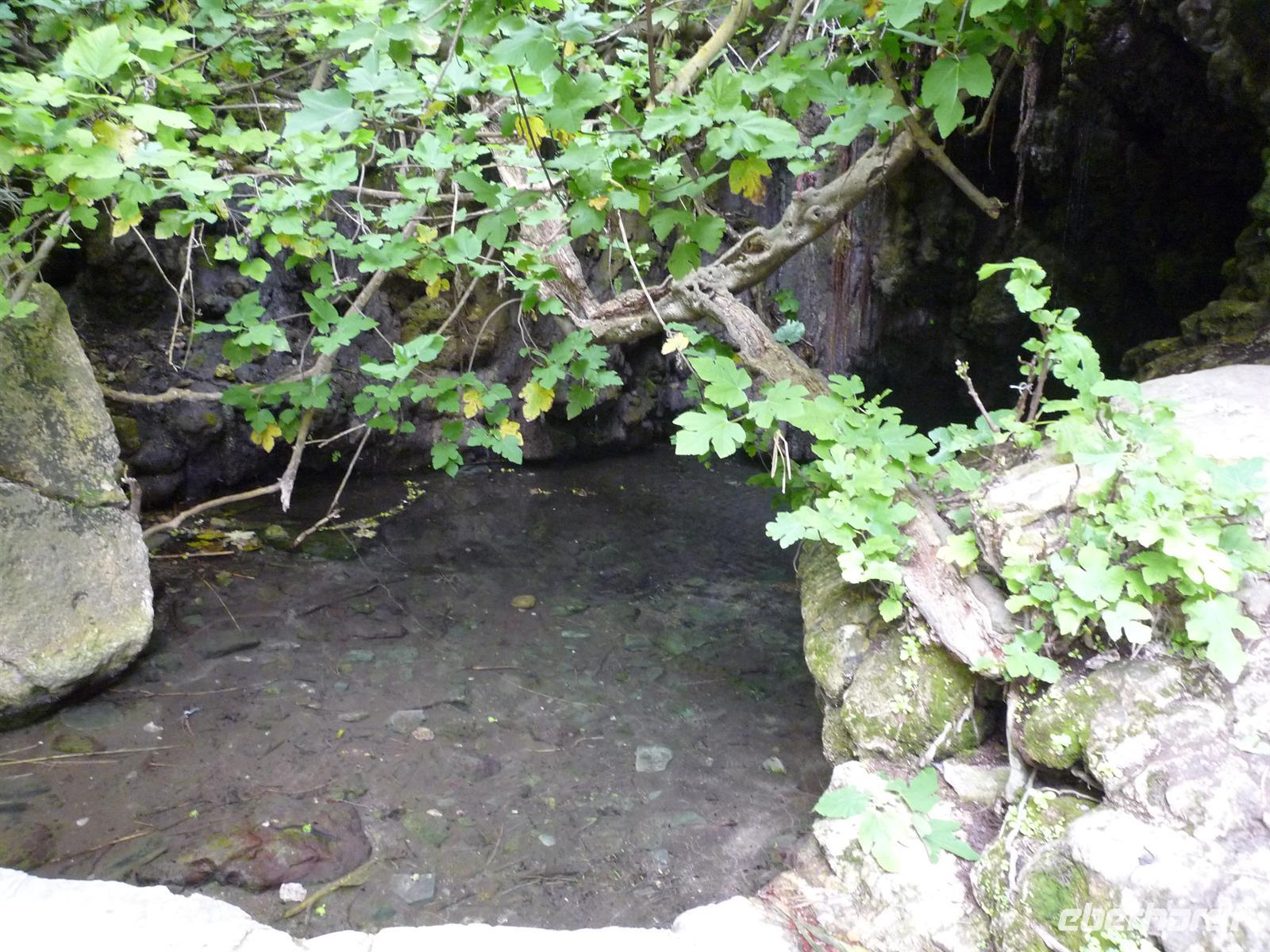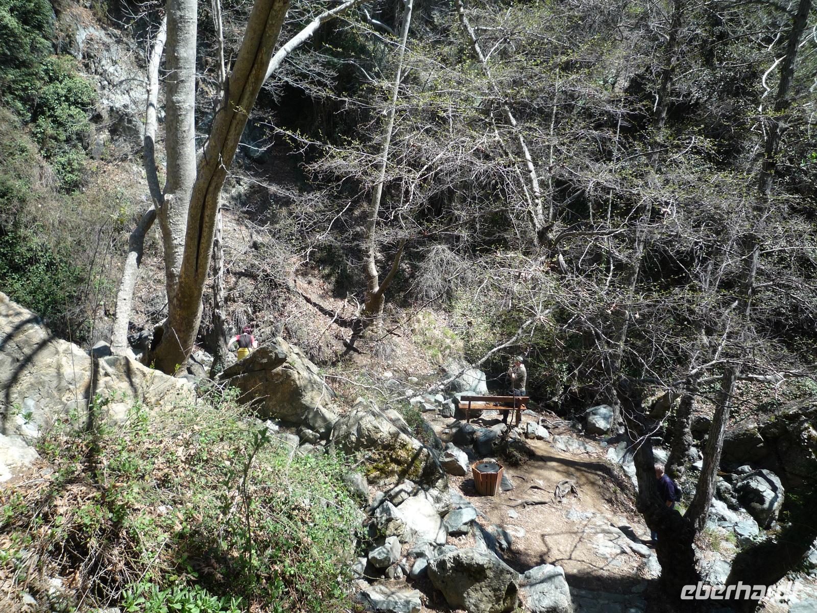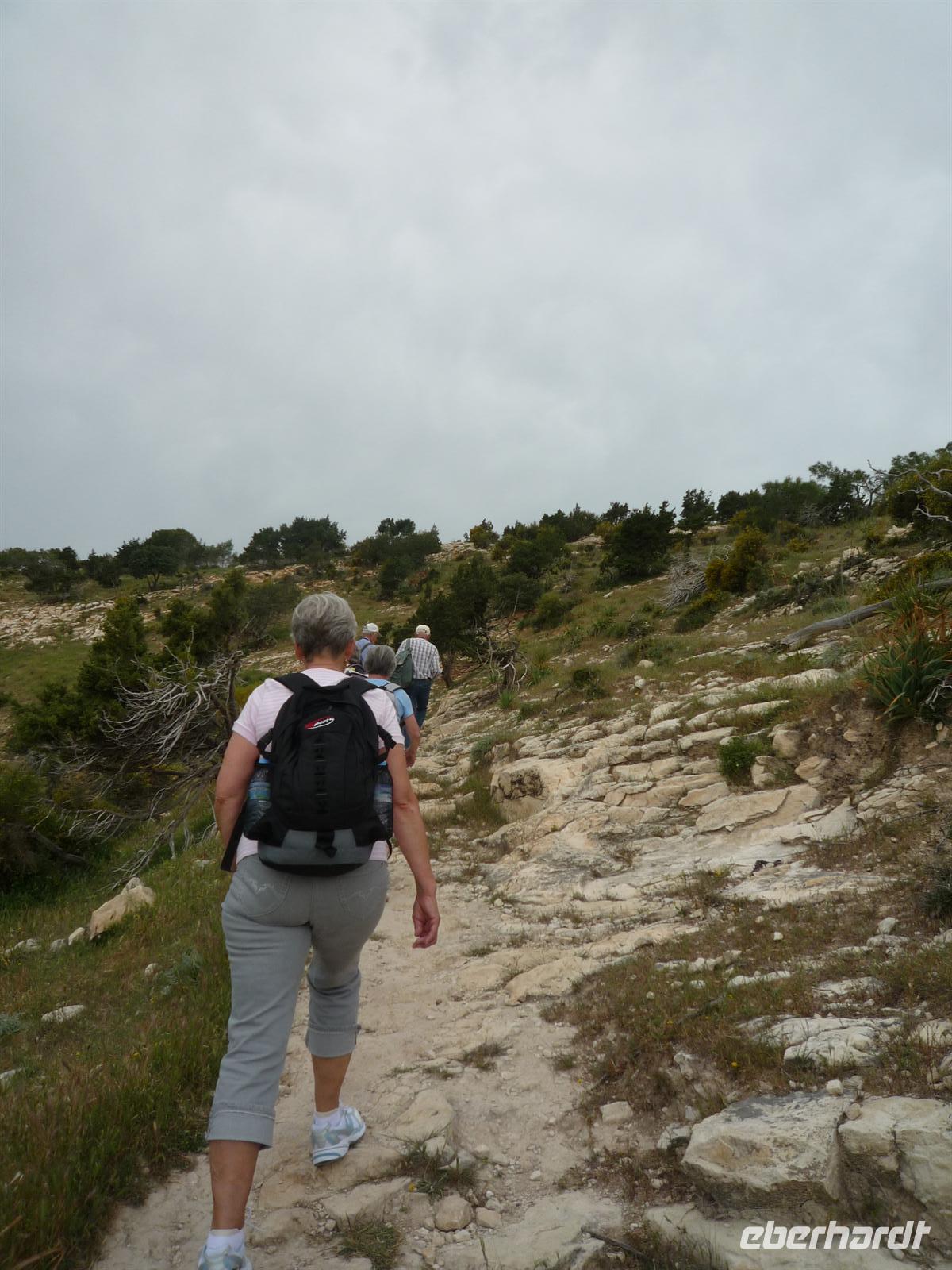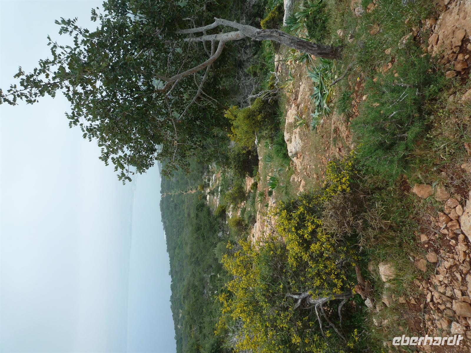 Anschließend steht eine lange Wanderung auf dem Programm. Gemeinsam starten wir vom Bus ein Stück des ebenen Weges. Wir sehen das Bad der Aphrodite, ein idyllisch gelegener Teich, umgeben von wucherndem Grün. Der Sage nach sei Aphrodite hier von Akamas beim Baden überrascht worden und habe sich in ihn verliebt. Ein Bad hier verspricht ewige Jungend. Dann trennen sich die Wanderer von den Genießern, die nur ein Stück nach Lust und Laune den ebenen Weg entlang wandern. Die Wanderer hingegen besteigen den doch recht steilen und steinigen Weg hinauf. Es gilt 300 Höhenmeter zu bewältigen. Wir steigen weiter in hinauf in luftige Höhen und werden nach jedem Schritt mit fantastischen Ausblicken auf das unter uns liegende türkisblaue Meer und die dunkelgrüne Küstenlandschaft belohnt. Circa drei Stunden wandern wir so auf und ab, meist mit Blick zum Meer. Einige Pausen tun gut und wir genießen die herrliche Aussicht.
