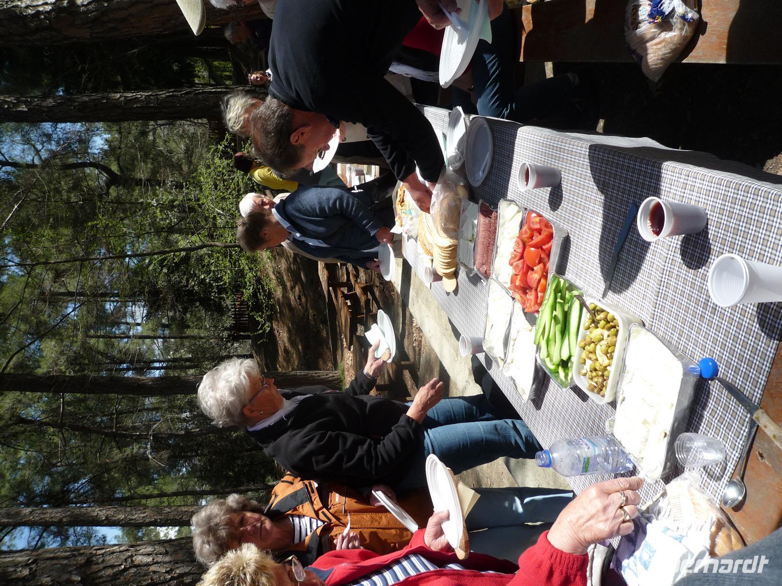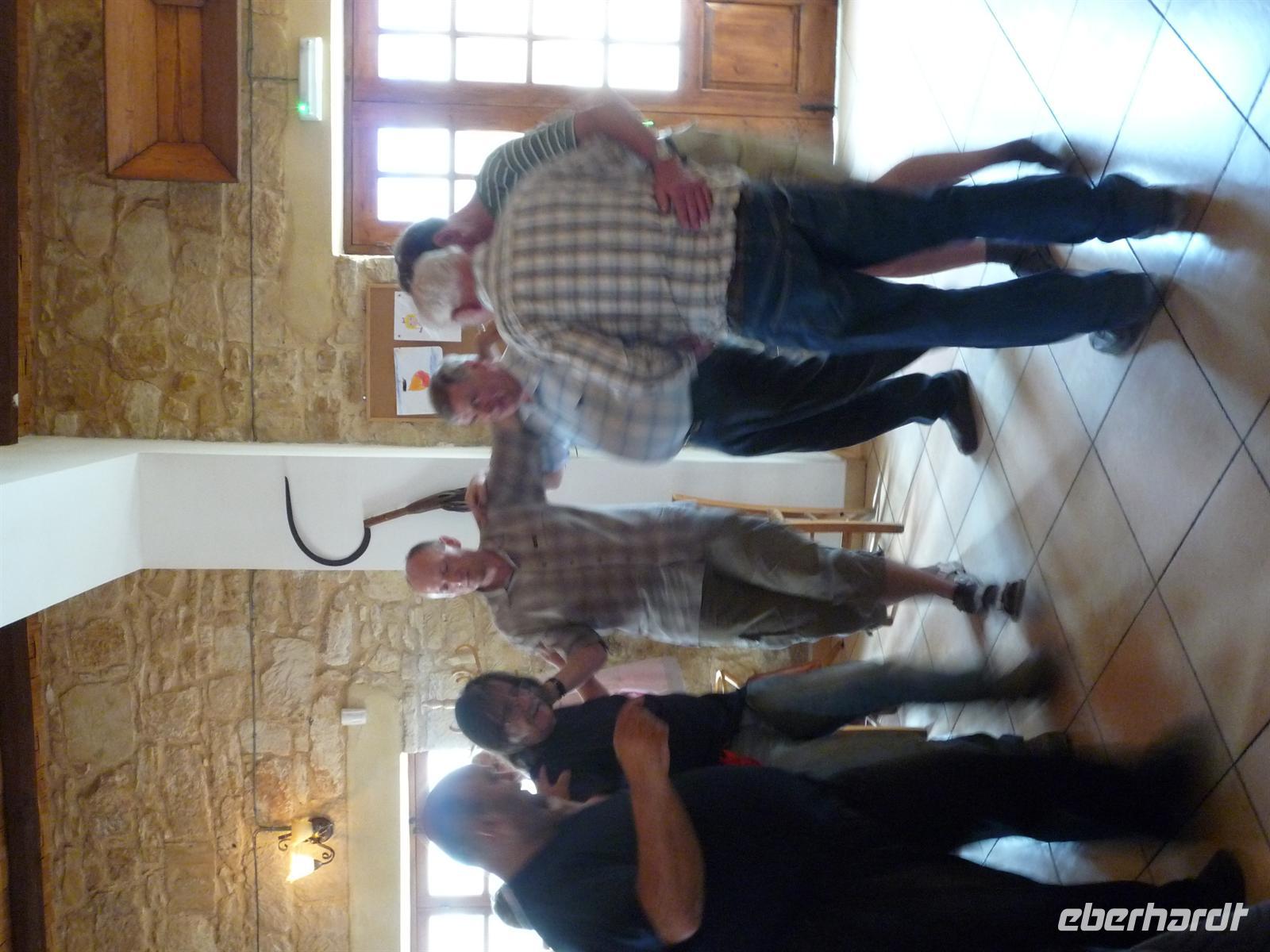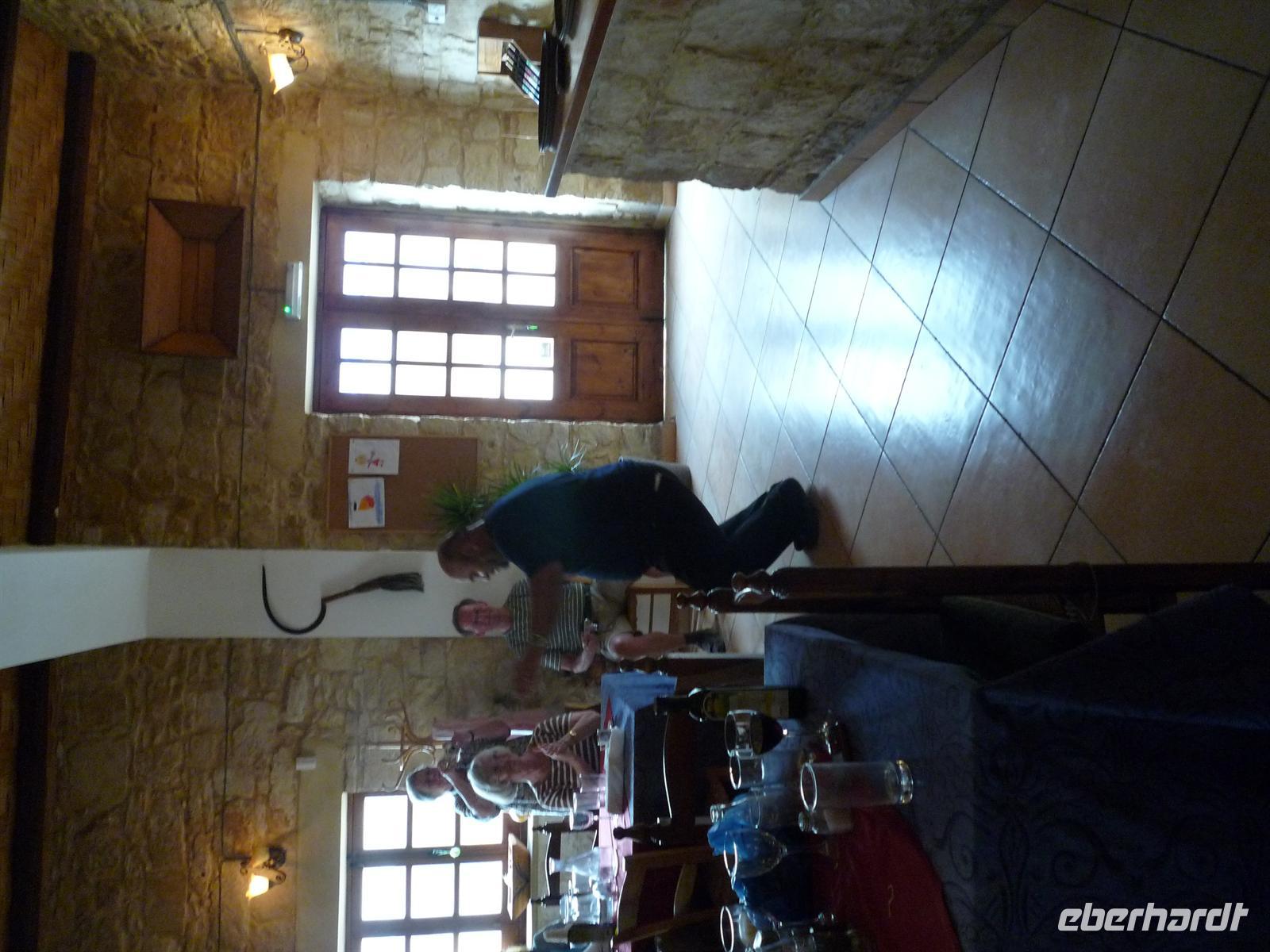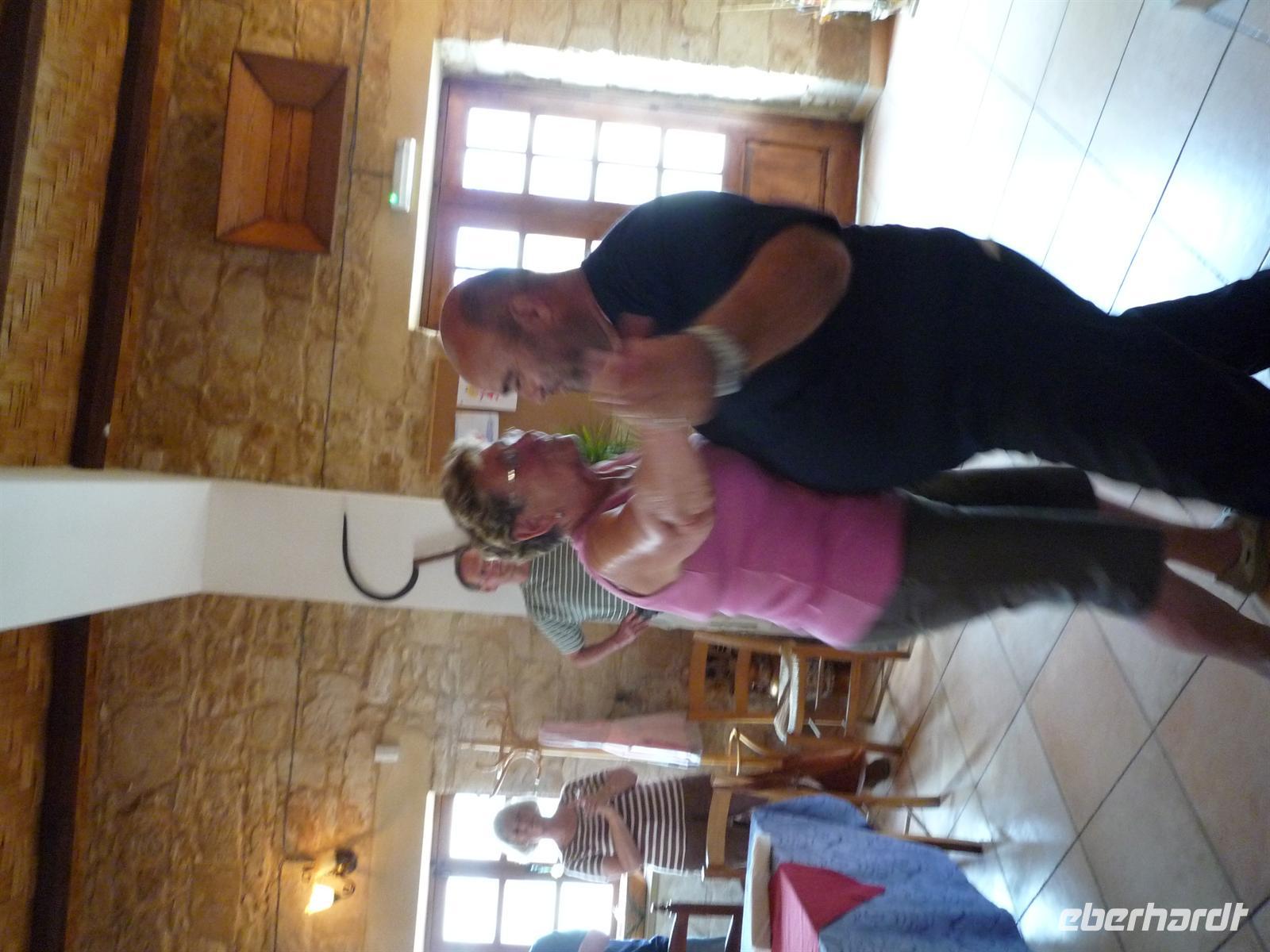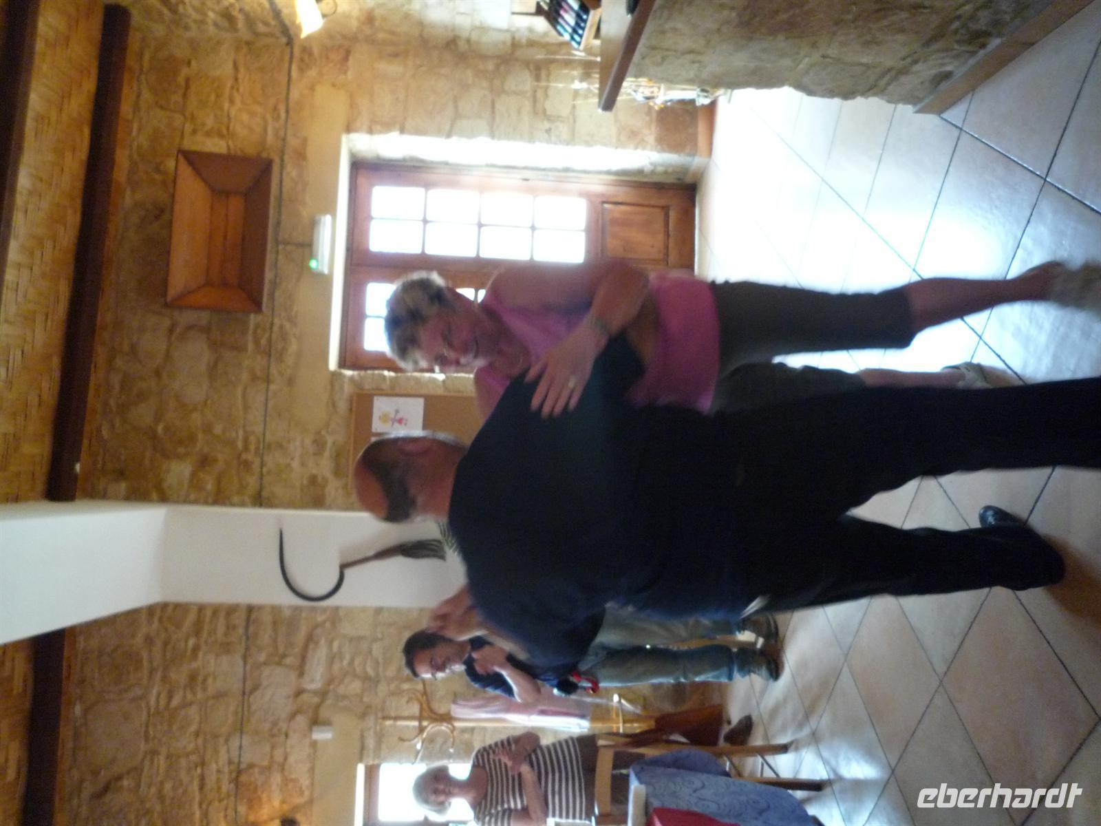 Gegen Mittag erreichen wir den Ausgangspunkt und treffen wieder auf unsere Genießer. Gemeinsam fahren wir nach Kathikas, wo in der Taverne unser Abschlussessen wartet. Es ist nochmals ein Meze-Essen, das traditionelle zypriotische Essen. Zusammensetzung und Menge variieren stark, es ist eher die Situation, welche diese Speise definiert, nicht ihre Art. Es waren Oliven, aufgespießte gebackene Kartoffeln, Käse, kleine Fischchen, gebackenes und rohes Gemüse oder alle Sorten Obst. Es gibt Wein, so viel wir mögen, die Stimmung ist gut. Wir genießen die verschiedenen Gänge mit Fleisch und Gemüse. Nachdem wir alle satt und zufrieden waren, überraschte uns Antonis noch mit einem zünftigen Sirtaki. Erbittet zuerst einige Damen nach vorn, um mit Ihnen zu tanzen und anschließend bemühen sich auch die Herren unserem Antonis zu folgen. Wir staunen wirklich nicht schlecht, wie unser Antonis plötzlich tanzt und es macht einen riesigen Spaß.