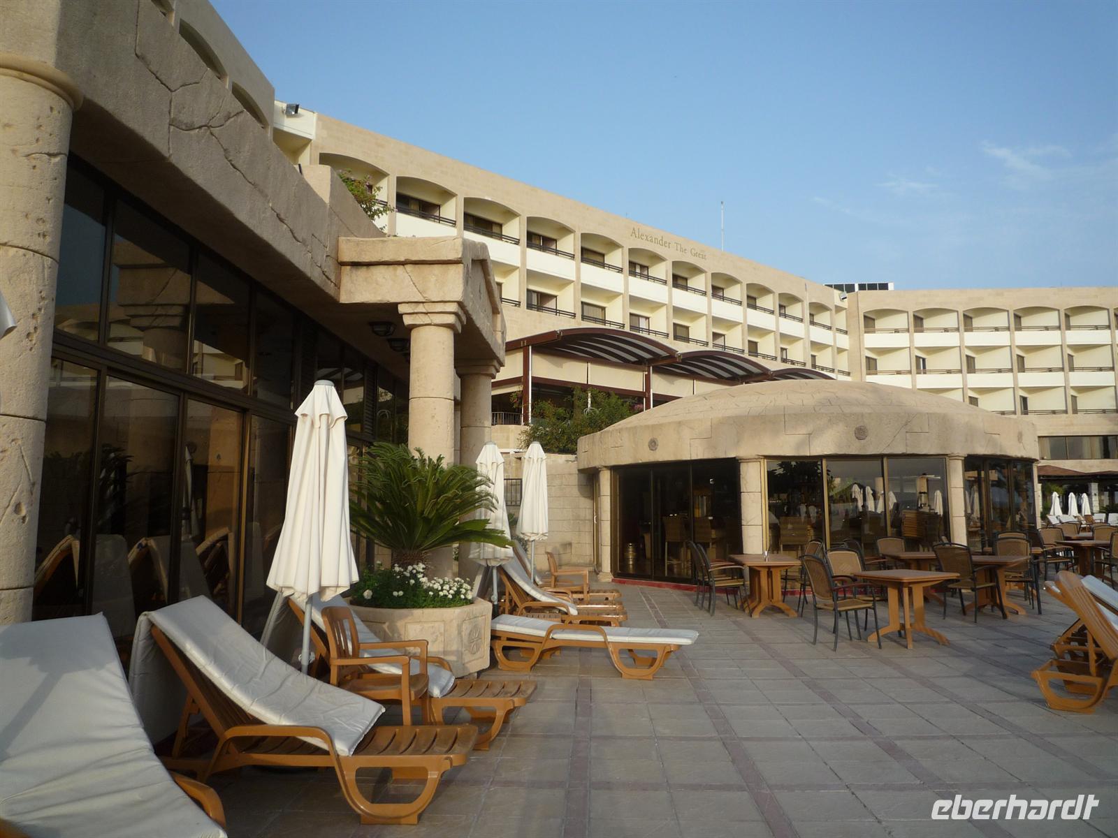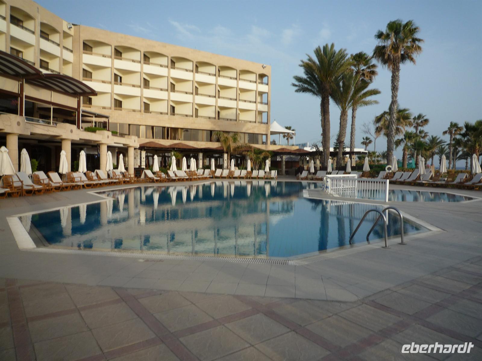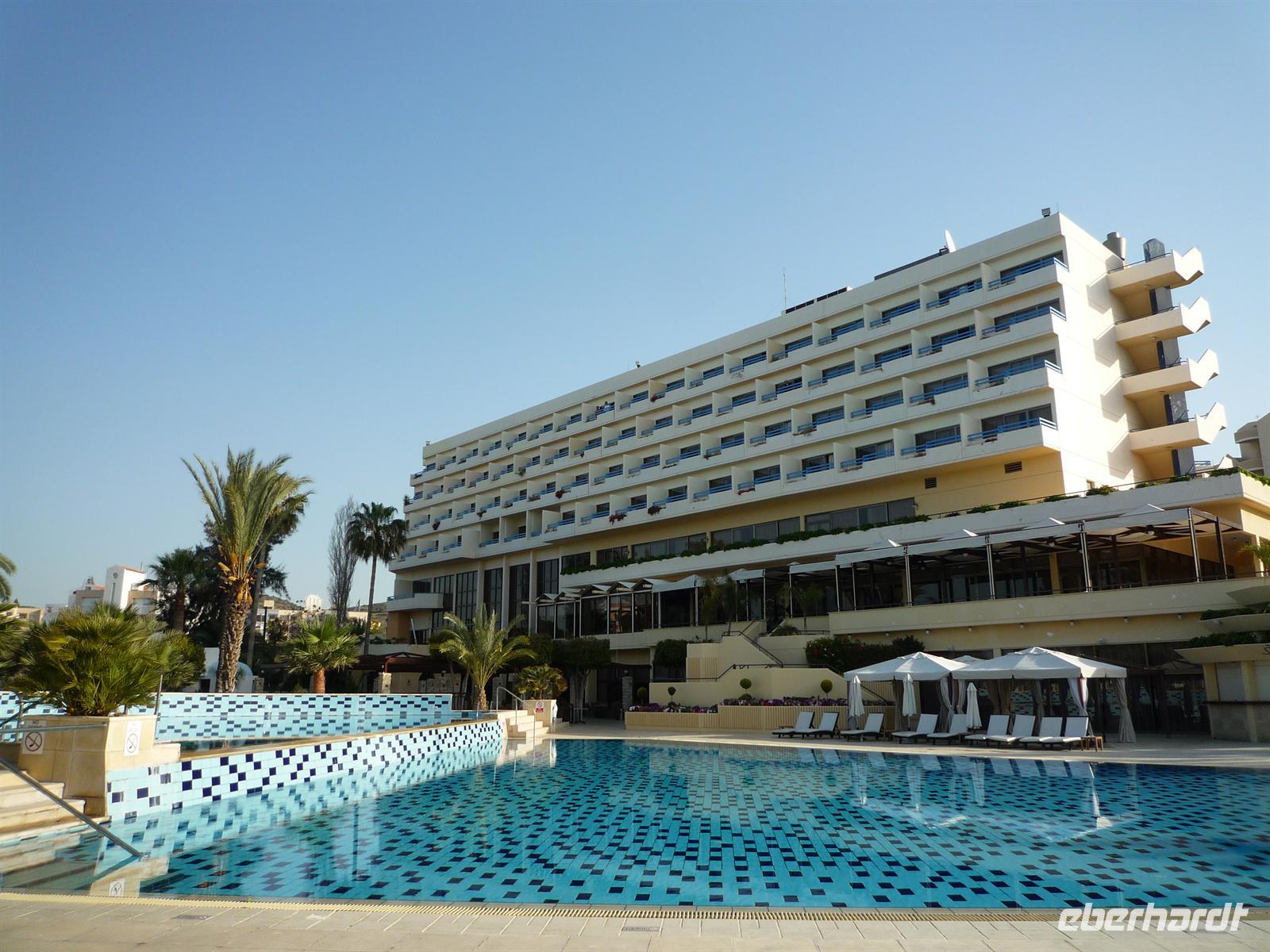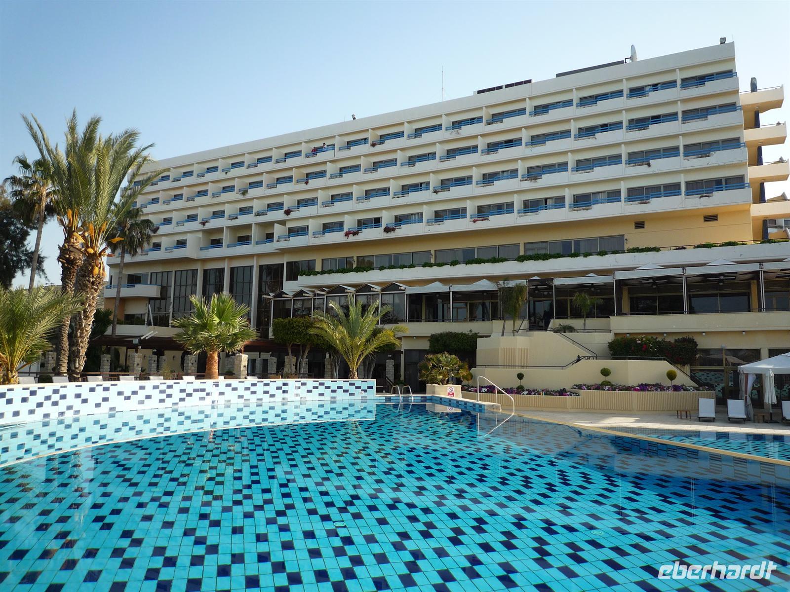 Wir erreichen unser Hotel nach kurzer Fahrt. Als Begrüßungsgetränk reicht Antonis Brandy Sour, der bekannteste Cocktail der Insel. Das Hotel ist herrlich am Meer gelegen und der Hafen von Pafos ist entlang der herrlichen Uferpromenade zu erreichen. Es gibt einen großen Außenpool, aber auch einen Innenpool - wir freuen uns schon auf die nächsten Tage in diesem Hotel.