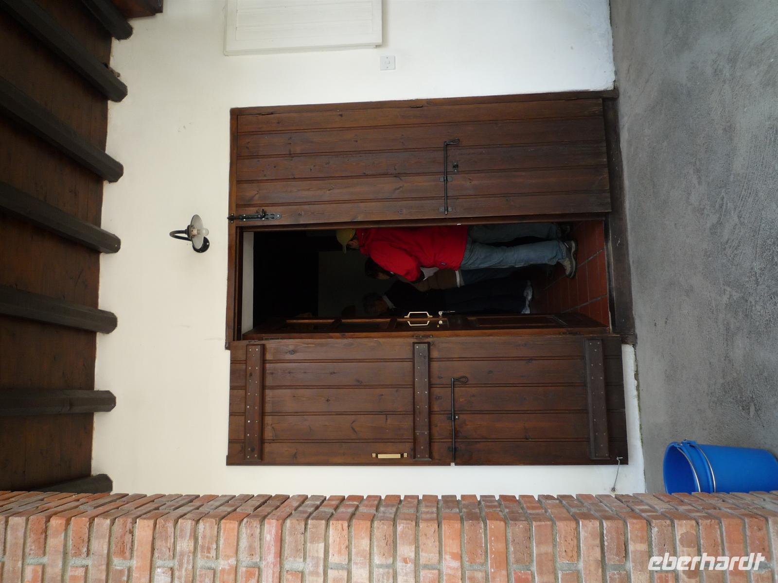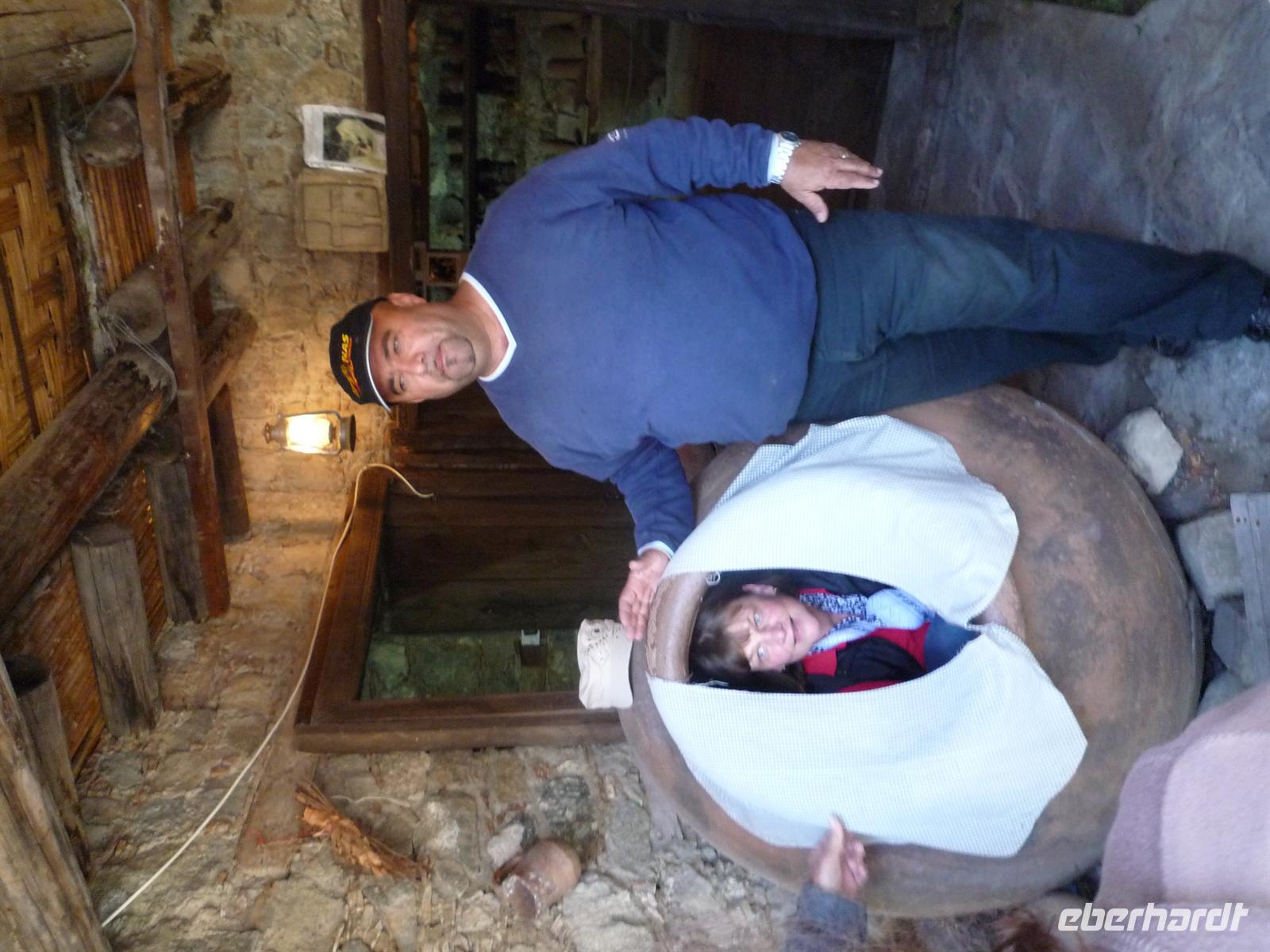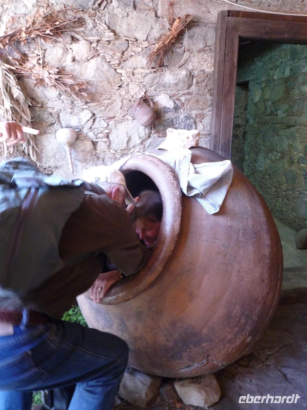 Zur Mittagszeit kehren wir in eine urige Taverne im Bergdorf Phini ein und verzehren erneut ein reichhaltiges Meze-Essen, u.a. mit Linsen, Schweinefleisch mit Kartoffeln, gefüllten Weinblättern und gegrilltem Fleisch. Nach reichlich Wein geht es gut gelaunt zum Erlebnis-Museum von Herrn Pilavakis, Modedesigner und Eigentümer des Museums. Herr Pilavakis, seit 12 Jahren 75 Jahre jung, begrüßt uns herzlich und erläutert uns seine Ausstellungsstücke. Wir danken unseren beiden Damen, die sich für die anschauliche Vorführung zur Verfügung gestellt haben. Wir lernen den „Saunastuhl“, das „Hochzeitsbett“ oder den „Melkeimer“ kennen.