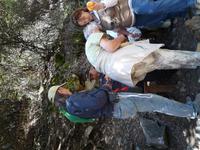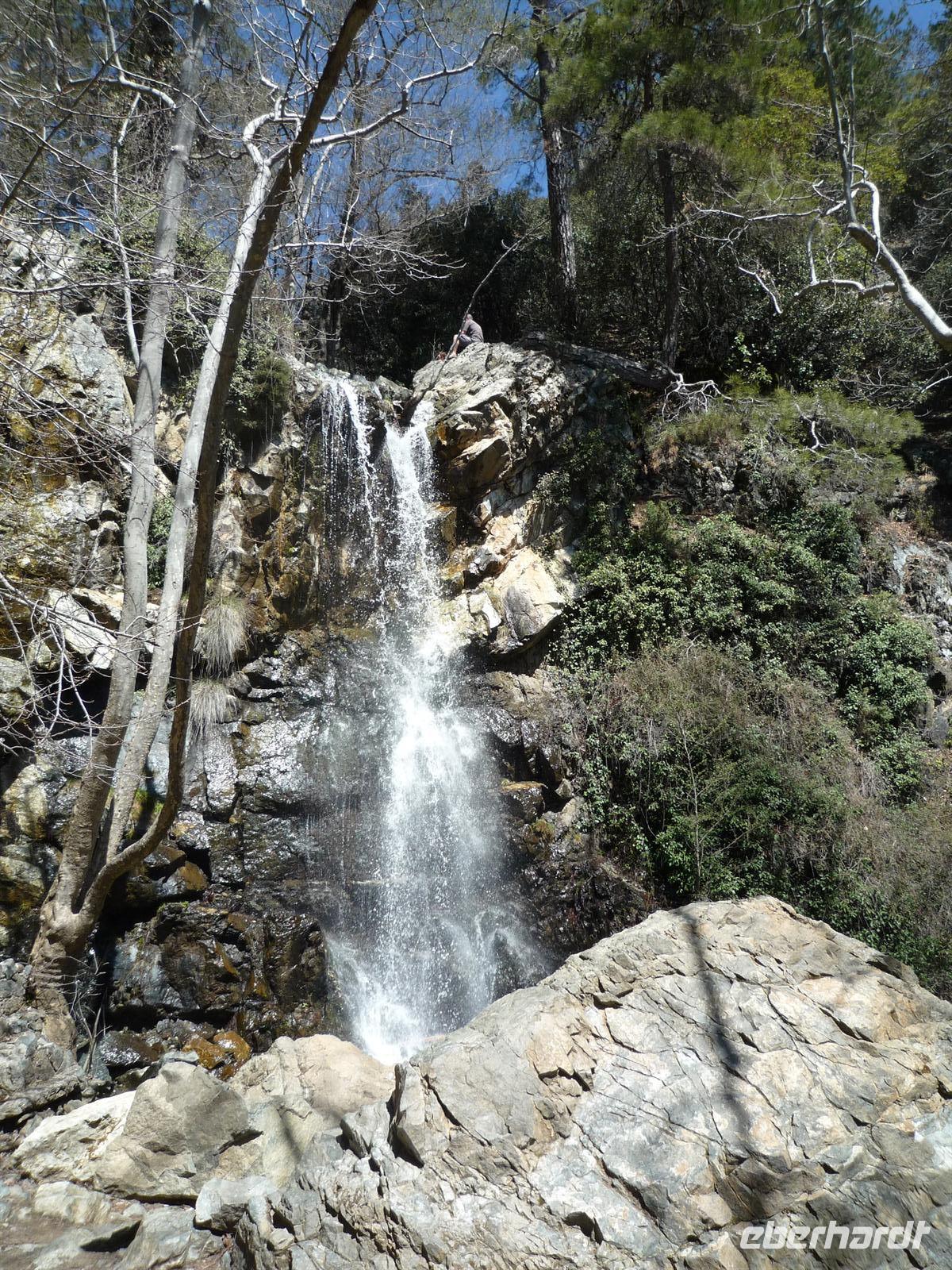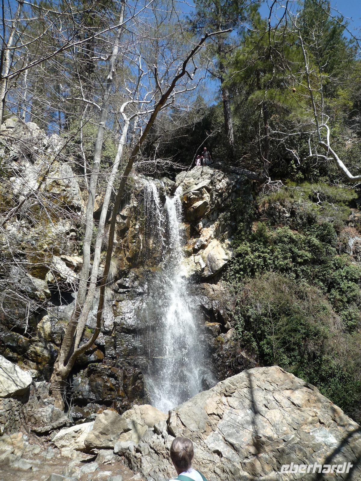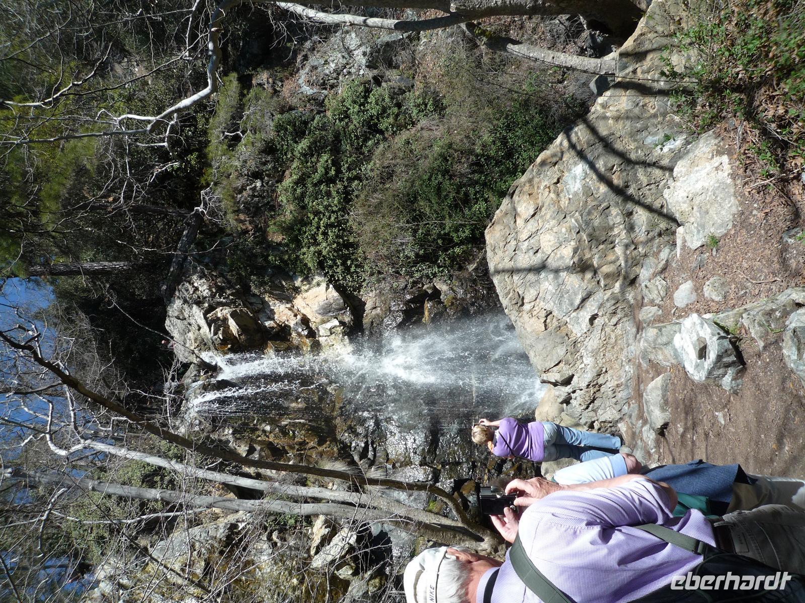 Die Fahrt mit dem Oldtimer-Bus führt uns weiter zum Ausgangspunkt unserer kleinen Wanderung zu den Kalydona-Wasserfällen. Der Anstieg führt zunächst etwas steil ca. 100 Meter hinauf, wird dann aber flacher und leicht begehbar. Wir erreichen die Wasserfälle nach einer guten Stunde Fußmarsch. Zur großen Überraschung unserer Reisegäste öffnet Antonis, Reiseleiter und Seelsorger der Gruppe, seinen Rucksack und verteilt an alle Reisegäste frische Orangen, die genüsslich in zauberhafter Natur verspeist werden. Eine gelungene Überraschung!