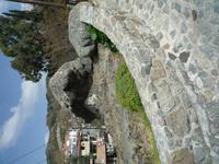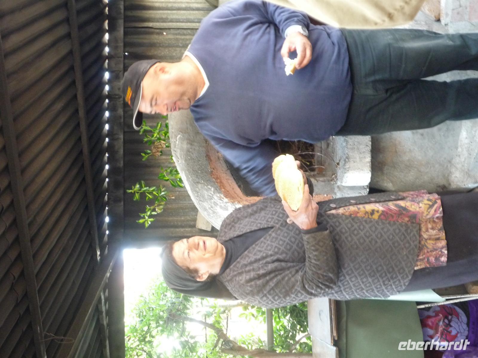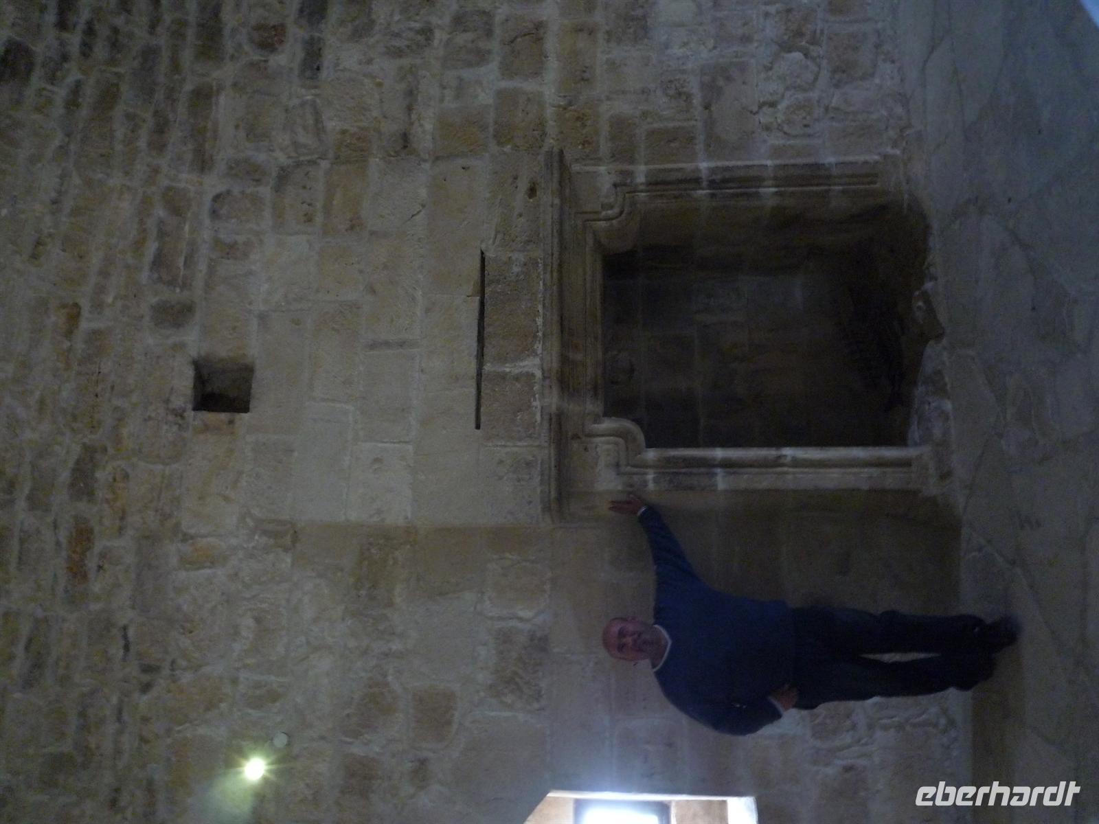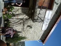 Nach einem kleinen Spaziergang im Dorf erreichen wir die Heilig-Kreuz-Kirche, die extra für uns aufgeschlossen wird. Im Inneren gibt es erneut viele Wandgemälde zu bewundern und natürlich das Heilige Kreuz. Antonio erläutert uns ausführlich die Gemälde und deren Bedeutung in der Kunstgeschichte. Weiter führt uns der Spaziergang durch das Dorf wieder zu unserem Bus. Kurz bevor wir diesen erreichen ruft Antonio plötzlich „Stalin“, da ist er nun und er hört auch wirklich auf den Namen. Wir können es kaum glauben, aber es ist wahr: der grauhaarige, etwas untersetzte freundliche ältere Dorfbewohner heißt tatsächlich Stalin. Stalin begrüßt uns freundlich und schenkt jedem eine Handvoll Mandeln. Wir fotografieren ihn und uns und wir werden die Begegnung nicht so schnell vergessen.