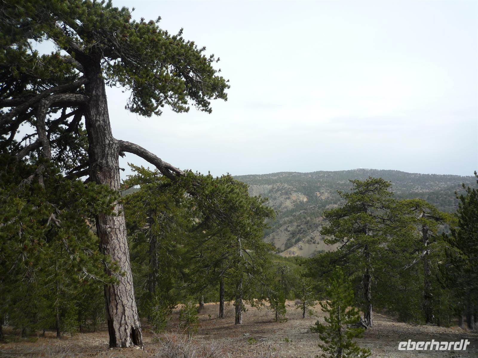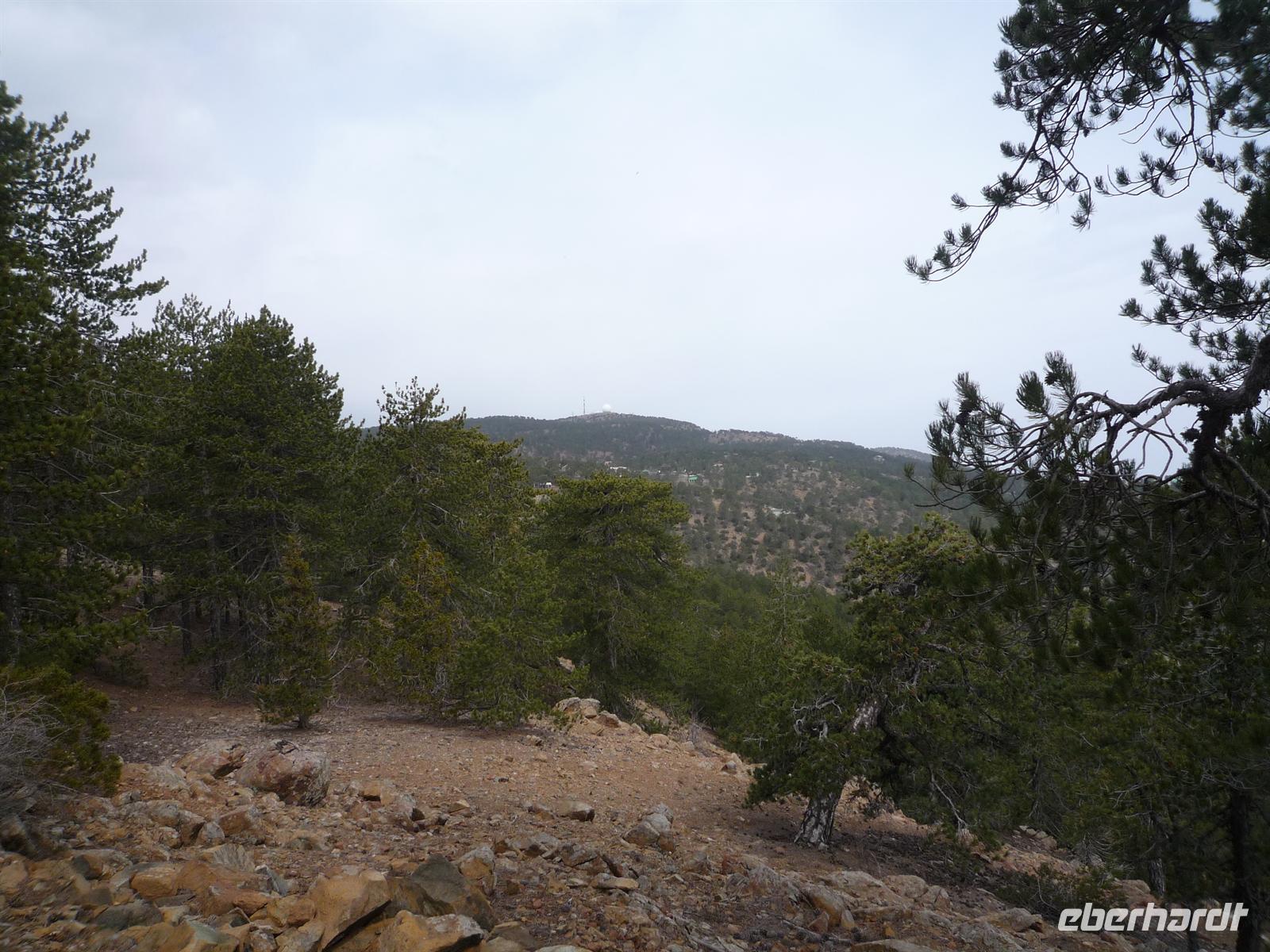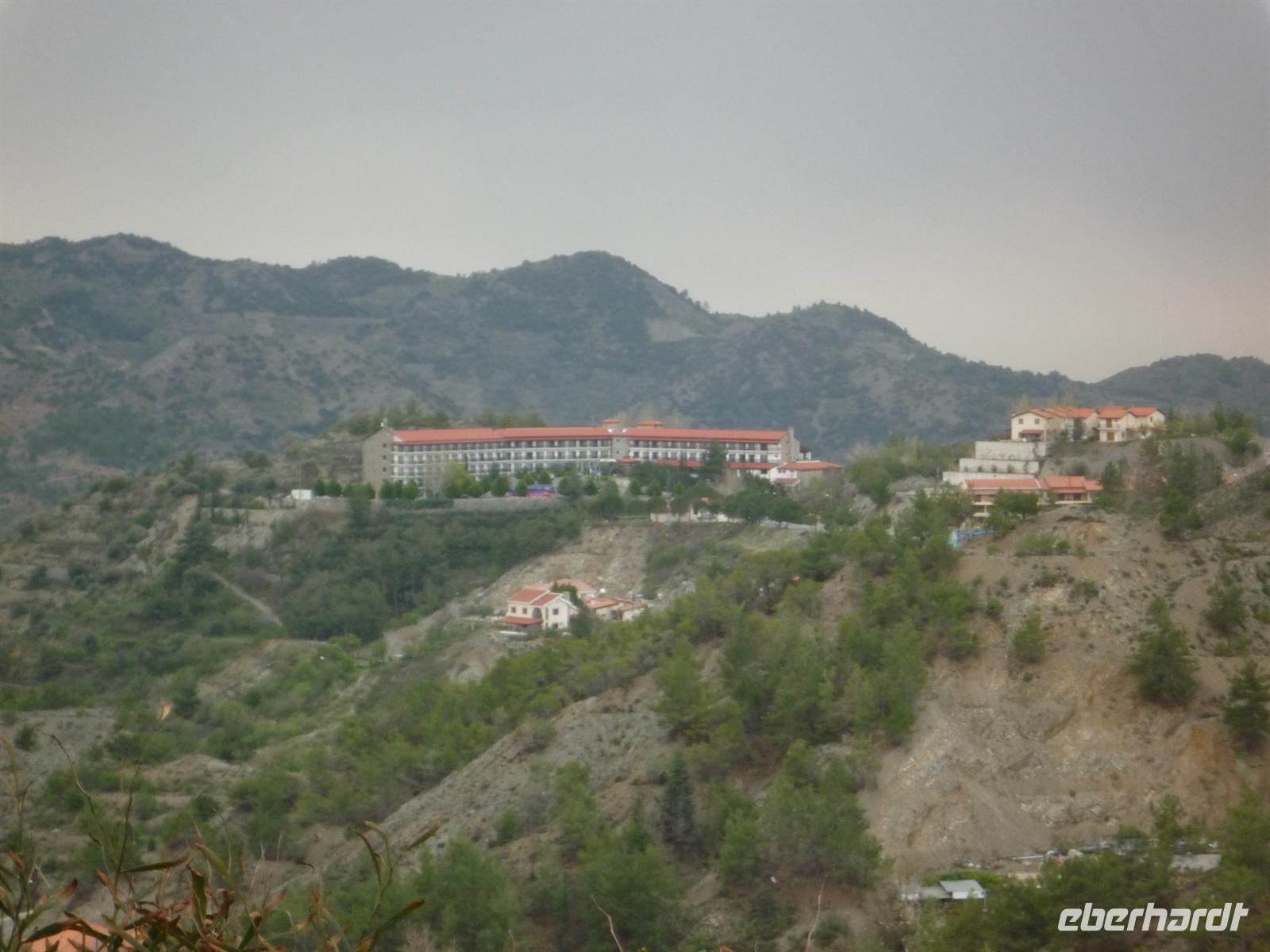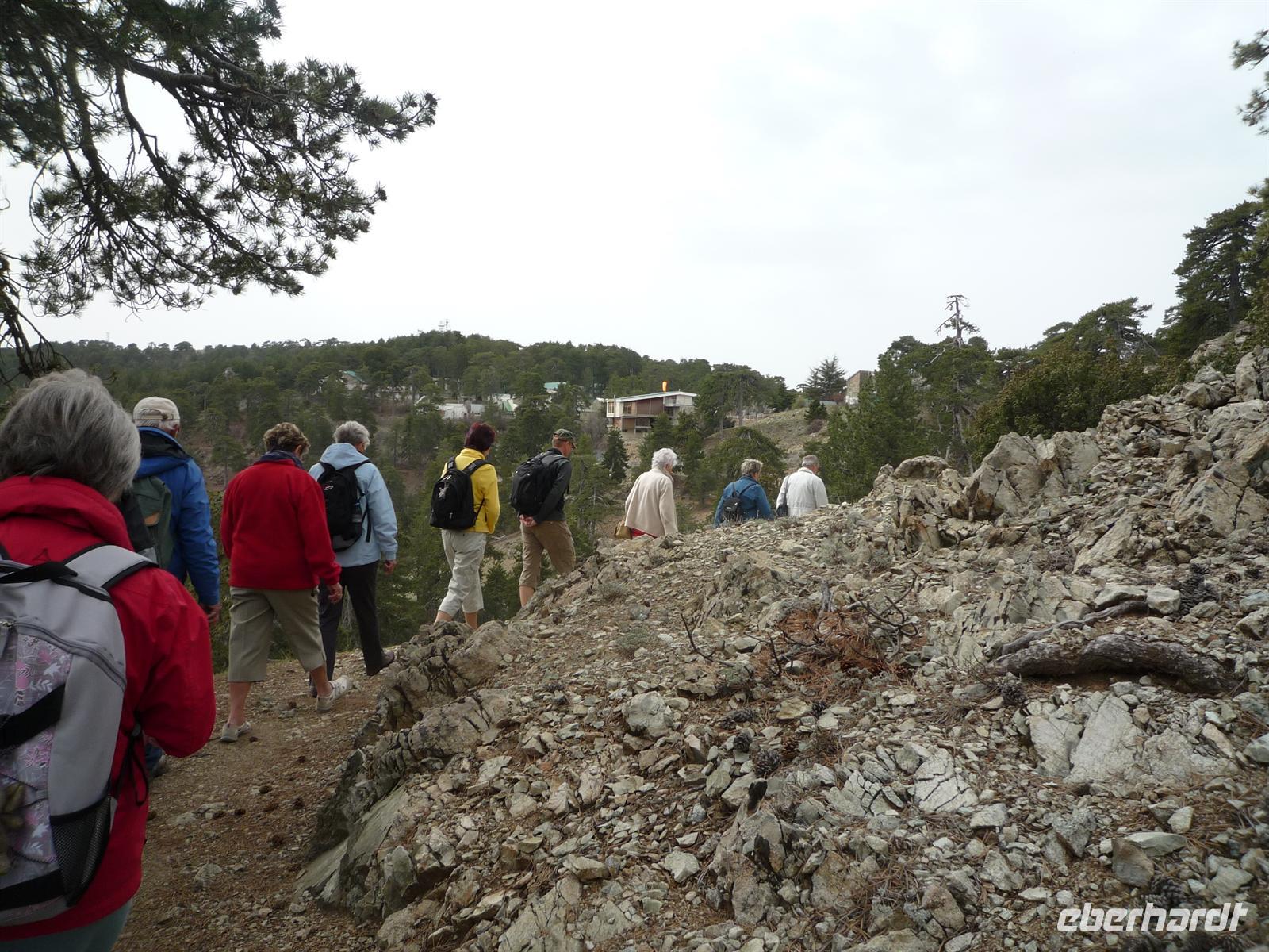 Heute verlassen wir unser Berghotel. Nach einem Fotostopp mit Blick auf das herrlich in die Bergwelt eingerahmte Hotel und einem Stopp am ehemaligen Kinder-Sanatormium in Kyperounta führt uns die Fahrt zum Trodos-Plateau. Unterwegs erzählt uns Antonios viel Interessantes über die Steinformationen und den Vulkanismus auf der Insel. Von dort startet unsere heutige Wanderung im Trodos-Gebirge Persephone-Höhenwanderweg. Auf einer Höhe zwischen 1700 und 1800 Metern atmen wir die herrlich frische und klare Luft und genießen die Aussicht auf den berühmten „ Olymp“, blicken auf den größten Stausee der Insel und die ausgedehnten Pinien, Kiefern- und Zedernwälder. Immer mit Blick auf den „Oymp“, den höchsten Punkt de Trodos-Gebirges, der von einer britischen Radarstation gekrönt wird, wandern wir entlang breiter gerader Wege. Zwischendurch haben sich doch ein paar Regentropfen zu uns verirrt, aber das macht unserer Wanderlust keinen Abbruch.
