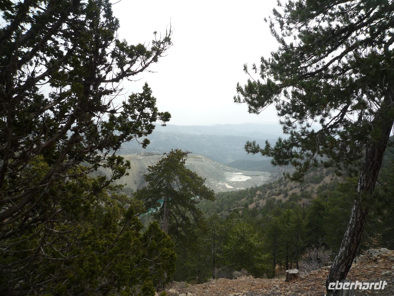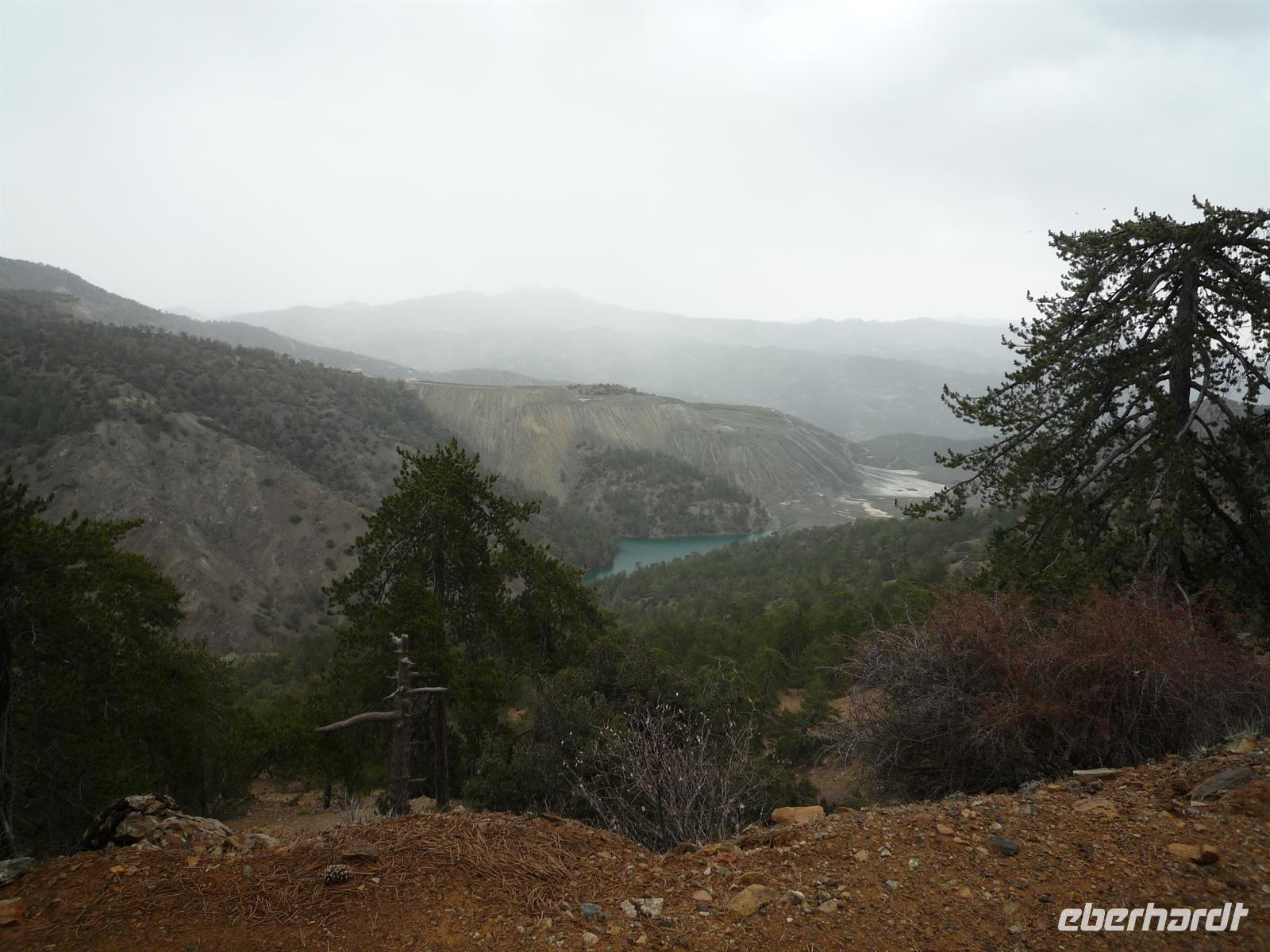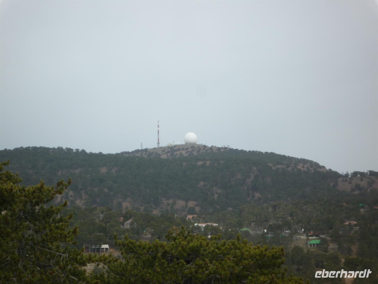Heute verlassen wir unser Berghotel. Nach einem Fotostopp mit Blick auf das herrlich in die Bergwelt eingerahmte Hotel und einem Stopp am ehemaligen Kinder-Sanatormium in Kyperounta führt uns die Fahrt zum Trodos-Plateau. Unterwegs erzählt uns Antonios viel Interessantes über die Steinformationen und den Vulkanismus auf der Insel. Von dort startet unsere heutige Wanderung im Trodos-Gebirge Persephone-Höhenwanderweg. Auf einer Höhe zwischen 1700 und 1800 Metern atmen wir die herrlich frische und klare Luft und genießen die Aussicht auf den berühmten „ Olymp“, blicken auf den größten Stausee der Insel und die ausgedehnten Pinien, Kiefern- und Zedernwälder. Immer mit Blick auf den „Oymp“, den höchsten Punkt de Trodos-Gebirges, der von einer britischen Radarstation gekrönt wird, wandern wir entlang breiter gerader Wege. Zwischendurch haben sich doch ein paar Regentropfen zu uns verirrt, aber das macht unserer Wanderlust keinen Abbruch.