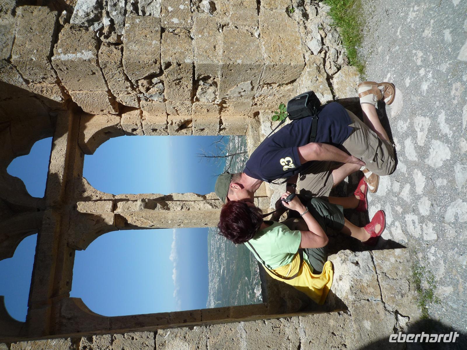 Endlich um halb neun erwartet uns Antonis, unser Reiseleiter für die Tage auf Zypern. Einige kennen ihn schon von unserem Treffen in Dresden und begrüßen sich herzlich. Heute erwartet uns ein großer, neuer Reisebus für unsere Erkundungen: auf in den türkisch besetzten Teil im Osten Zyperns. Die Fahrt dauert ca. 2 Stunden. Unterwegs erzählt Antonis viel über die Politik, die Teilung 1974 und die heutigen Zustände. Das alles birgt viel Diskussionsstoff für die nächsten Tage und natürlich auch Erinnerungen an unsere eigene Vergangenheit. Wir erreichen den Checkpoint, wo wir also die Demarkationslinie überqueren. Wir füllen ein kurzes einfaches Formular aus und gehen an die Grenzstation, um unseren Stempel zu bekommen. Das gesamte Prozedere dauert nur einige Minuten, denn heute ist nicht viel los an der Grenzstation. Unser erster Tageshöhepunkt ist die Besteigung der Märchenburg St. Hilarion: Nach dem Eintritt ins Felsenareal auf fast 700 Meter wechseln unsere Gefühle zwischen dem demütigen Streben nach den weitere hundert Meter höher gelegenen Burganlagen und dem erhabenen Überblick über die weit unter uns liegende Küstenlandschaft Nordzyperns. Mit der Ruhe - so Antonis - schaffen alle den Aufstieg und genießen den tollen Blick hinunter. Ziel ist das „Fenster der Königin“ mit herrlichem Ausblick, wo einst Richard Löwenherz seine Geliebte um seine Hand angehalten hat.