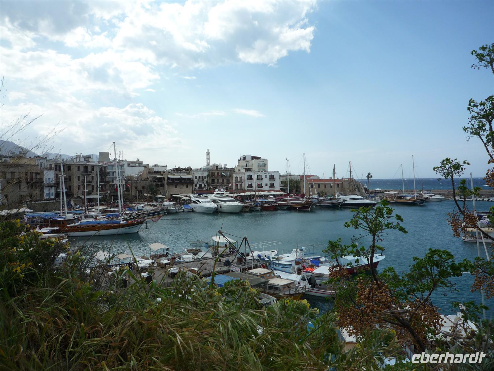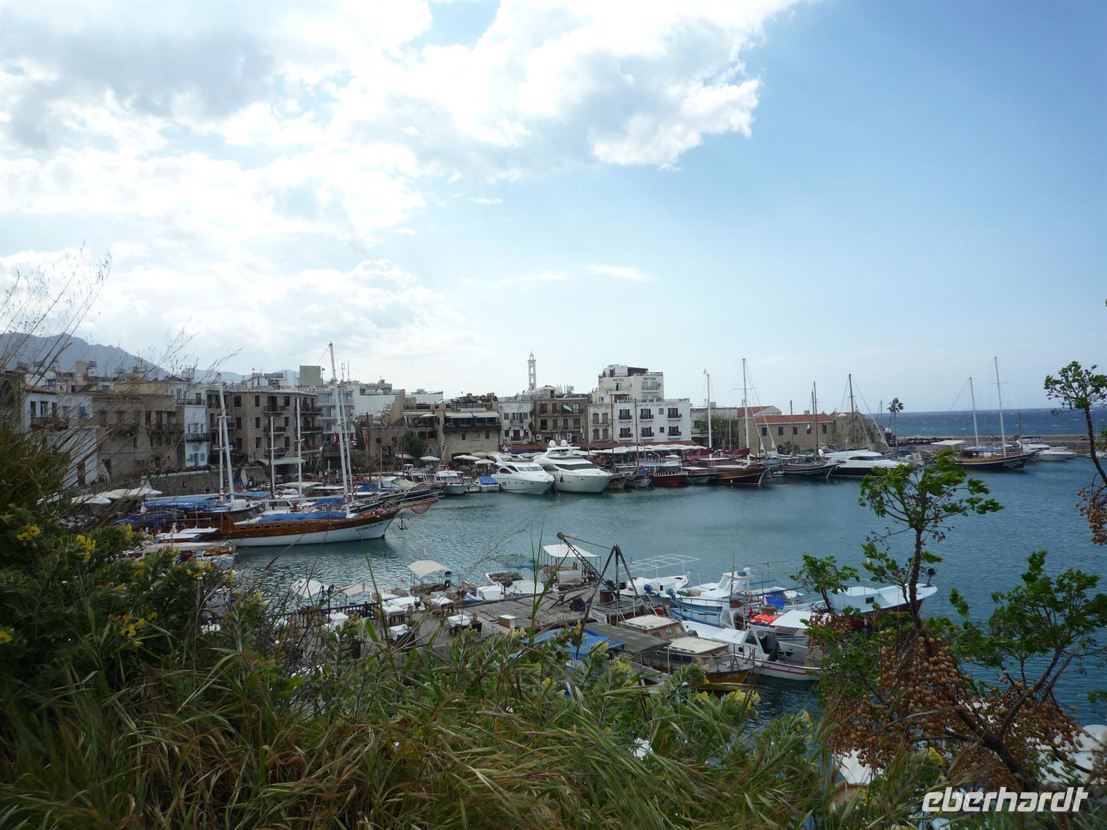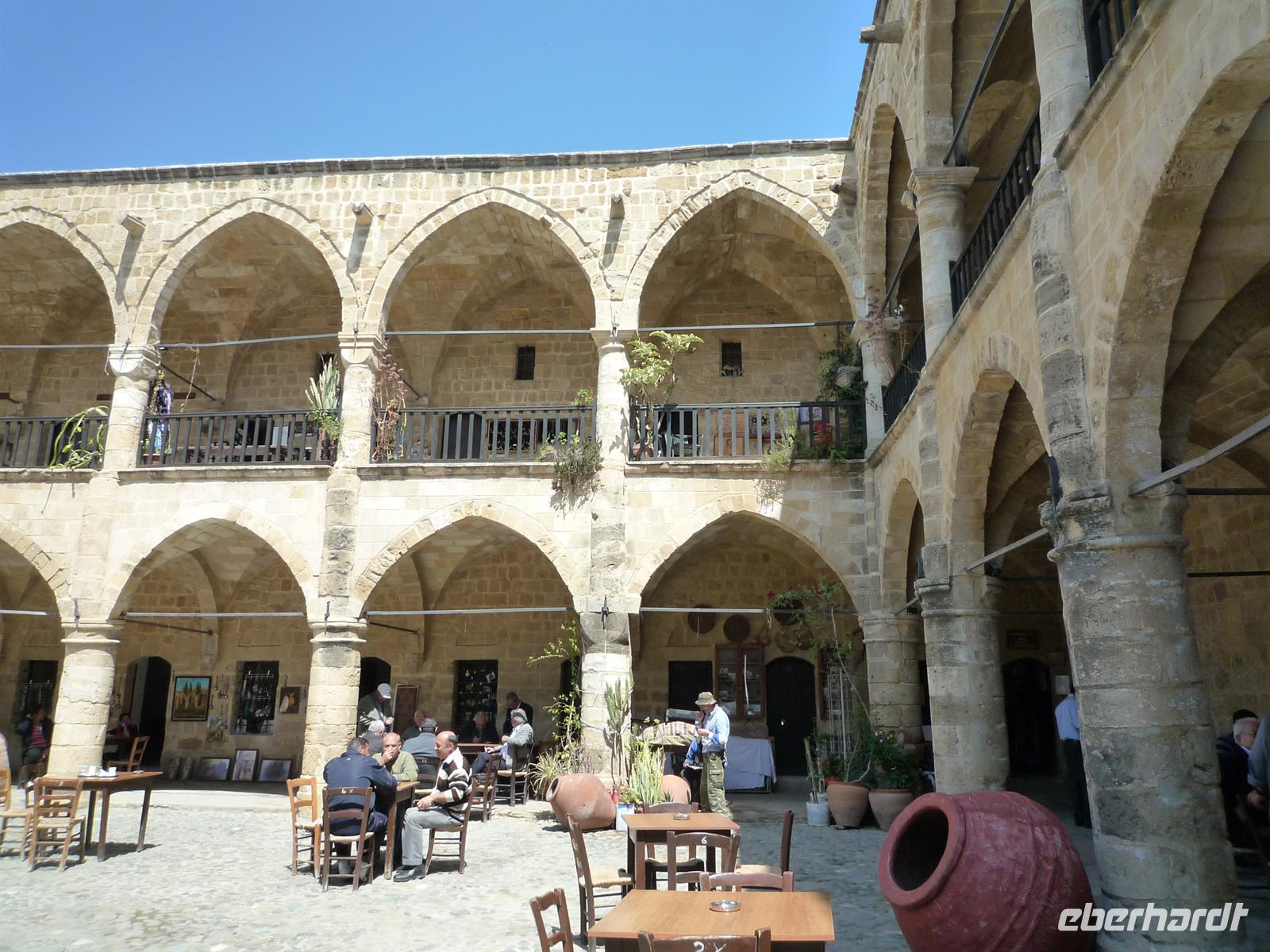 Antonis lässt einige Gäste diese Szene bildhaft darstellen. Einen romantischeren Platz kann man sich nicht vorstellen. Nach dem Abstieg erreichen wir mit dem Bus die alte Klosterruine Bellapais, das Mekka aller Zypernromantiker seit Erscheinen des Zypern-Romans „Bittere Limonen“ von Lawrence Durell. Nach einem Spaziergang durch das Dorf erreichen wir das Wohnhaus, was im Buch ausgebaut wurde und können uns nun mehr darunter vorstellen. Anschließend besichtigen wir das romantisch am Wasser gelegene Castell. Nach den vielen Eindrücken und Erklärungen von unserem Antonis haben wir uns eine stärkende Mittagspause im Restaurant direkt am Castell verdient. Die Klosterruine hält, was die Reiseführer und Dichter versprechen, beeindruckt mit phantastischer Lage, Kreuzrippenarchitektur und erhabener Größe. Anschließend zieht es uns buchstäblich zu Tale, ans Meer, in die mehr als 2000 Jahre alte Hafenstadt Kyrenia. Wir staunen über die gut erhaltene Hafenfestung, die schon im frühen Mittelalter entstanden ist, wundern uns aber nicht mehr darüber, als wir erfahren, dass sie bis vor wenigen Jahren noch als Garnison und Gefängnis in Betrieb war. Im Schiffswrack-Museum erfahren wir mehr über den Bau von Schiffen und lernen auch eine echte historische Person kennen. Eine Archäologin aus Amerika, die damals beim ersten Schiffsfund dabei war, ist heute hier noch mit der Restaurantion der Schiffe beschäftigt. Wir bewundern ihre Fotos an der Wand und staunen, dass Sie heute noch an diesem Projekt arbeitet. Anschließend erkunden wir das Leben im alten Hafen von Kyrenia mit alten und neuen Fischer- und Touristenbooten, Fischrestaurants und Souvenirläden.