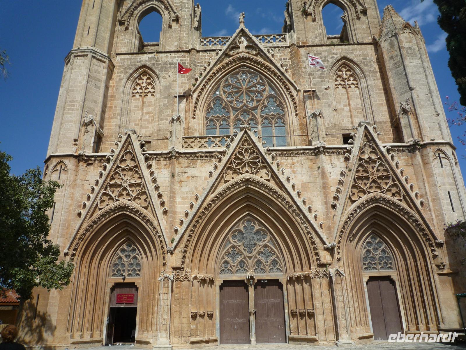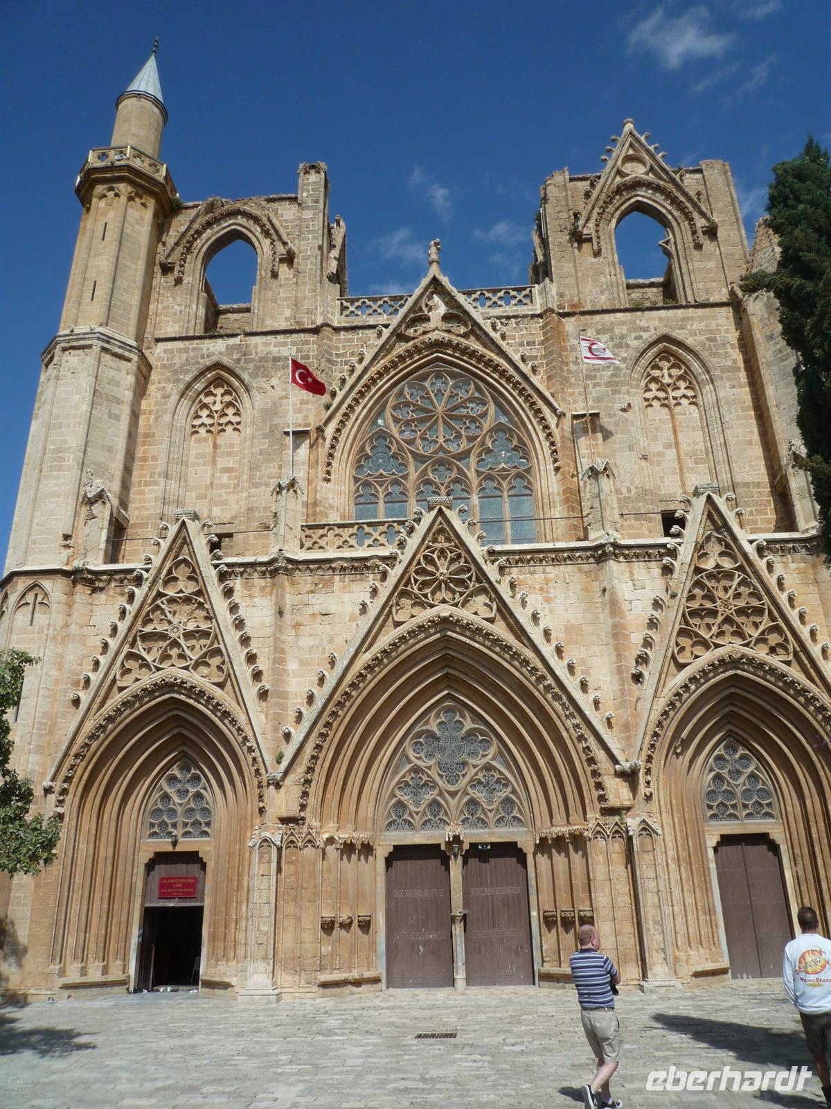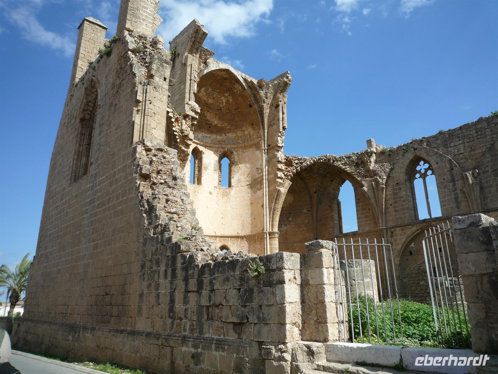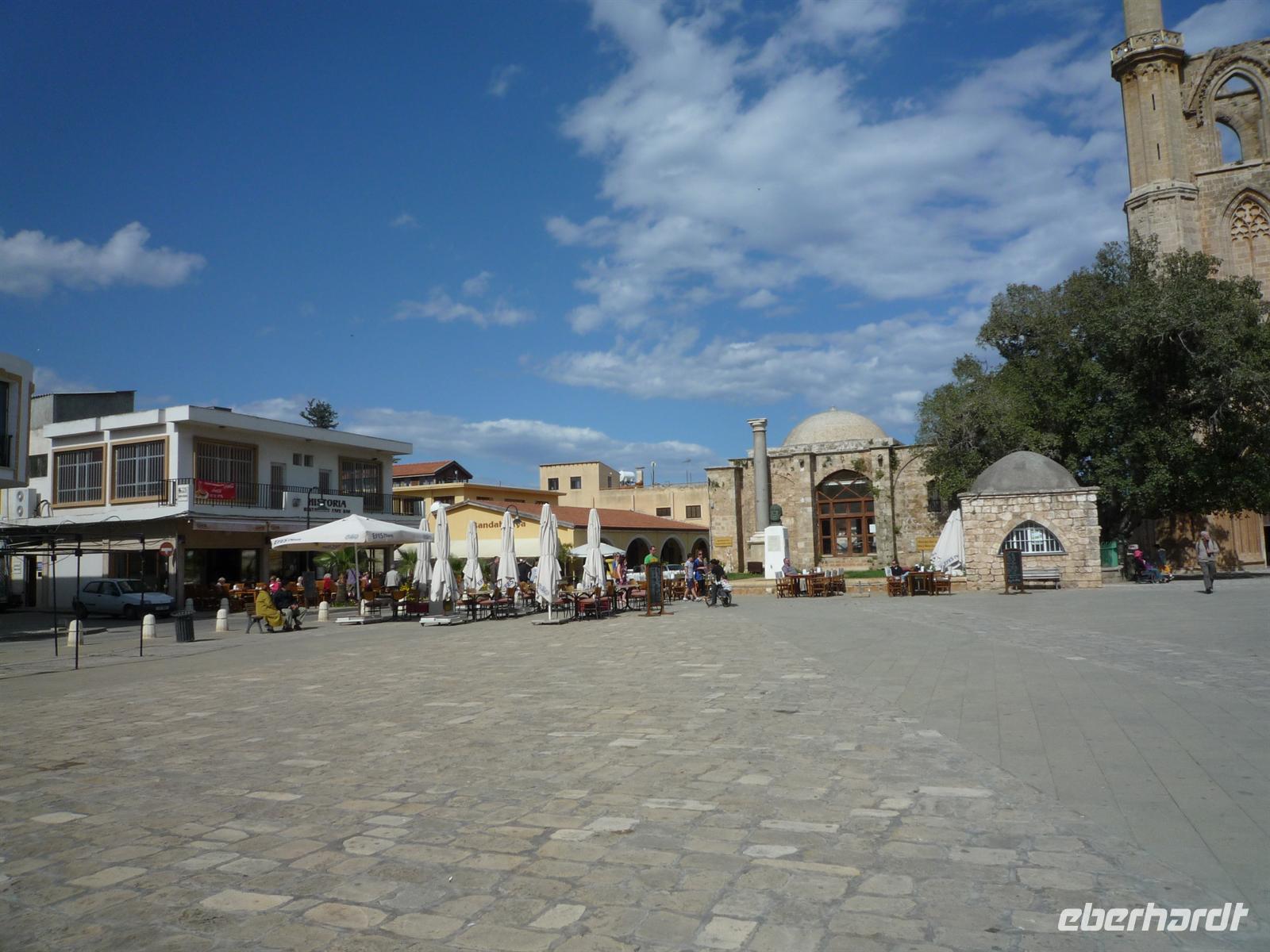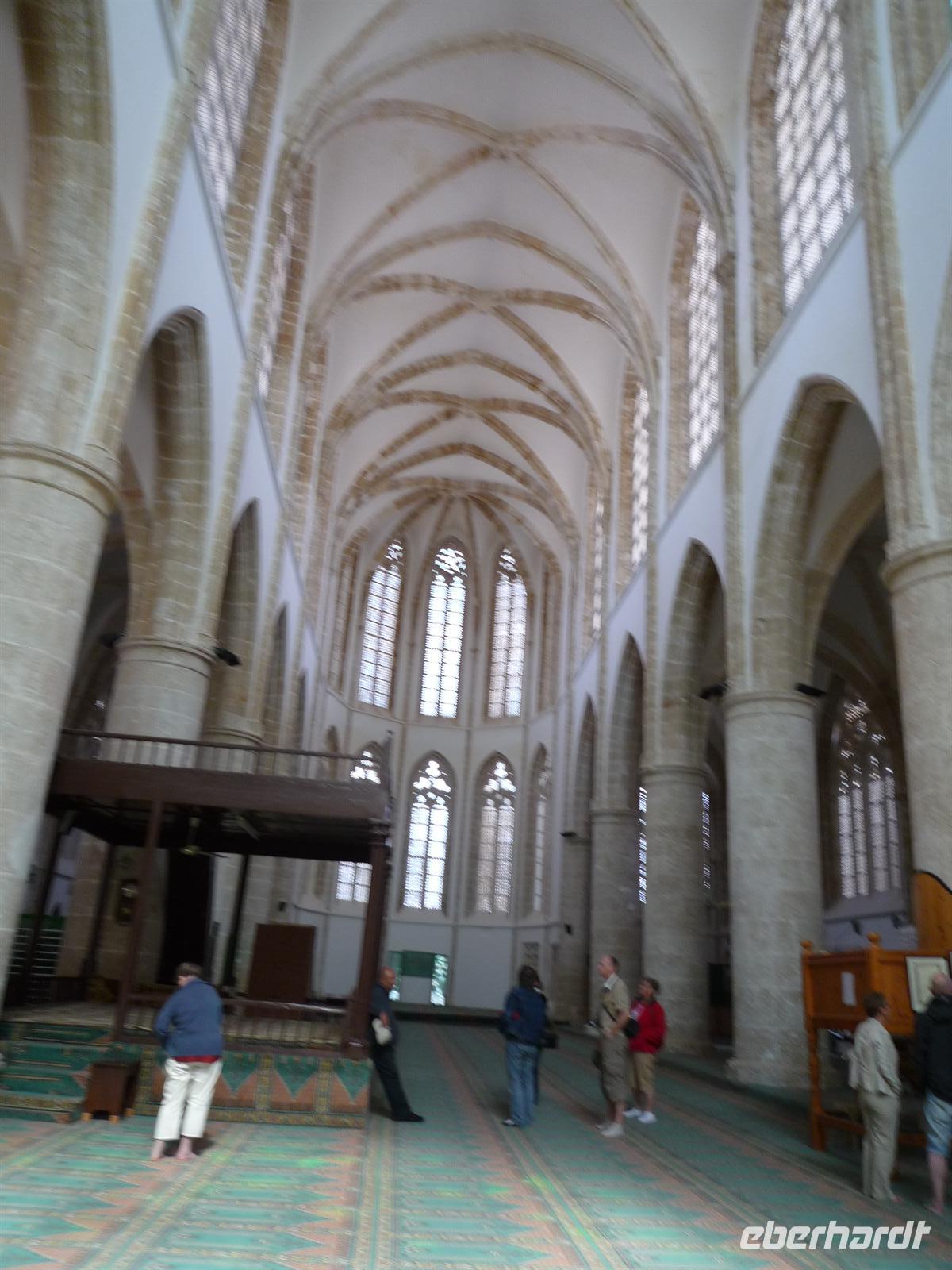 Anschließend fahren wir nach Famagusta, die ehemalige Touristenhochburg, deren heutiger Außenbezirk einer Geisterstadt ähnelt. Bei einem kleinen Stadtspaziergang erhalten wir einen Eindruck von der Altstadt, die schon immer türkisch besetzt ist. Wir besuchen die ehemalige Kathedrale St. Nikolaus, die zur Lala Mustafa Pascha-Moschee umgebaut wurde und Antonis erklärt uns einiges über den Islam. Anschließend fahren wir mit dem Bus entlang des äußeren Stadtteils, der früher von griechisch-Zyprioten besetzt war. Heute gleicht diese Stadt einer Geisterstadt, die Bürgersteige sind zugewachsen, die Fenster und Türen fehlen. Wir sind wirklich erschrocken, wie solche Ruinen hier stehen und viele ehemalige Einwohner noch heute Ihre Wohnhäuser so stehen sehen müssen.