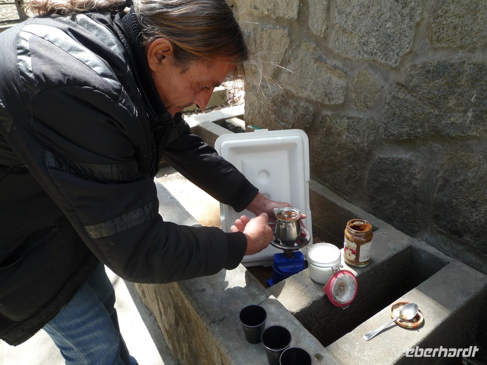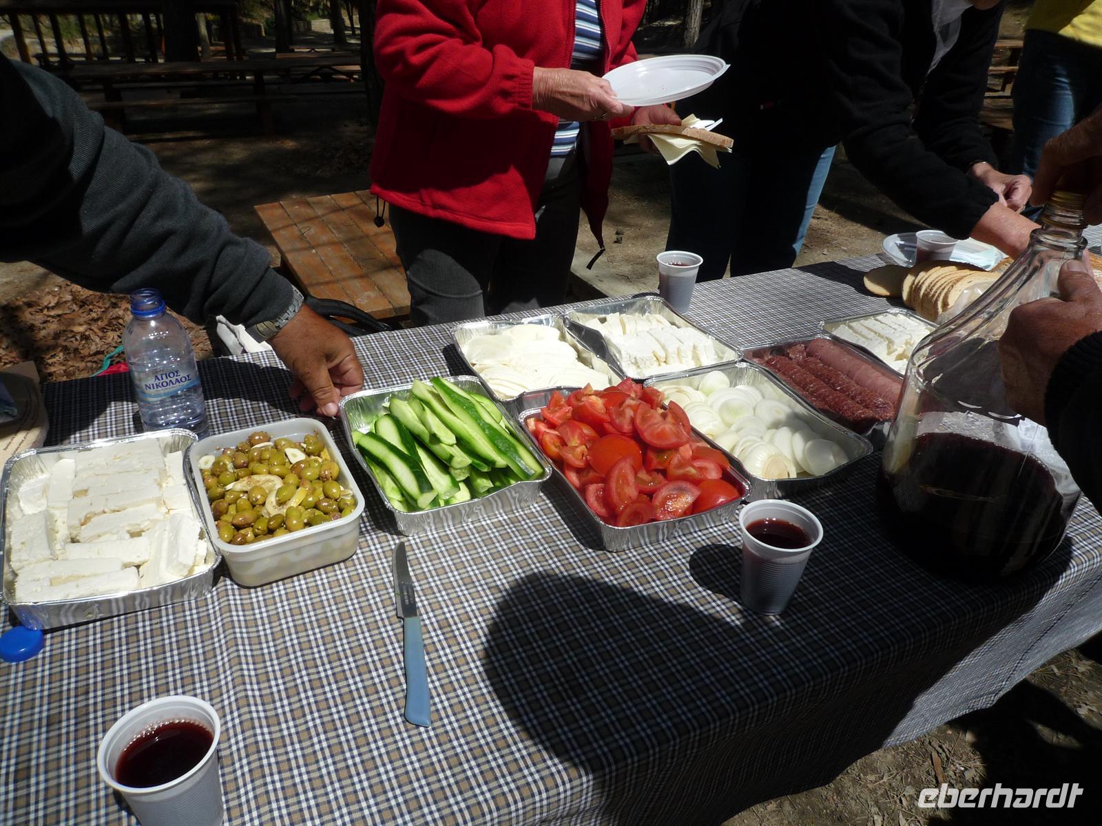 Anschließend genießen wir ein zauberhaft von Antonis vorbereitetes Picknick. Es gibt frisches Brot mit Wurst, Käse und viel Gemüse wir Tomaten, Gurken, Zwiebeln und speziell gewürzten Oliven. Dazu gibt es Rotwein, einen Schnaps und unser Busfahrer kocht uns mit einem kleinen Brenner Kaffee.
