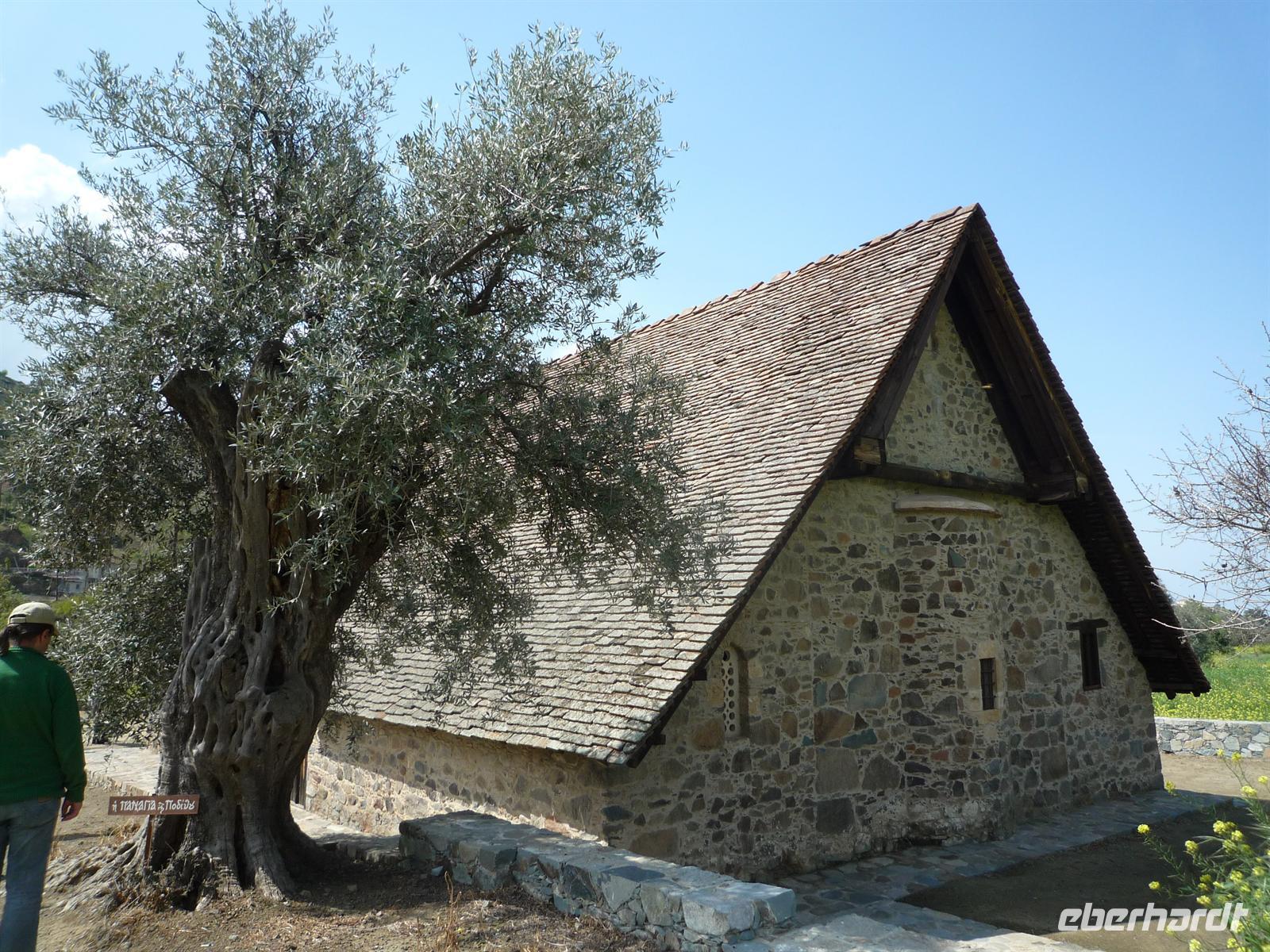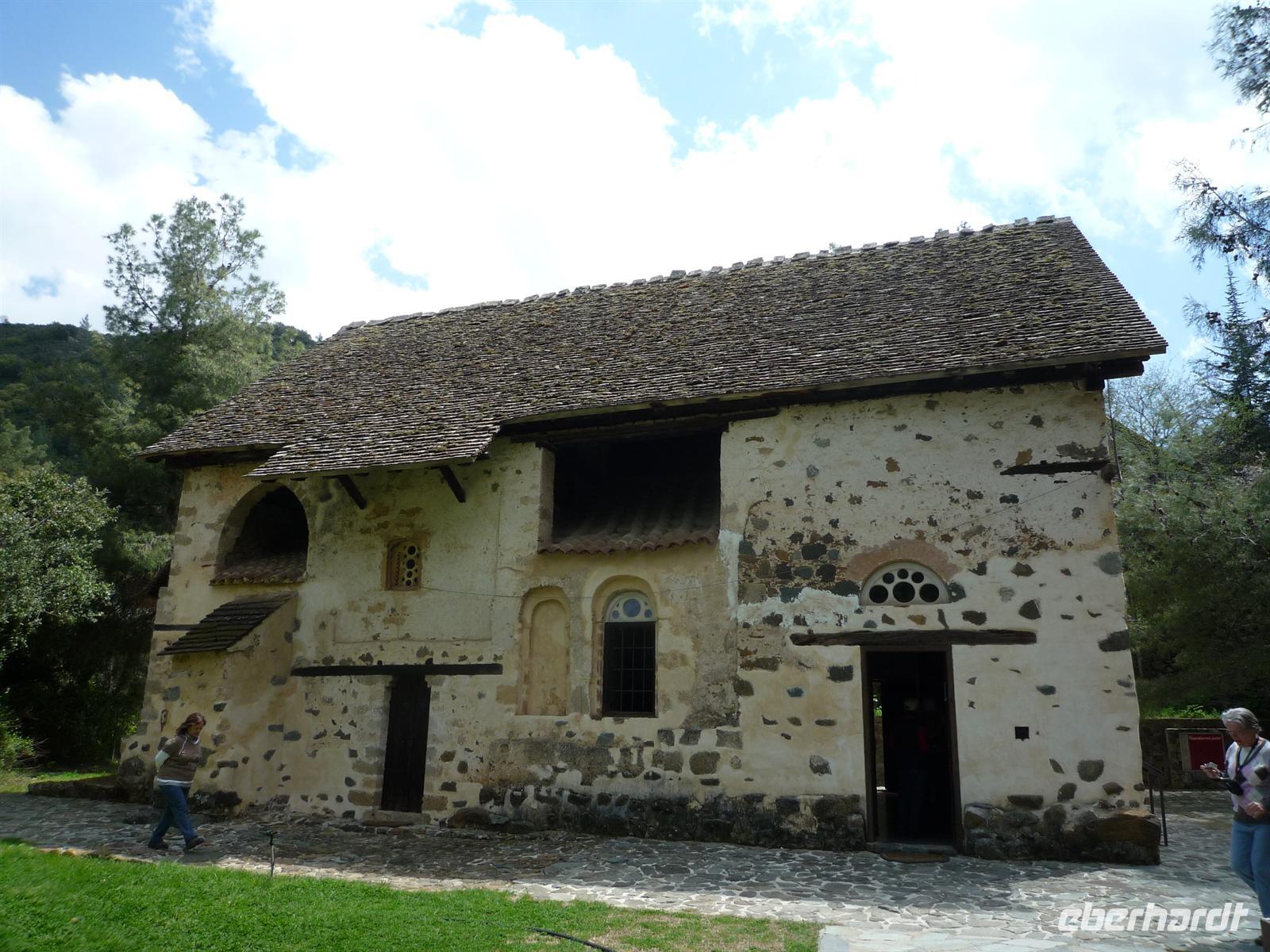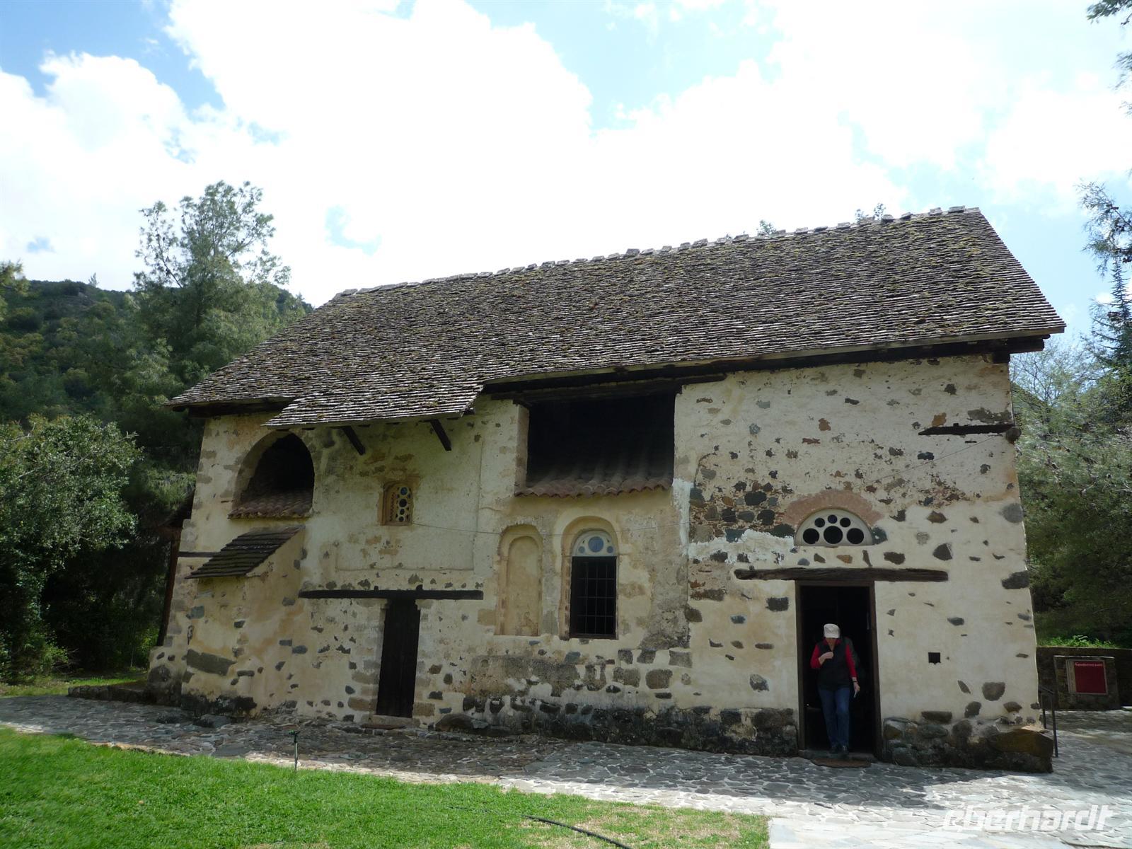 Höhepunkte des Tages sind die Besichtigungen dreier Scheunendachkirchen, die unter UNESCO-Weltkulturerbe-Schutz stehen. Anscheinend waren Scheunendächer aufgrund der Witterungsbedingungen in Gebirgslage geeigneter, die Gotteshäuser - zum Beispiel vor den Schneelasten - zu schützen. Oder sollten sie nur wie normale Scheunen aussehen, um nicht feindliche Plünderer anzulocken? Die Kirche des Heiligen Nikolaus vom Dach (Agios Nikolaos tis Stegis) verbirgt unter dem schlichten Scheunendach eine Kirche mit kreuzförmigem Grundriss und Kuppelgewölbe. Die bei Kakopetria nahe beieinanderliegenden Scheunendachkirchen Panagio Poditou und Erzengel-Michael-Kirche haben einfache Grundrisse, zeichnen sich aber durch kunstvolle und teilweise für die Ikonographie untypische ausdrucksstarke Individalität der Figuren aus.
