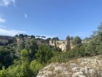 Wir laufen durch die Gravinaschlucht und im Hintergrund ist MateraUnsere Reisegruppe beim Bummel durch PeschiciBalkon in BariKopf an einer Säule des Castell del Monte Blick auf die Krone ApuliensKleiner Grashüpfer in einer Mohnblume, Gargano