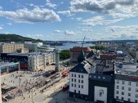 Frühstück mit Blick auf BryggeHotelzimmerBeginn der Zugfahrt mit der BergensbanenFram-MuseumBlick auf Bergen aus dem FlugzeugVigelandpark