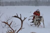 Schneeschuhrennen - kein Scherz!Schneemobilfahrt in den Lyngen-AlpenDie samische Flagge - das Symbol der Samischen Nation aus dem Jahr 1986Schneemobilfahrt in den Lyngen-AlpenPräsentation der Renn-RentiereNordlicht-Dinnercruise