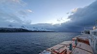Treffen mit Expeditionsteam auf Deck 9Garnelen Verkostung Traena, Kirche Unsere Kapitänin seit Longyerabyen Tromsö,  Polaria MS Trollfjord,  Deck 9...was gibt's da ?