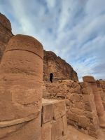 Die Wege zur Taufstelle sind angenehm, denn es ist sehr heiß. Ein Wunderwerk des Festungsbaus, für das die rückständigen Christen eigentlich nicht bekannt waren.SchubkarrenballetDas sehr gut gemachte Petra Museum stellt einen der Elefantenköpfe aus, die die Kapitelle des Großen Tempels geschmückt haben. Die großen Ohren sind am Kapitell zurückgeblieben.Man kann zur Quelle auch hochlaufen. Doch uns Petra-Erprobte lässt das kalt.Hinter dem Platz werden Erfrischungen gereicht bei grandiosem Ausblick.